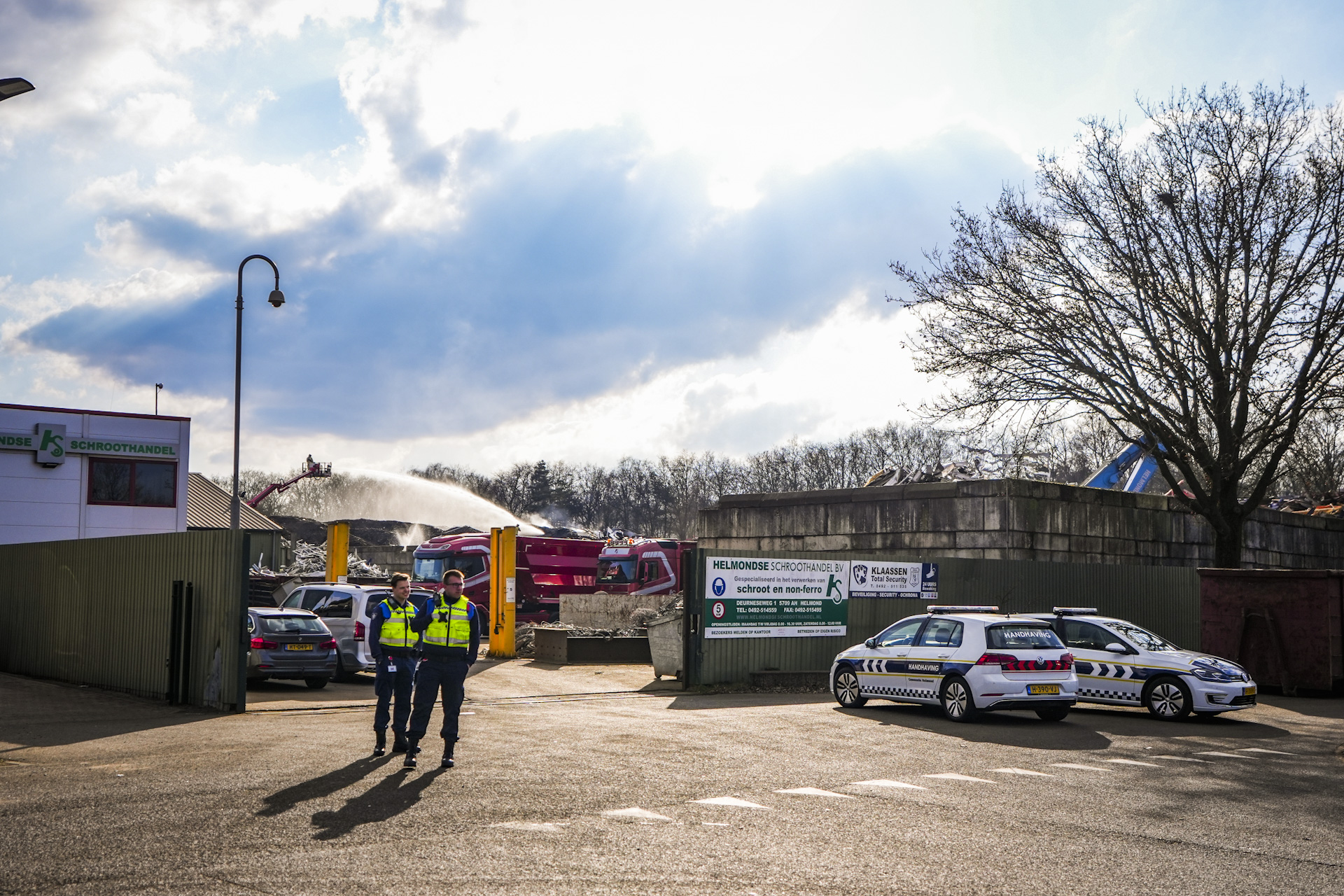 De brand ontstond in een berg metaalafval, vermoedelijk door broei. De brandweer is met een hoogwerker, waterwagen en meerdere blusvoertuigen bezig met blussen.