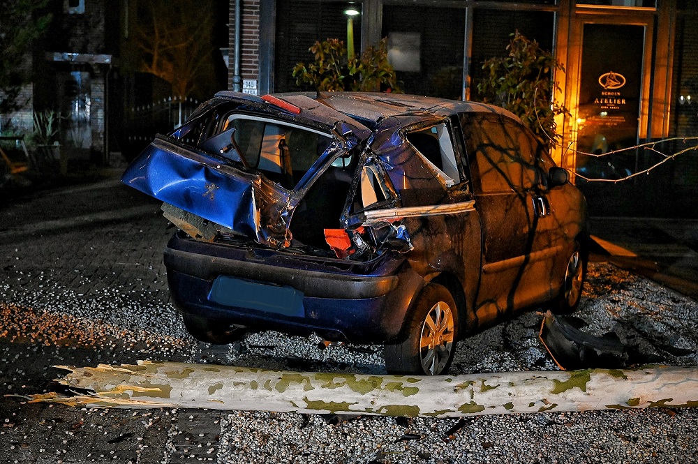 De bestuurder botste tegen een muur, reed een boom omver, raakte een geparkeerde auto en een reclamebord, en kwam uiteindelijk tegen een boom tot stilstand.