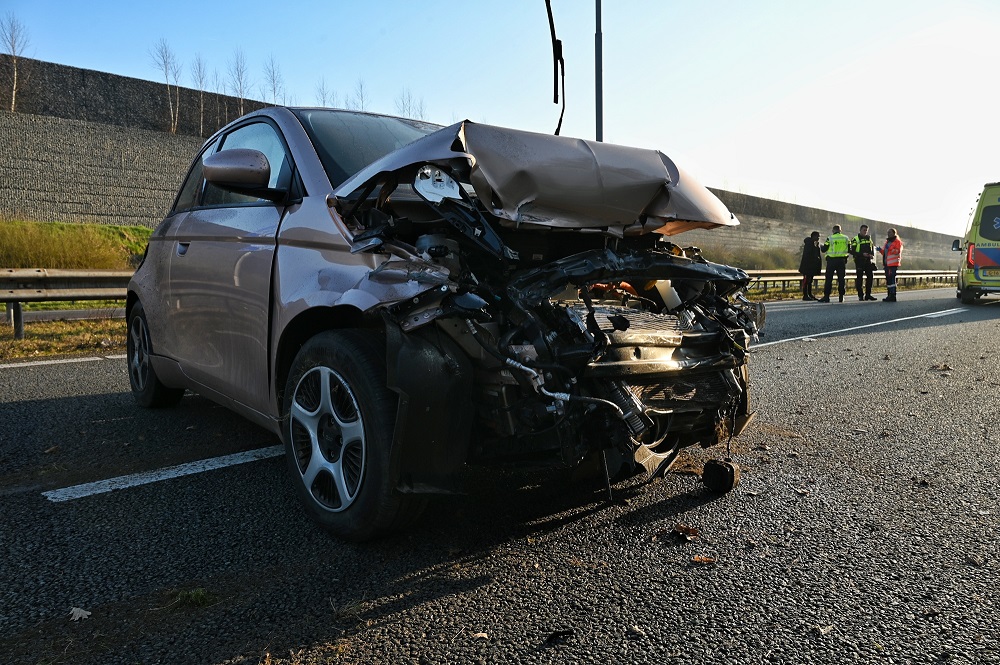 Team Verkeer onderzoekt het ongeval. Twee rijstroken zijn afgesloten, verkeer passeert via de vluchtstrook.