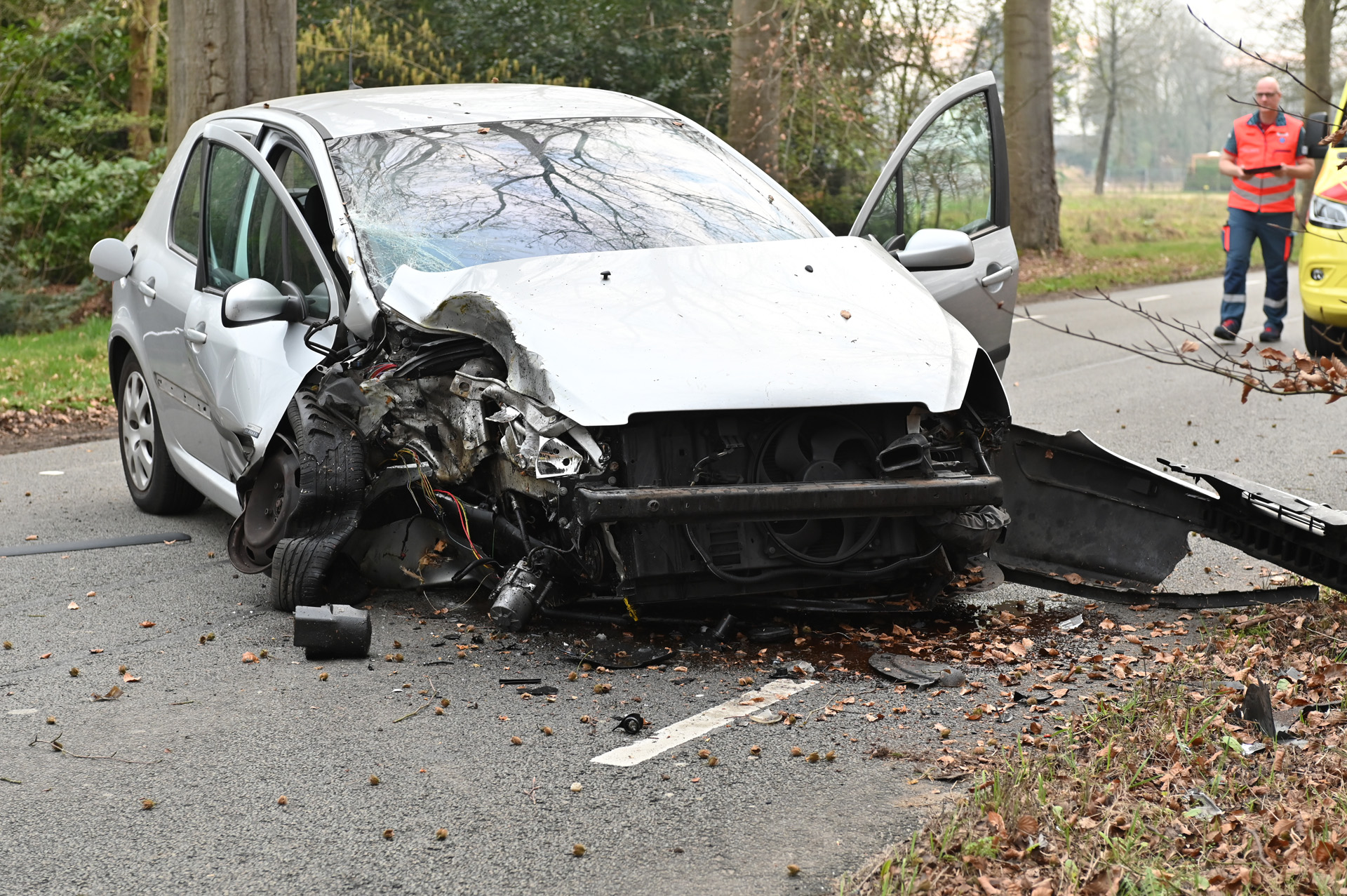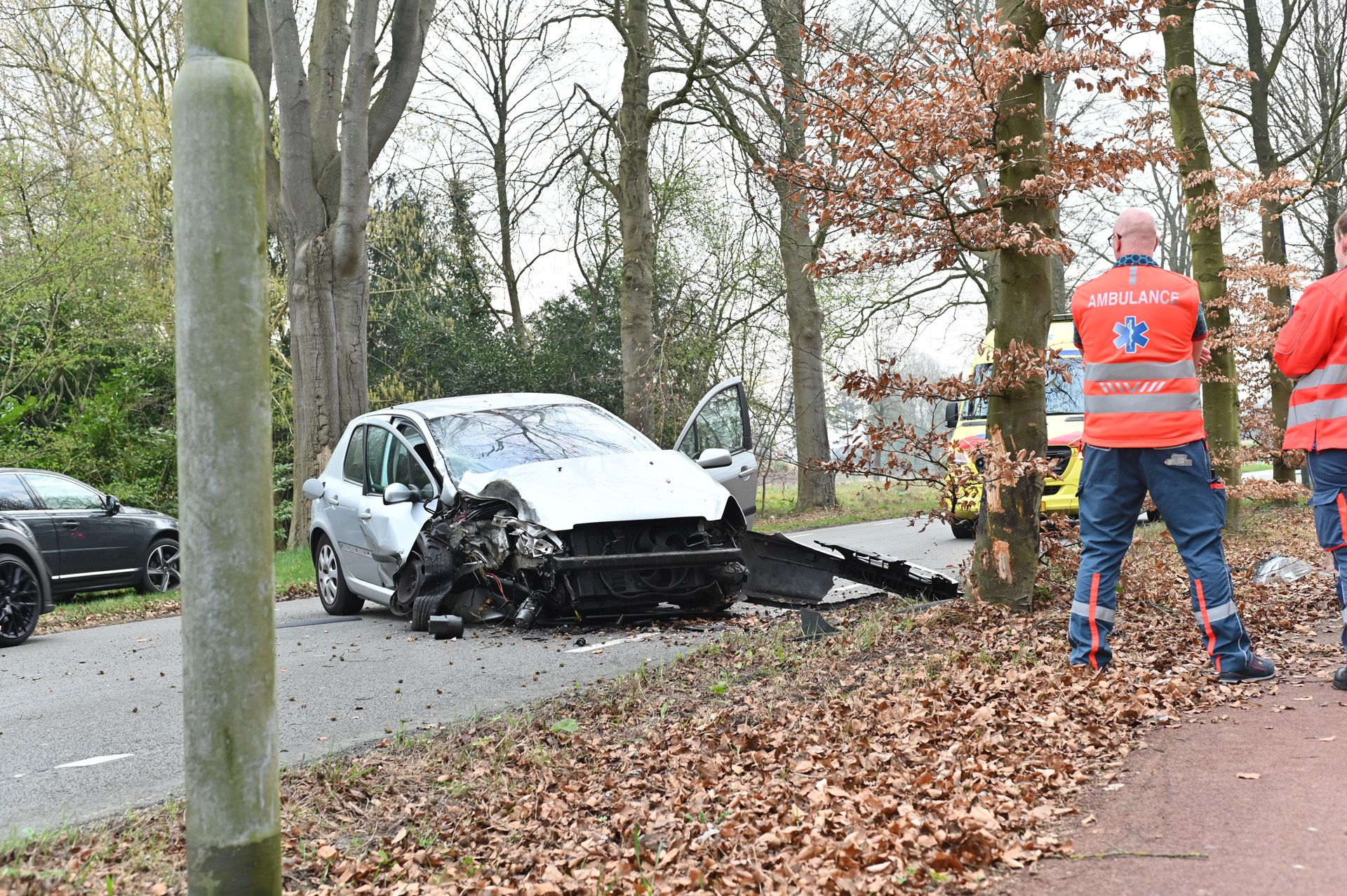 Auto botst tegen boom, bestuurder in ambulance behandeld