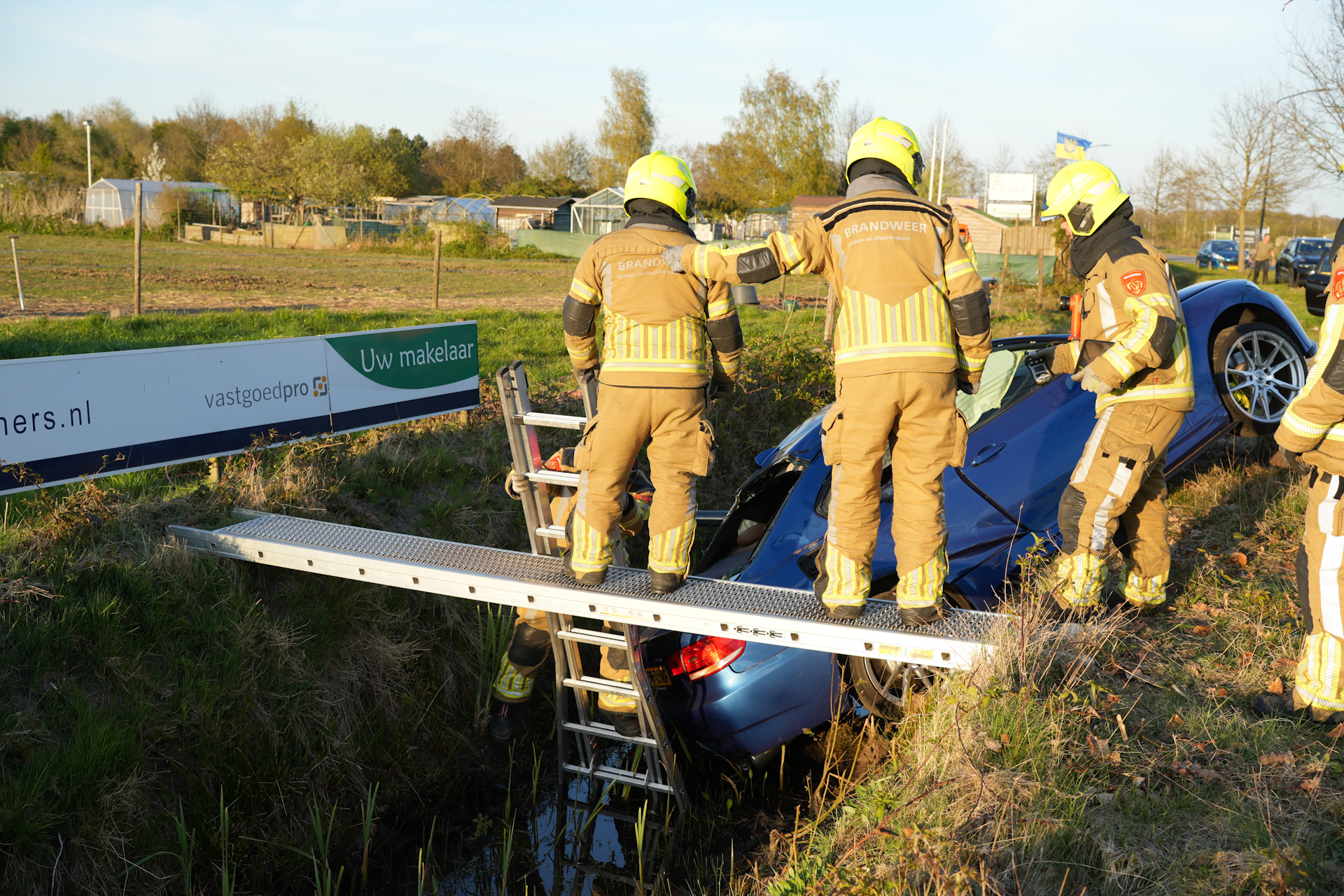 De bestuurder raakte gewond en is in een vacuümmatras per ambulance naar het ziekenhuis vervoerd. De brandweer kwam ter plaatse om het voertuig veilig te stellen en de accu los te koppelen. Een takelbedrijf heeft de zwaar beschadigde auto uit de sloot gehaald; vermoedelijk is het voertuig total loss.