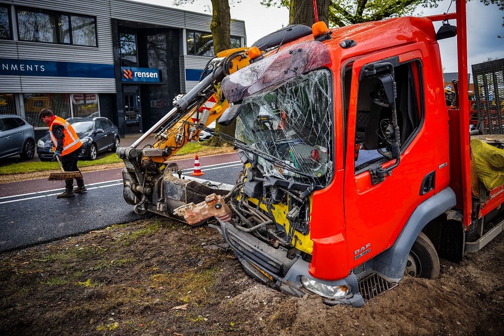 Vrachtwagen zwaar beschadigd door botsing tegen bomen