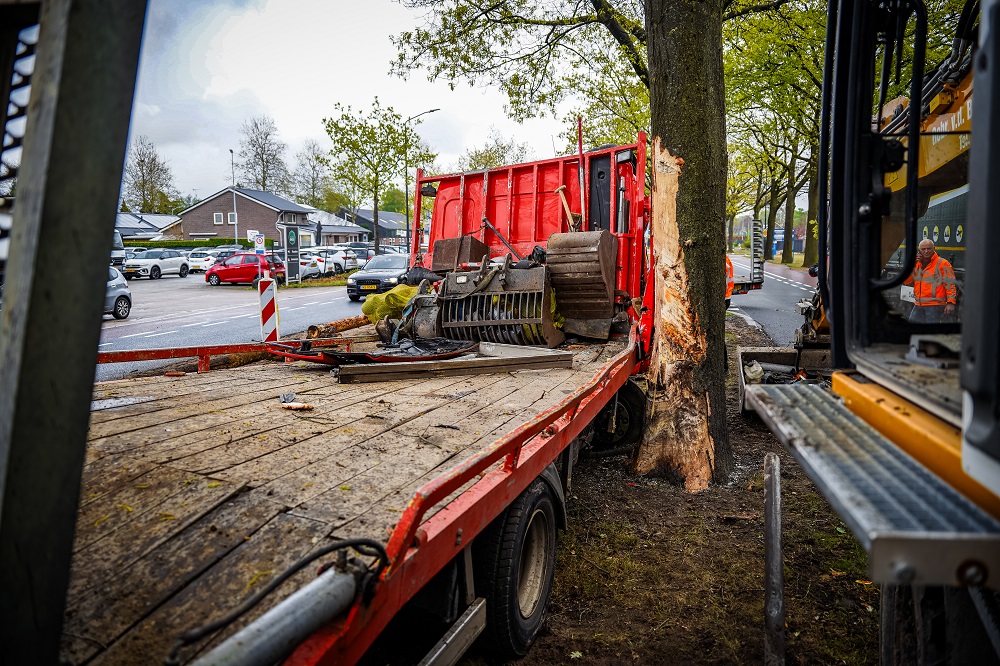 De weg is deels afgesloten en verkeer wordt via het fietspad omgeleid. De lading, bestaande uit machines, is met een graafmachine overgeladen. De berging van het diep weggezakte voertuig wordt een flinke uitdaging.