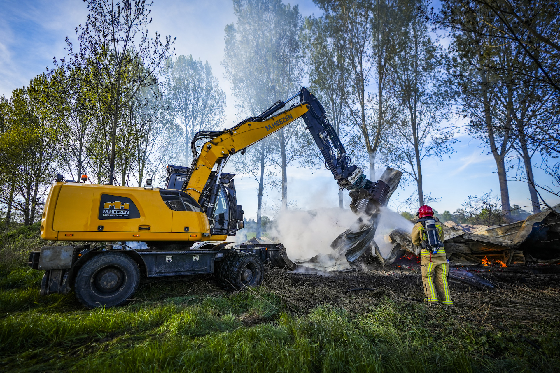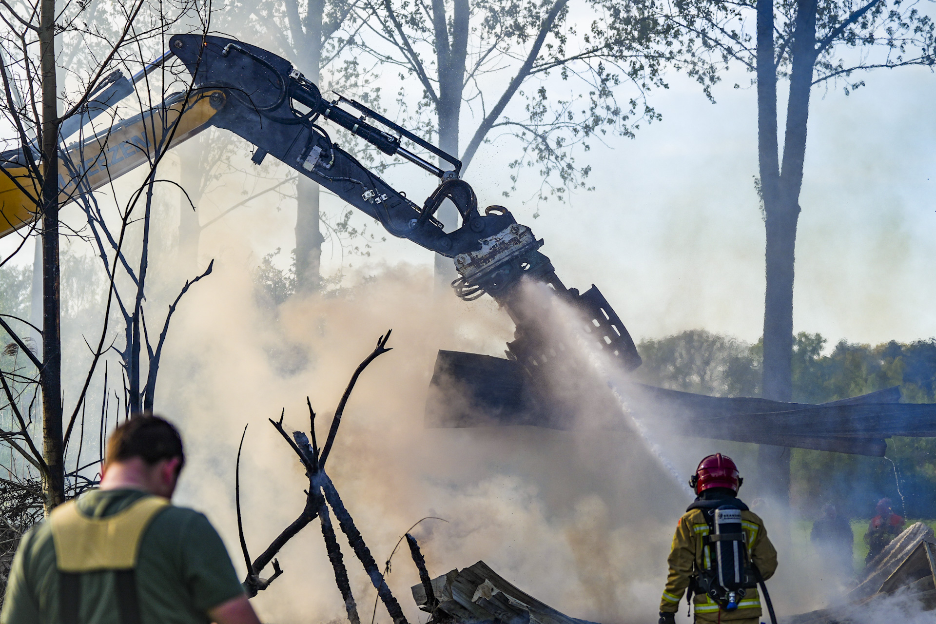 Van de schuur is weinig overgebleven. Een kraan is ter plaatse om het ingestorte dak te verwijderen, zodat de brandende resten daaronder geblust kunnen worden.