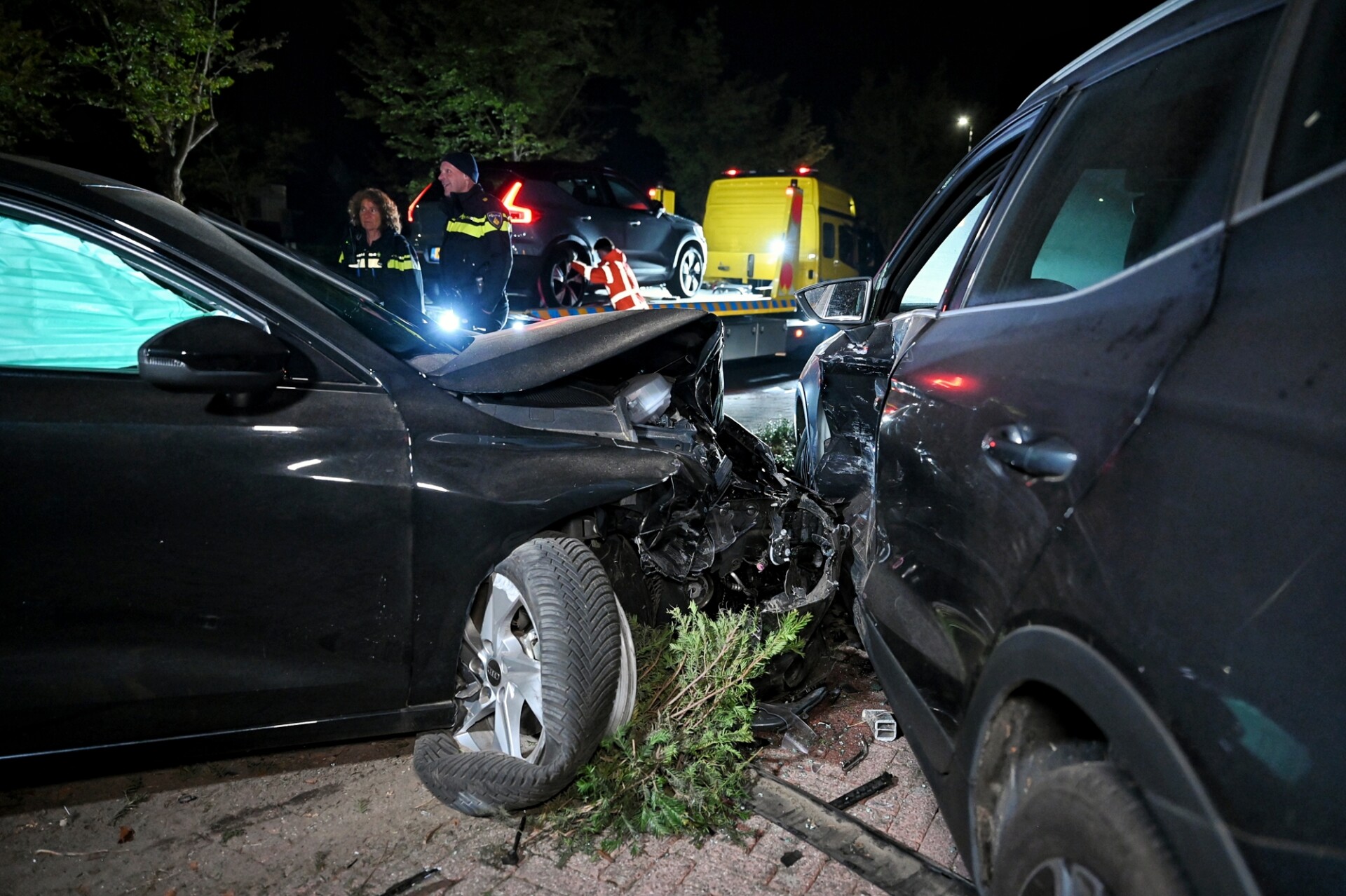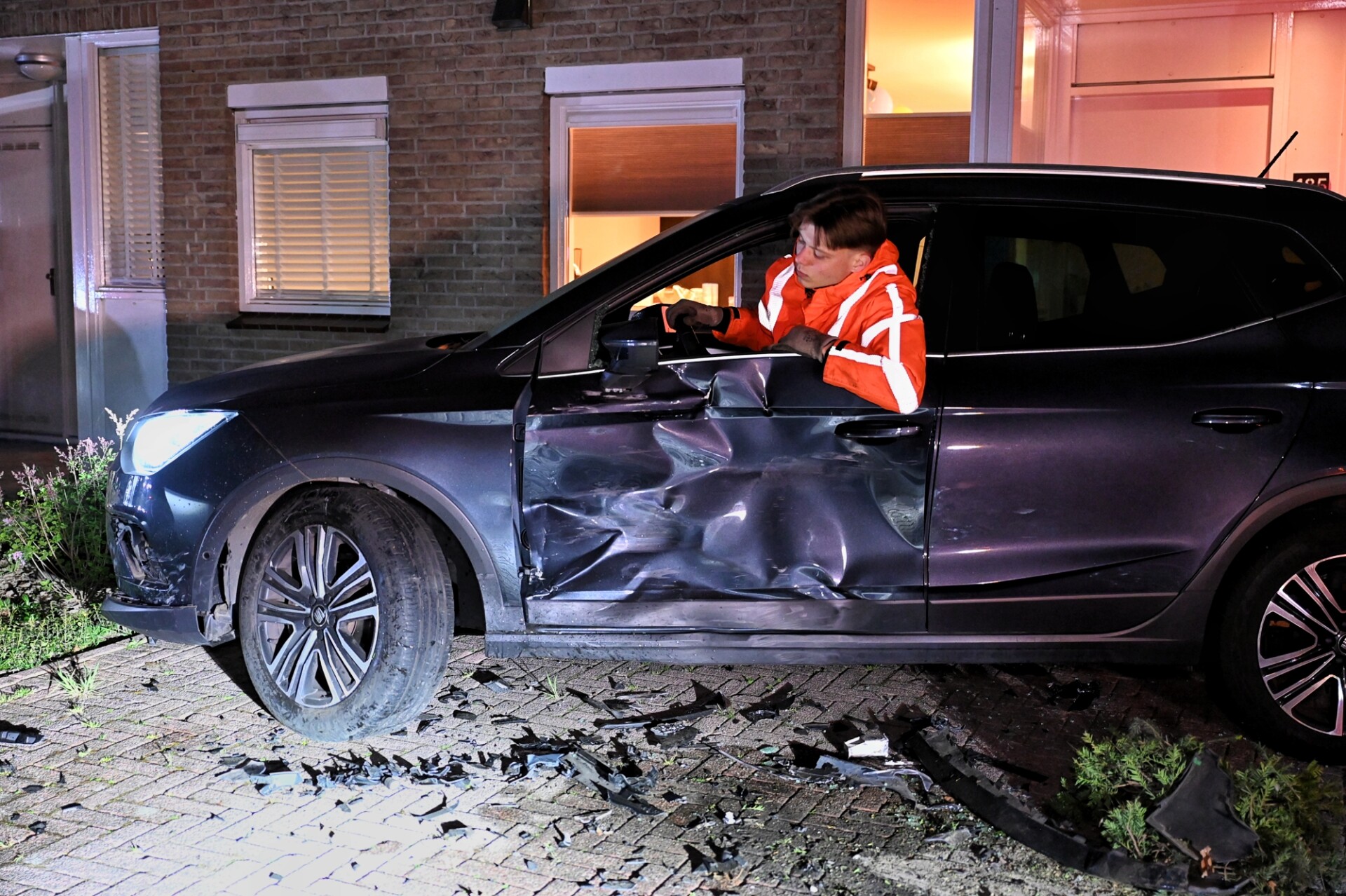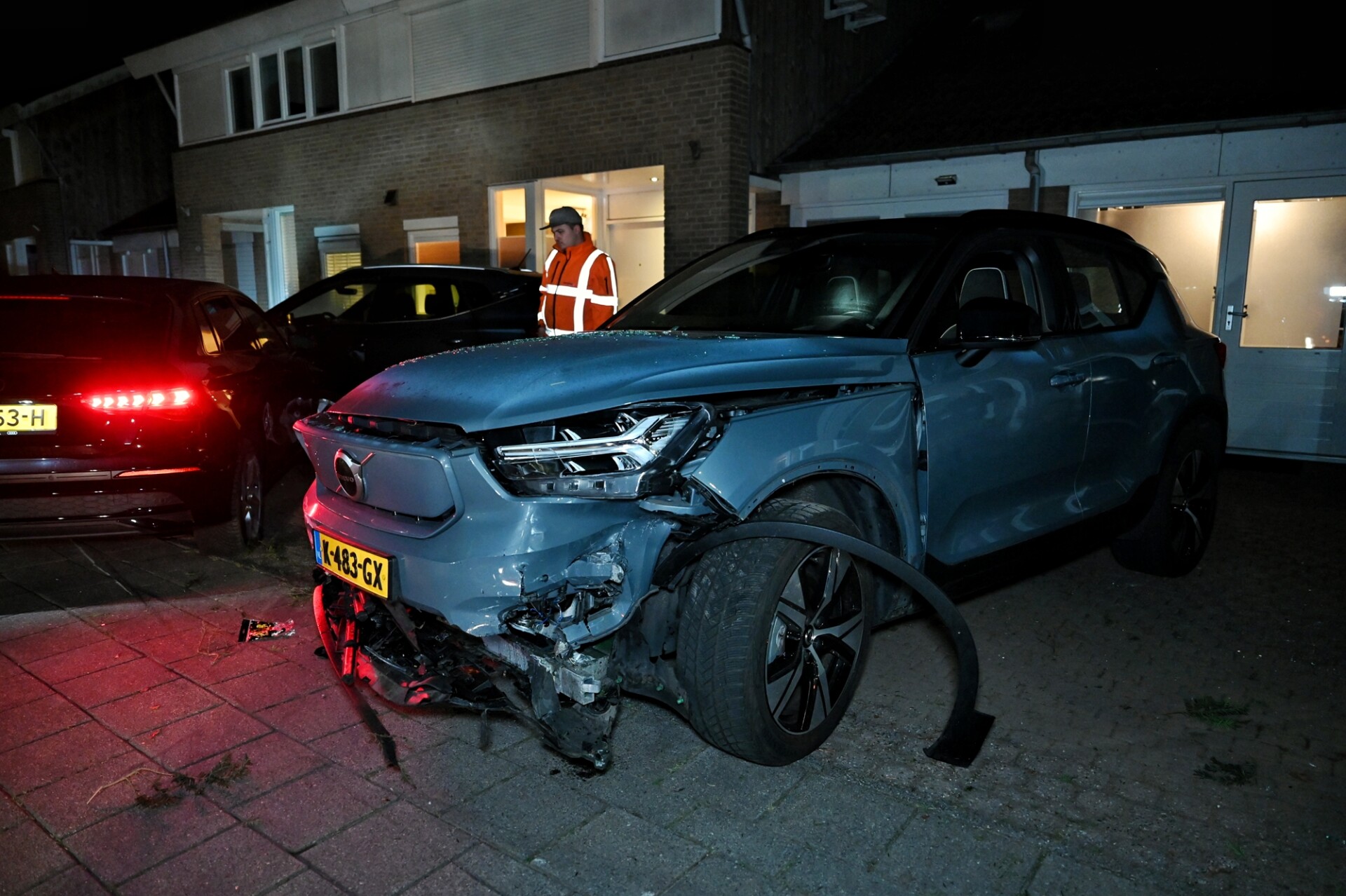 Volgens een getuige gebeurde dit met hoge snelheid. Twee inzittenden, beide mannen, stapten na de botsing uit, haalden spullen uit de auto en sloegen op de vlucht. De politie kwam met meerdere eenheden ter plaatse en is direct een zoektocht gestart. Vooralsnog is er niemand aangehouden.