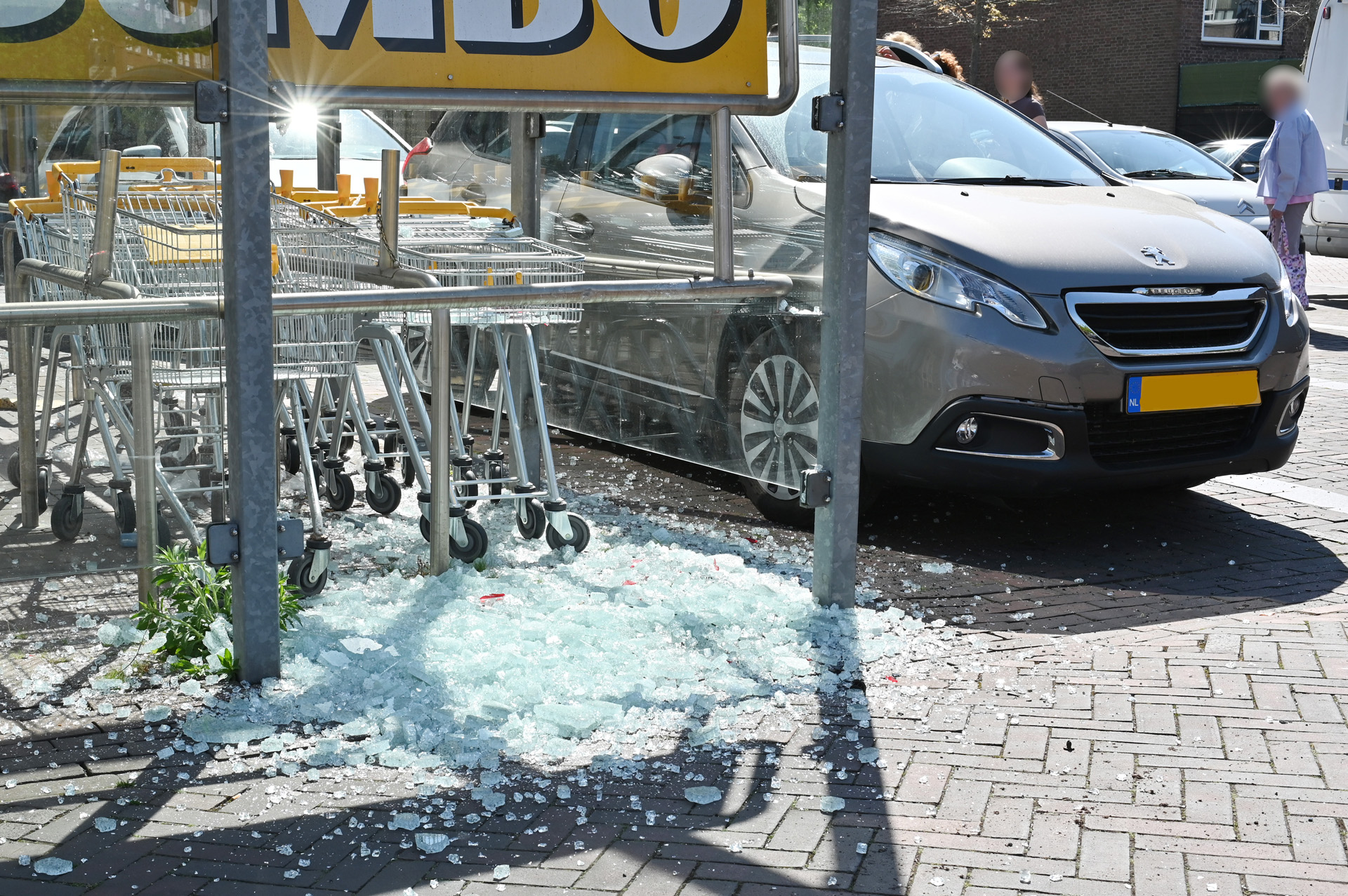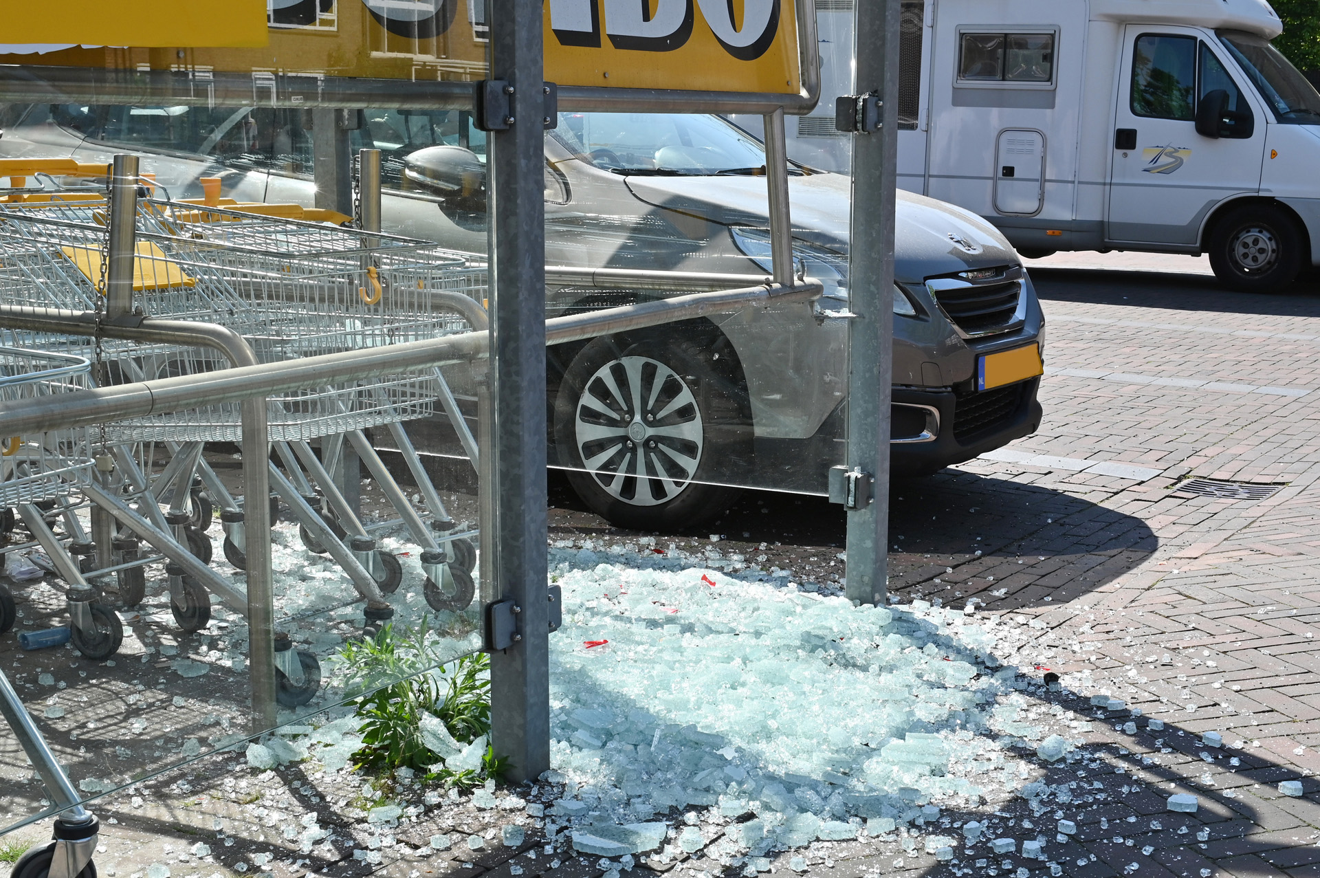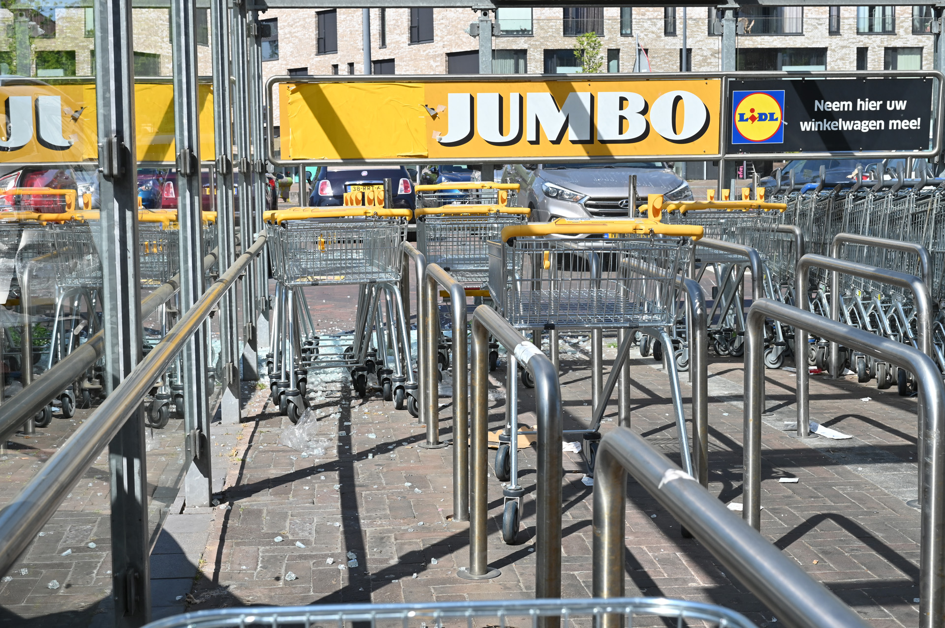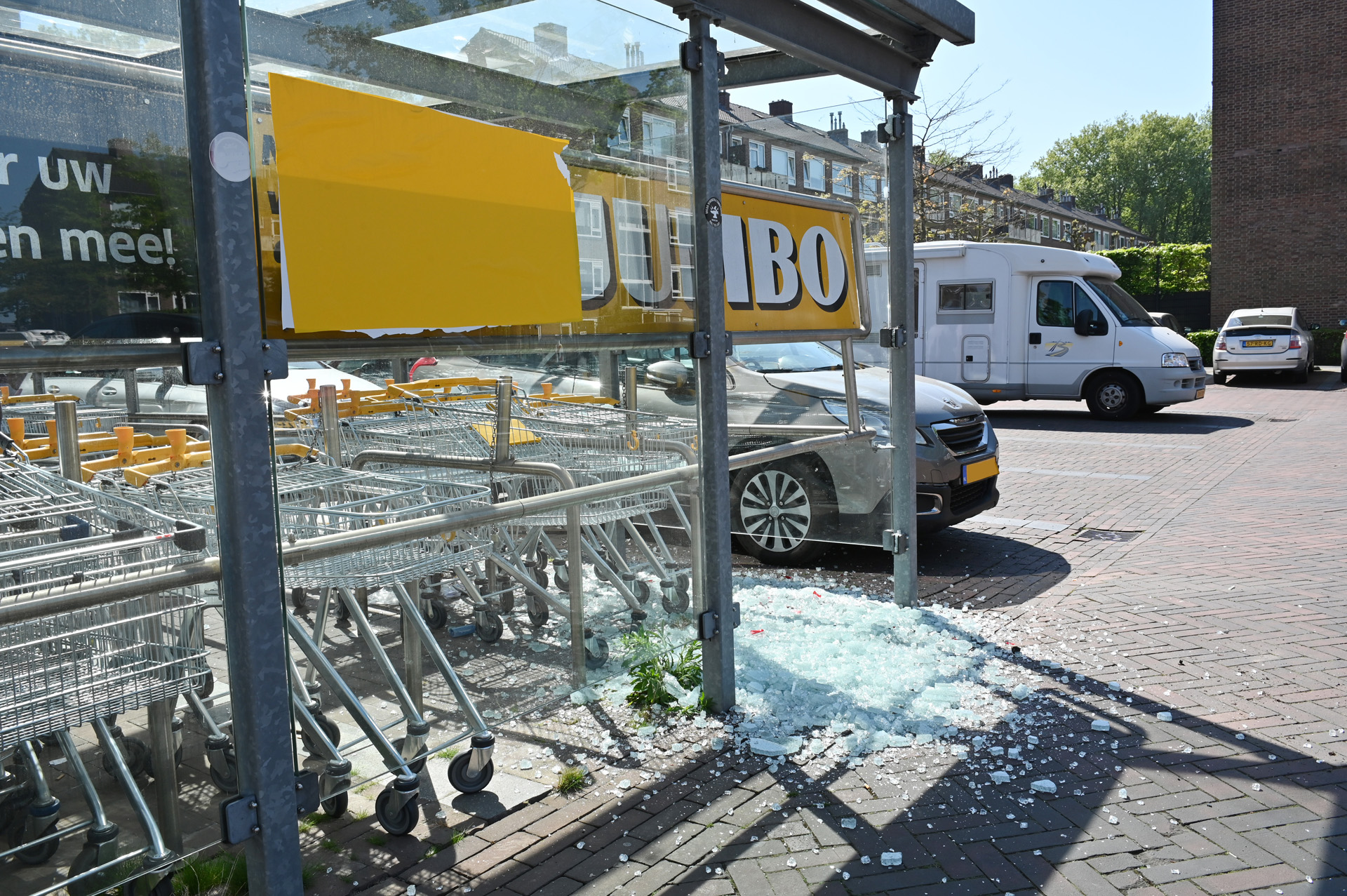 Auto rijd door glazenhok van winkelkarretjes Jumbo