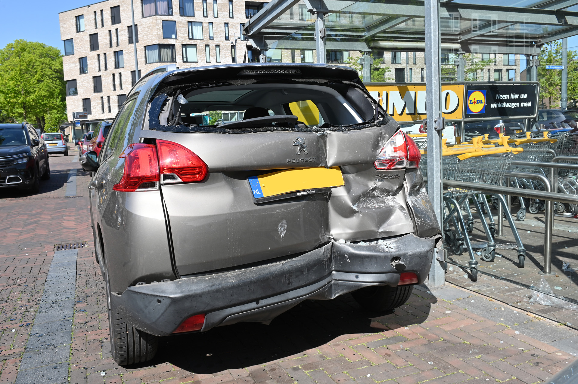 Hierdoor schoot ze rechtdoor en botste met een andere auto. Van schrik zette ze de auto in zijn achteruit en reed toen het glazen hok van de Jumbo in. Haar auto raakte flink beschadigt. Het glas lag overal rondom het hok verspreid.
