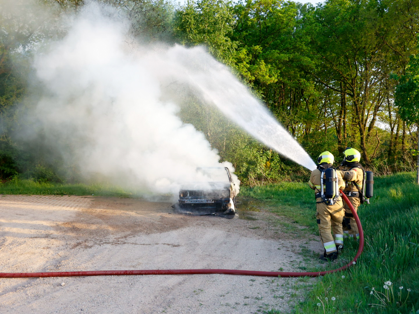 Het voertuig stond geparkeerd in een bosgebied en stond bij aankomst van de brandweer al volledig in lichterlaaie. De eigenaren hoorden tijdens een wandeling met hun hond een harde knal, waarna zij ontdekten dat hun auto in brand stond.
