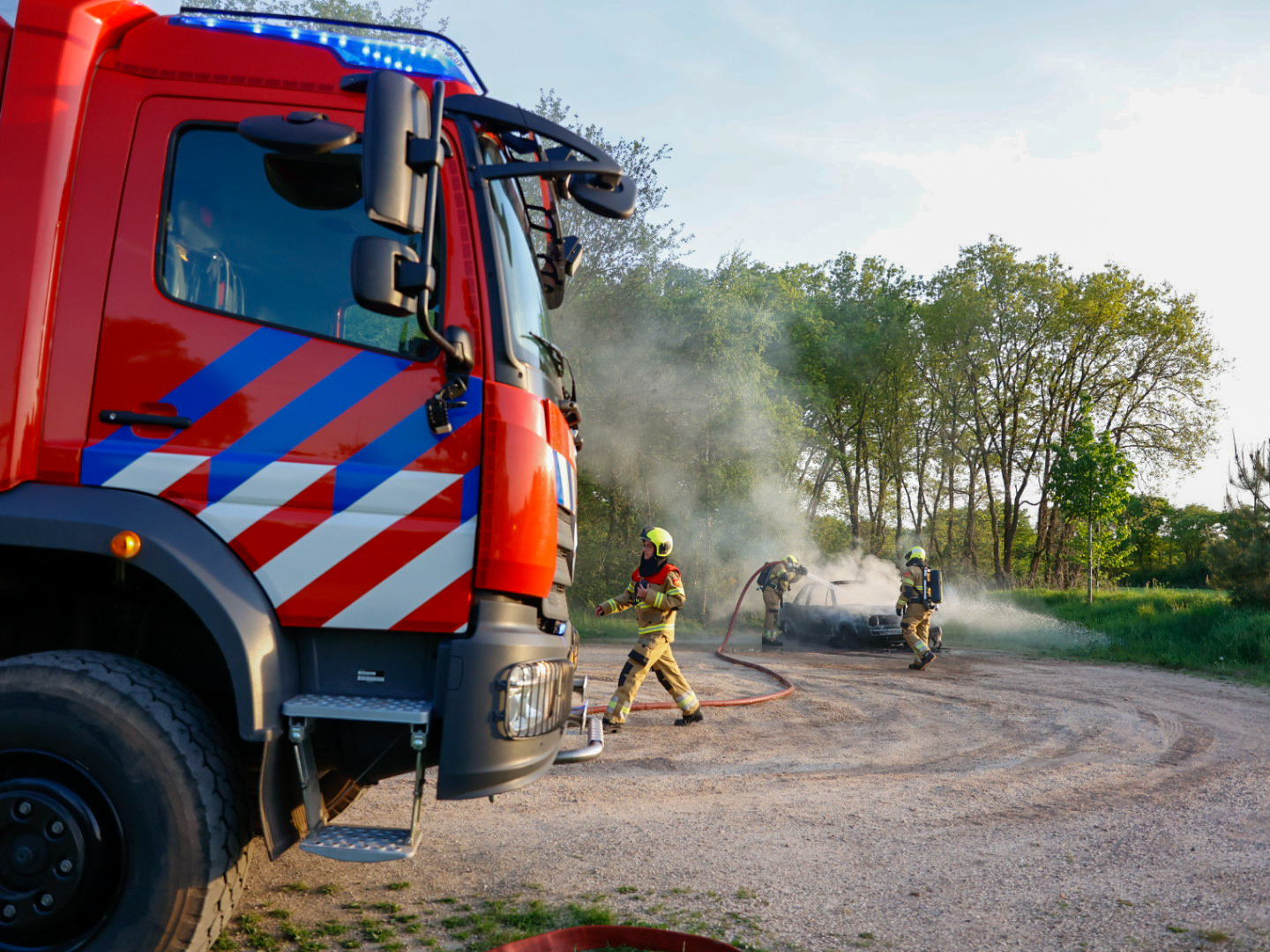 De brandweer bluste het vuur met een hoge drukstraal. De auto is total loss en zal door een bergingsbedrijf worden afgevoerd.