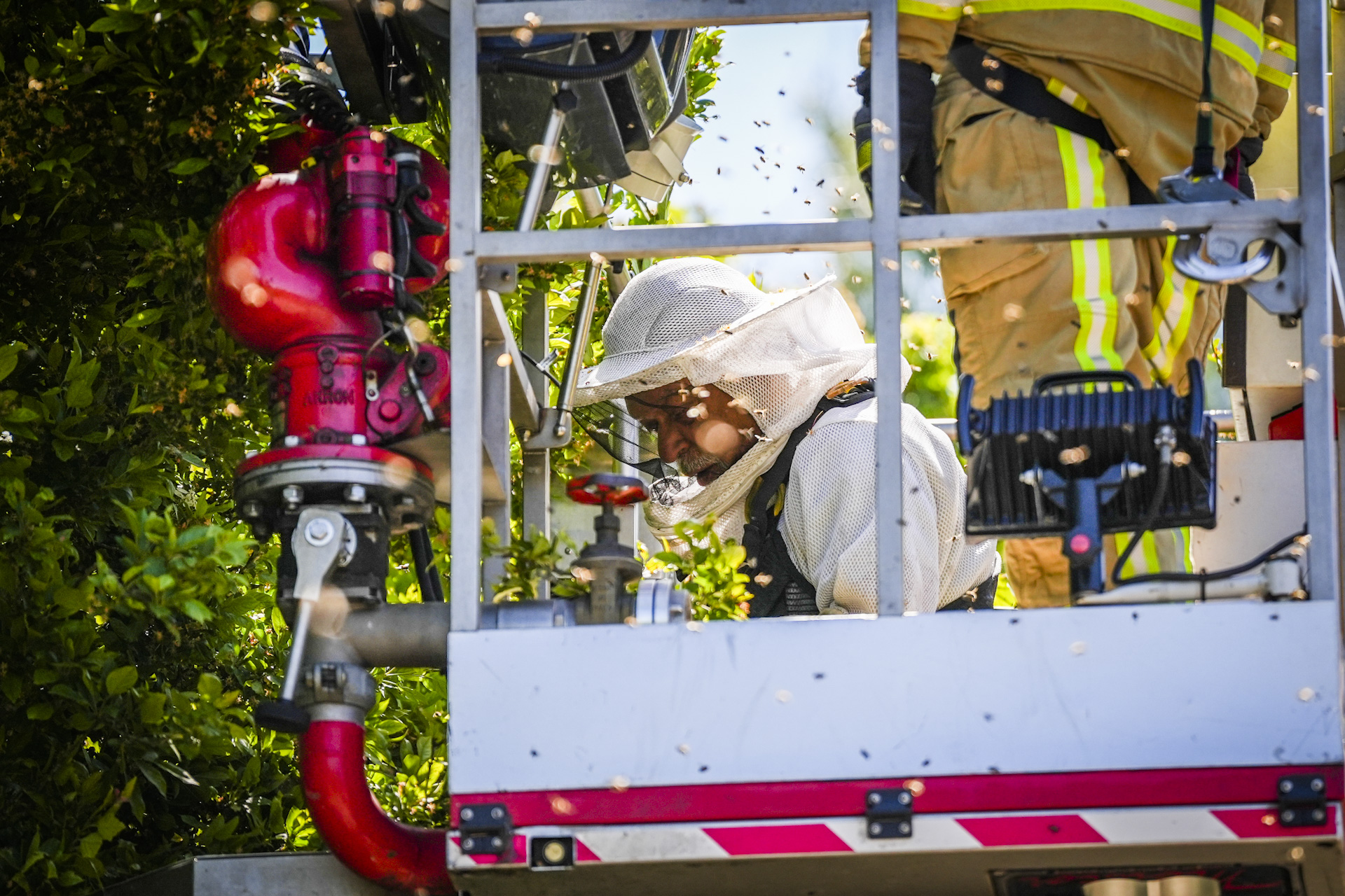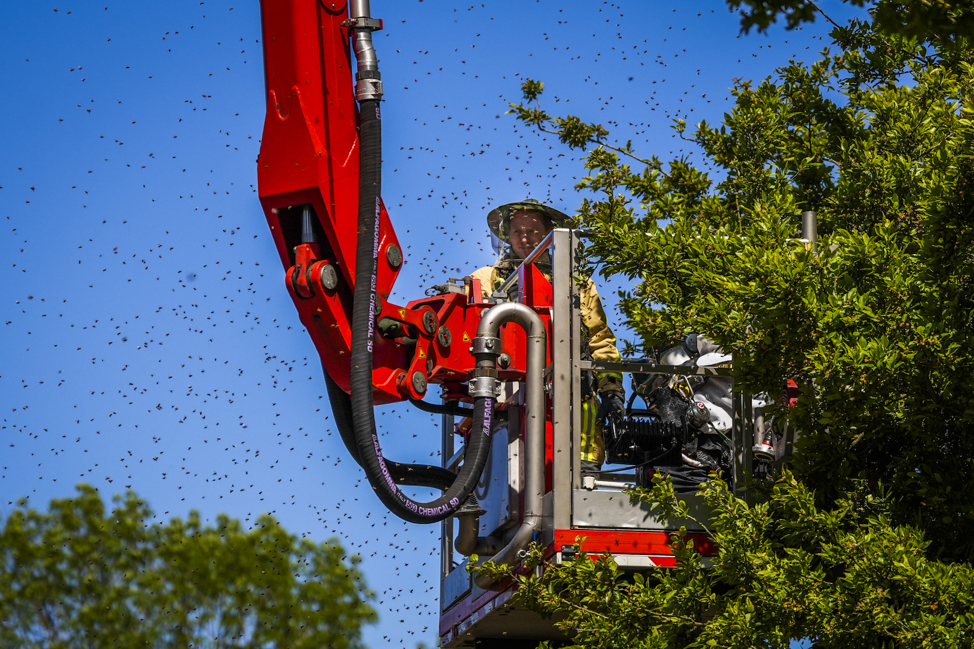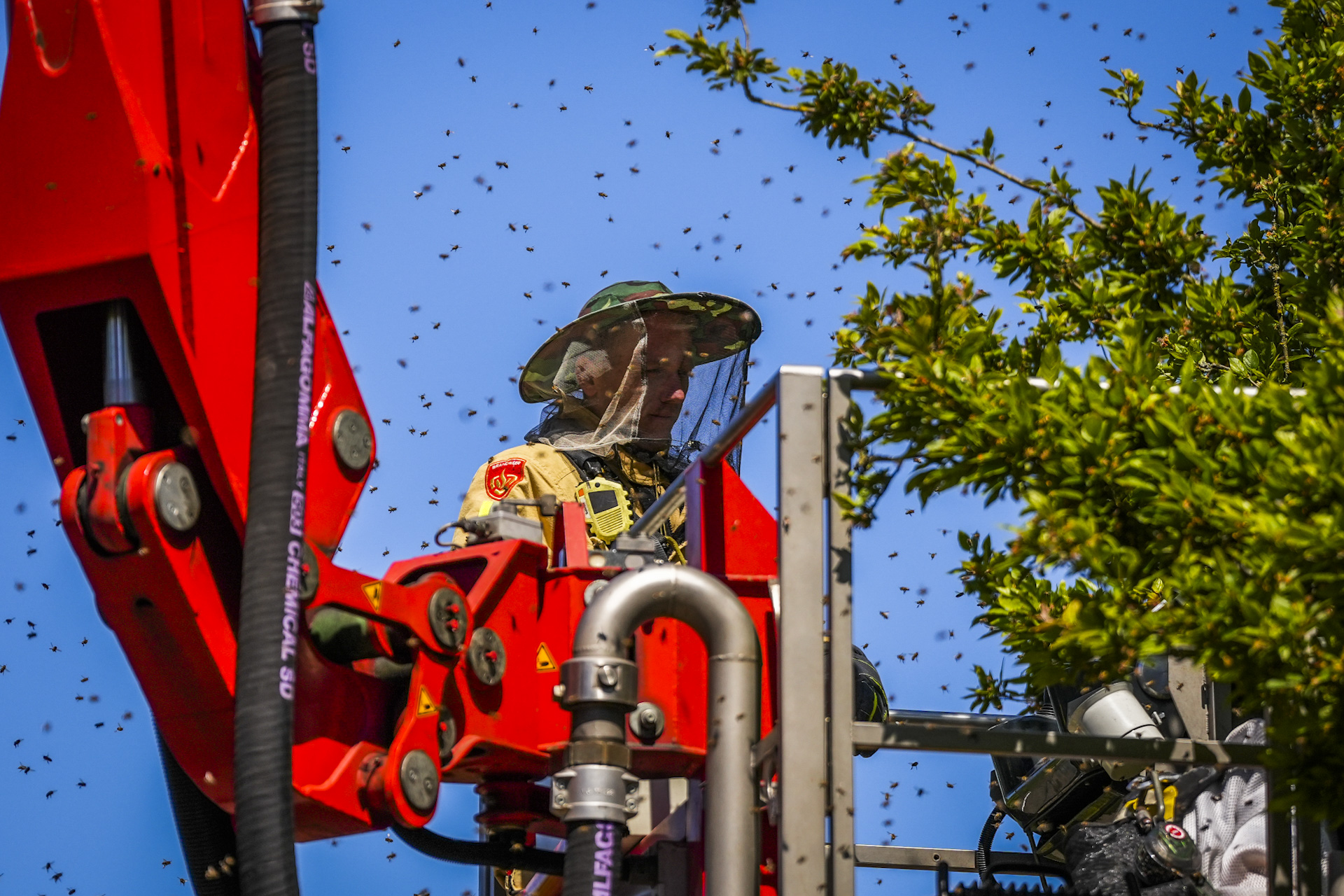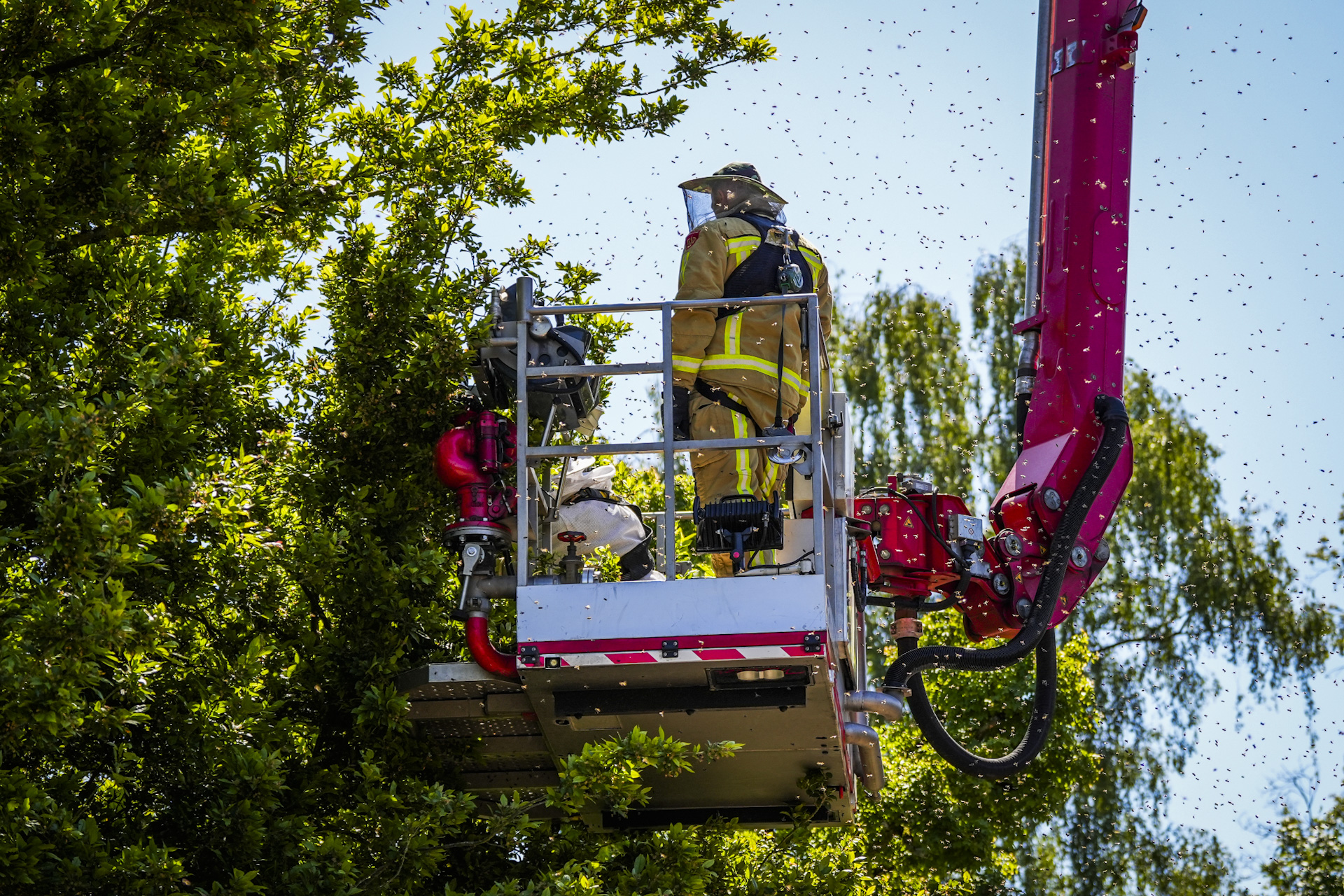 Bewoners schakelden een imker in om de zwerm te vangen, maar vanwege de hoogte van de boom kon hij daar niet zelfstandig bij. De imker vroeg om assistentie van de brandweer, die met een hoogwerker ter plaatse kwam. Vervolgens werd geprobeerd de bijenkoningin te lokaliseren en in een bijenkorf te plaatsen, in de hoop dat de rest van de zwerm vanzelf zou volgen.