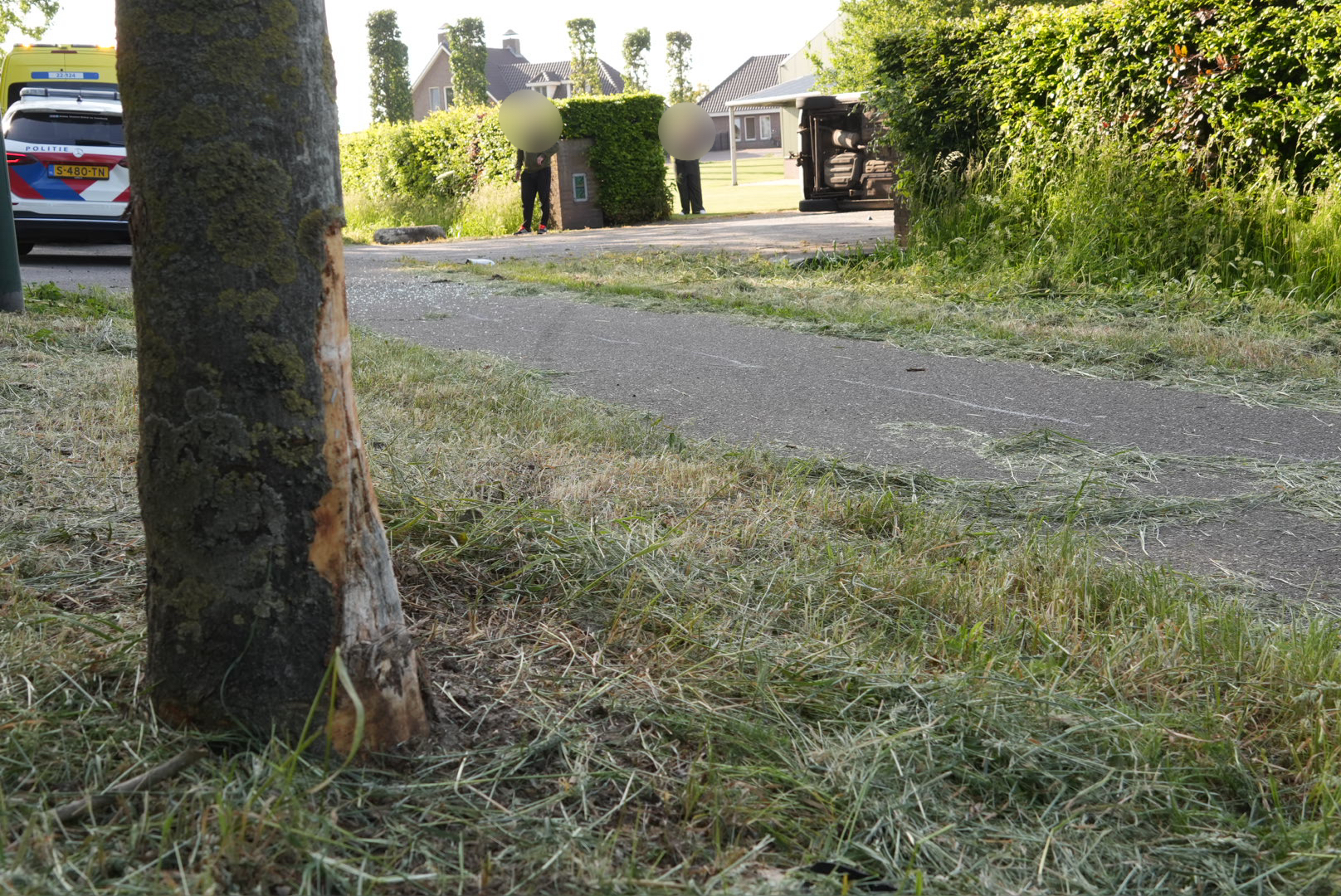 Het ongeval gebeurde net na een flauwe bocht. De auto schampte een boom, reed langs de rand van een sloot en belandde vervolgens gekanteld op de oprit. De bestuurder is in de ambulance onderzocht, maar hoefde voor zover bekend niet naar het ziekenhuis.