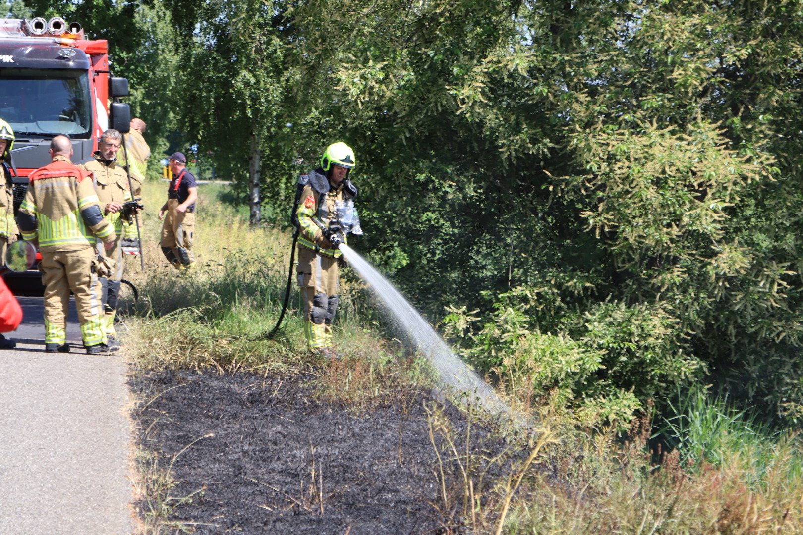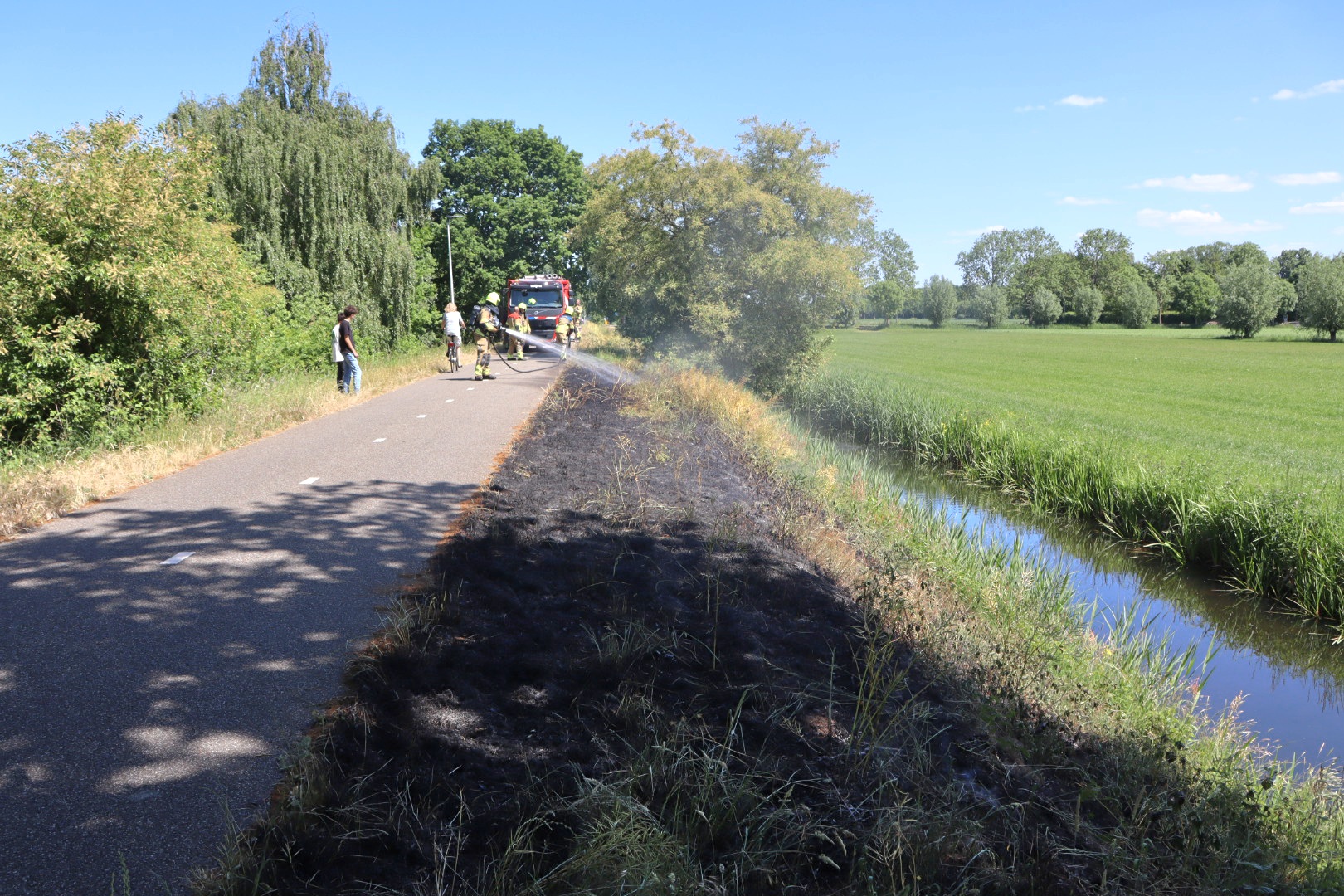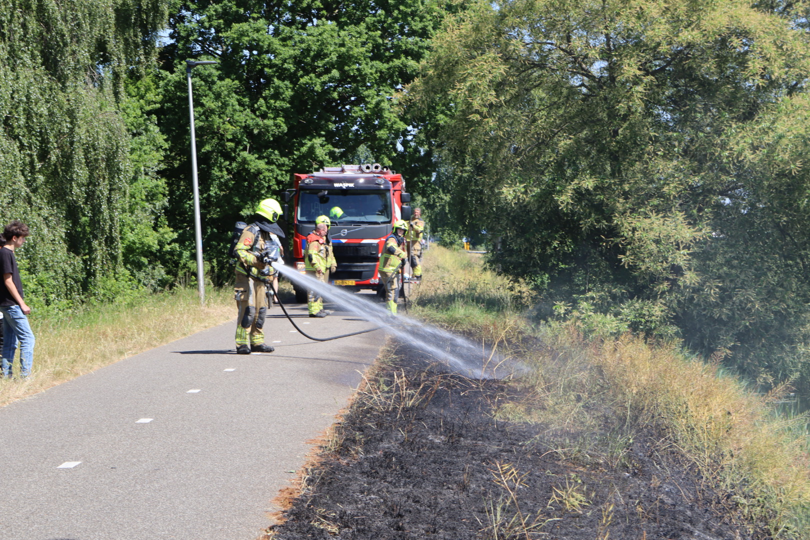 Geplaatst op 19 mei 2025, om 15:49 uurWASPIK – Maandagmiddag rond 14.55 uur werd de brandweer van Waspik gealarmeerd voor een bermbrand aan het Halve Zolenpad. Tijdens het blussen mochten fietsers lopend langs de inzetplaats passeren.