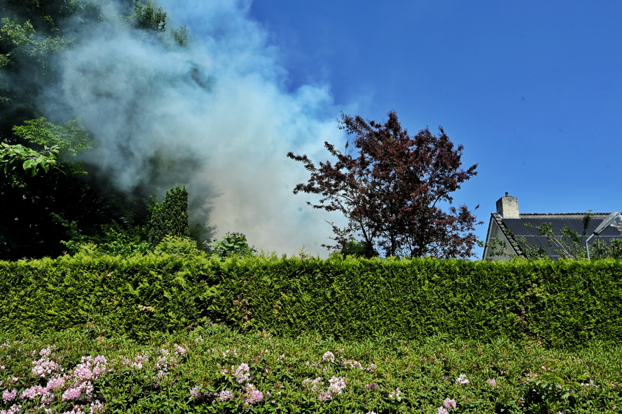 Het vuur greep snel om zich heen en veroorzaakte flinke rookontwikkeling. Van het tuinhuis bleef weinig over.