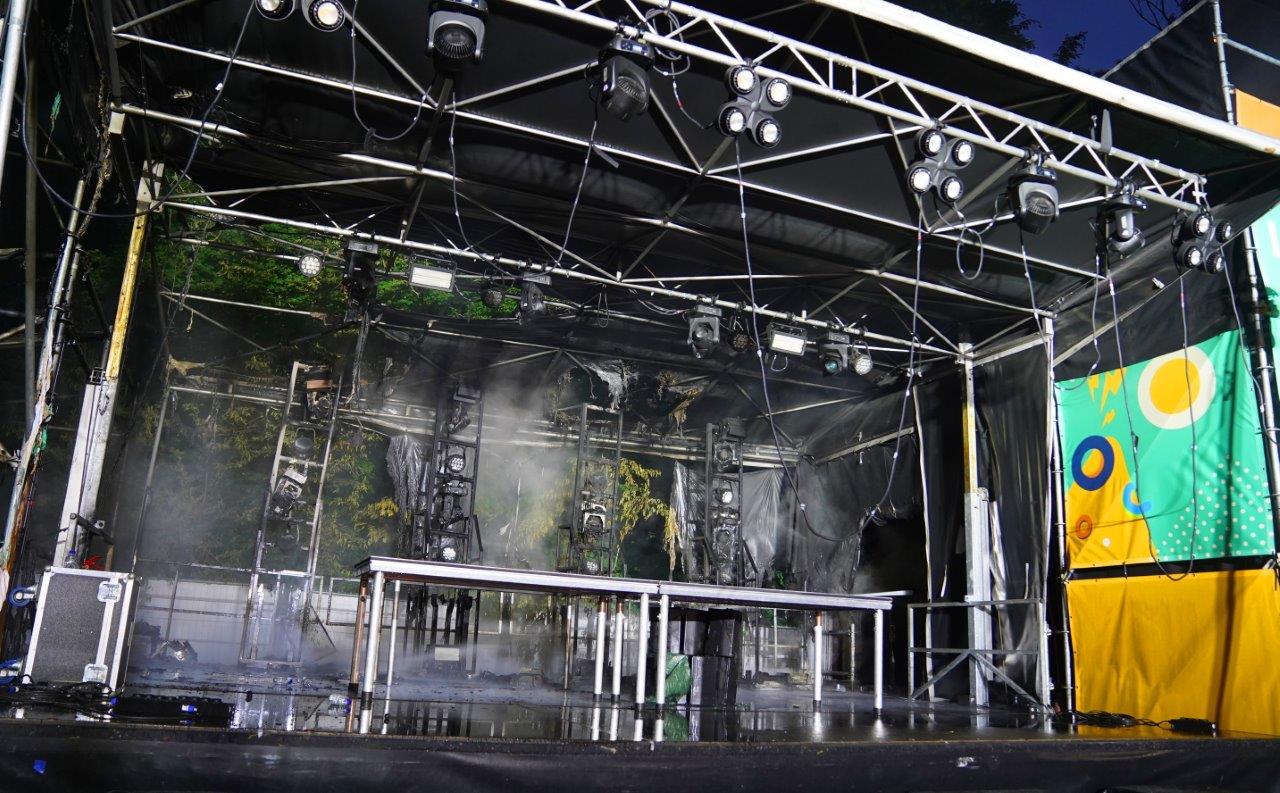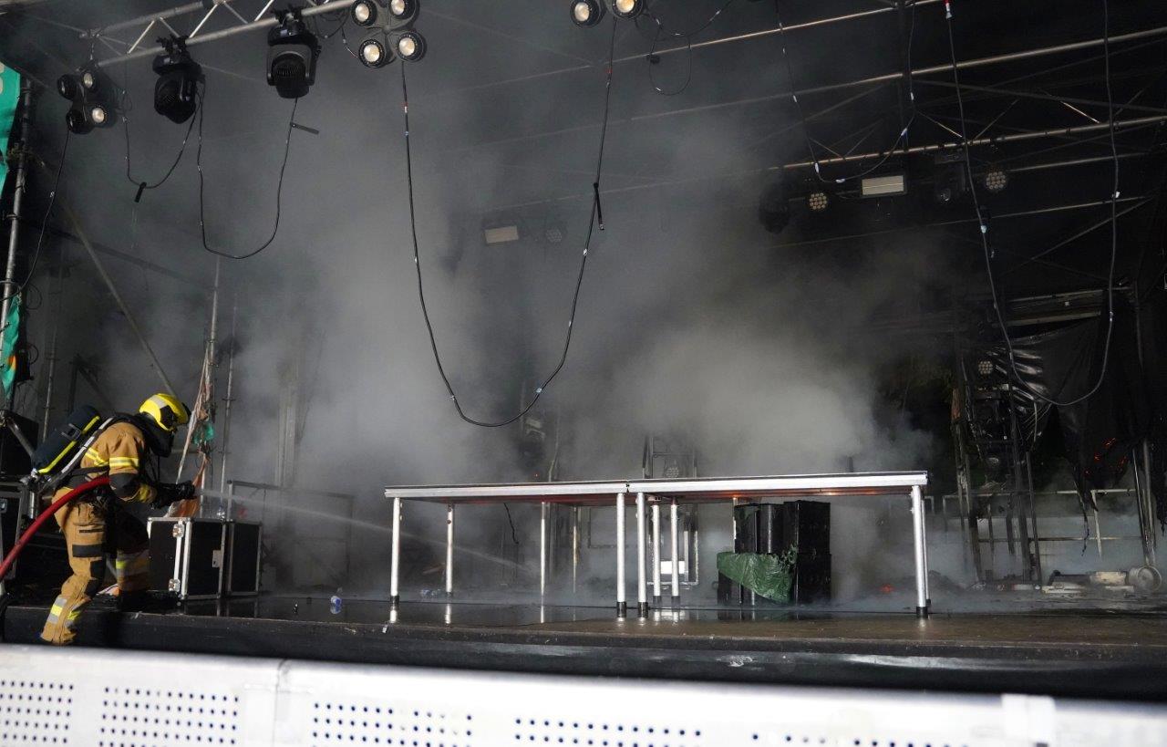 Het podium, uitgerust met licht- en geluidsinstallaties, ging volledig in vlammen op. De schade is aanzienlijk. De brandweer was snel ter plaatse, maar kon niet voorkomen dat het hele bouwwerk werd verwoest.