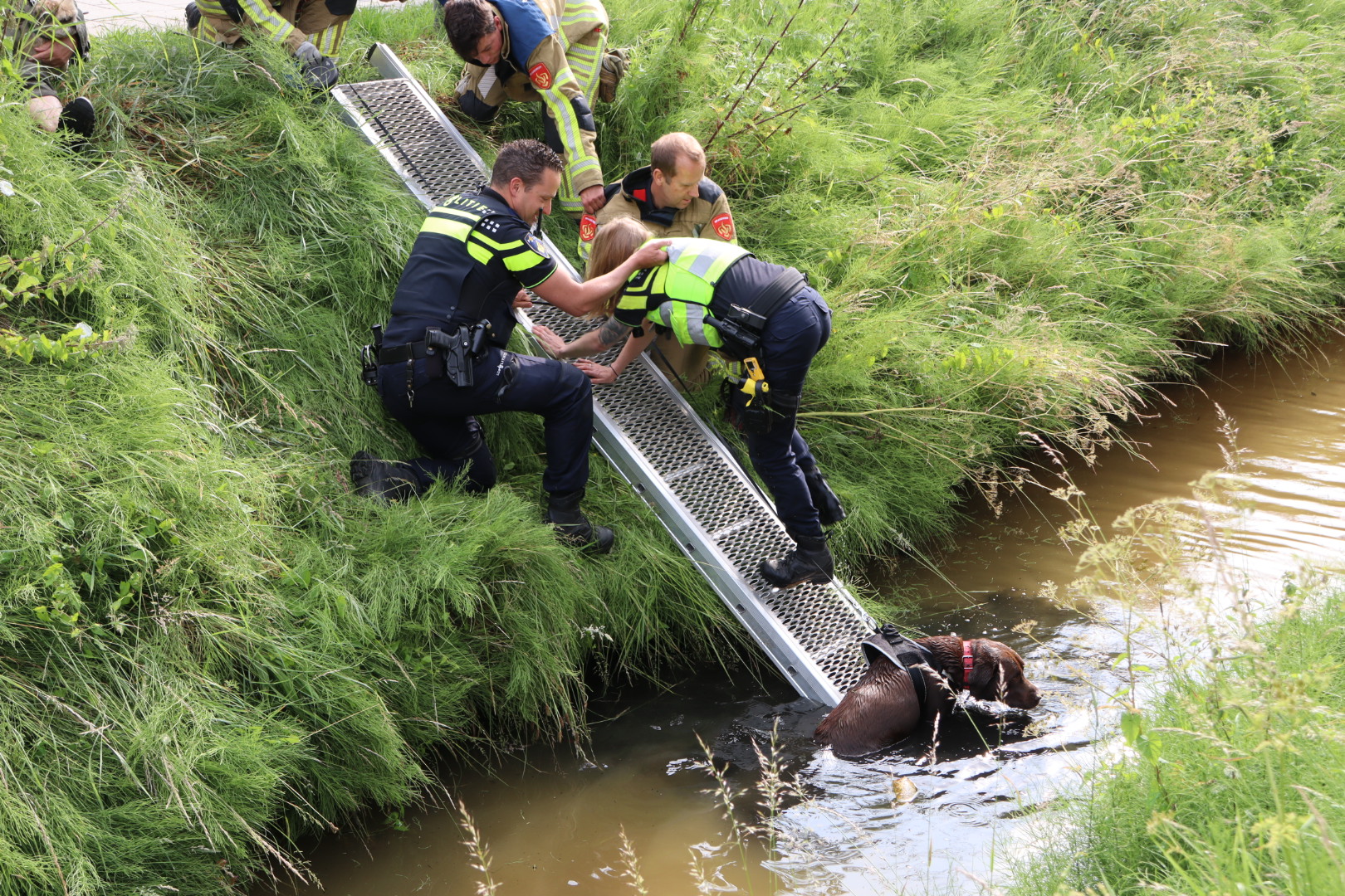 Het dier gleed uit tijdens het uitlaten langs de slootkant en belandde in het water. Hulpdiensten, waaronder politie en brandweer, kwamen ter plaatse om de hond te redden. De inzet verliep succesvol, en de hond kon veilig uit de sloot worden gehaald.