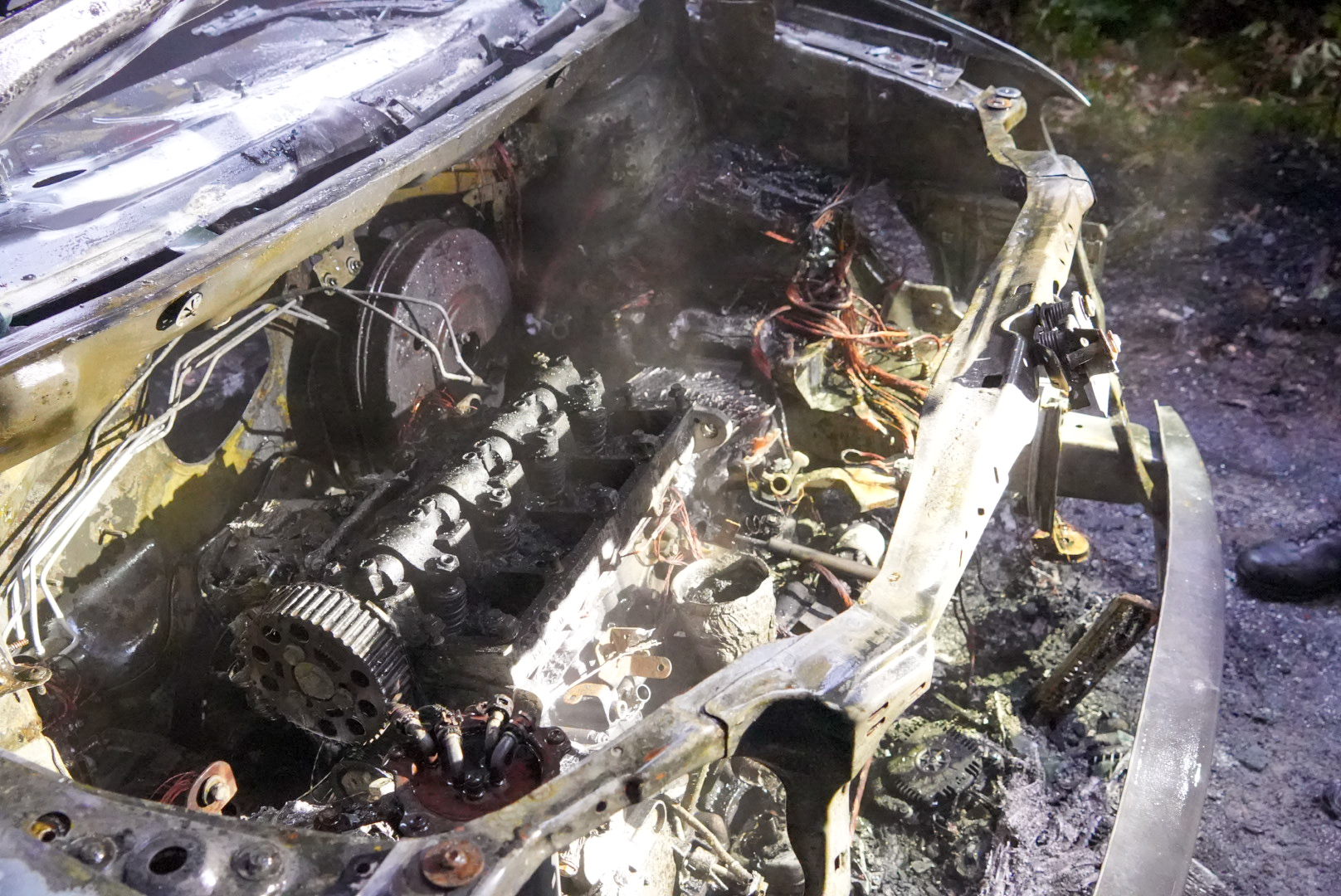 Er is niemand bij de auto aangetroffen. De herkomst van het voertuig en de oorzaak van de brand zijn onbekend. De politie doet geen verder onderzoek. Een bergingsbedrijf zal het wrak afvoeren.