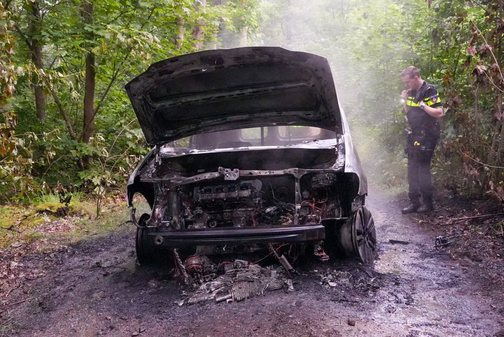 Er is niemand bij de auto aangetroffen. De herkomst van het voertuig en de oorzaak van de brand zijn onbekend. De politie doet geen verder onderzoek. Een bergingsbedrijf zal het wrak afvoeren.