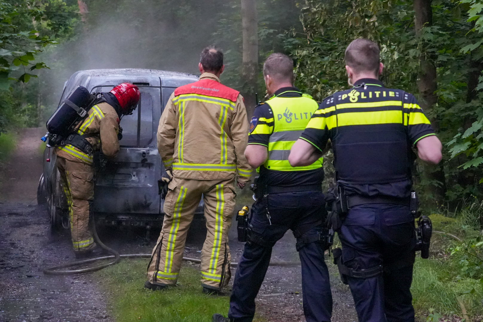Brandende bestelbus op bospad aangetroffen