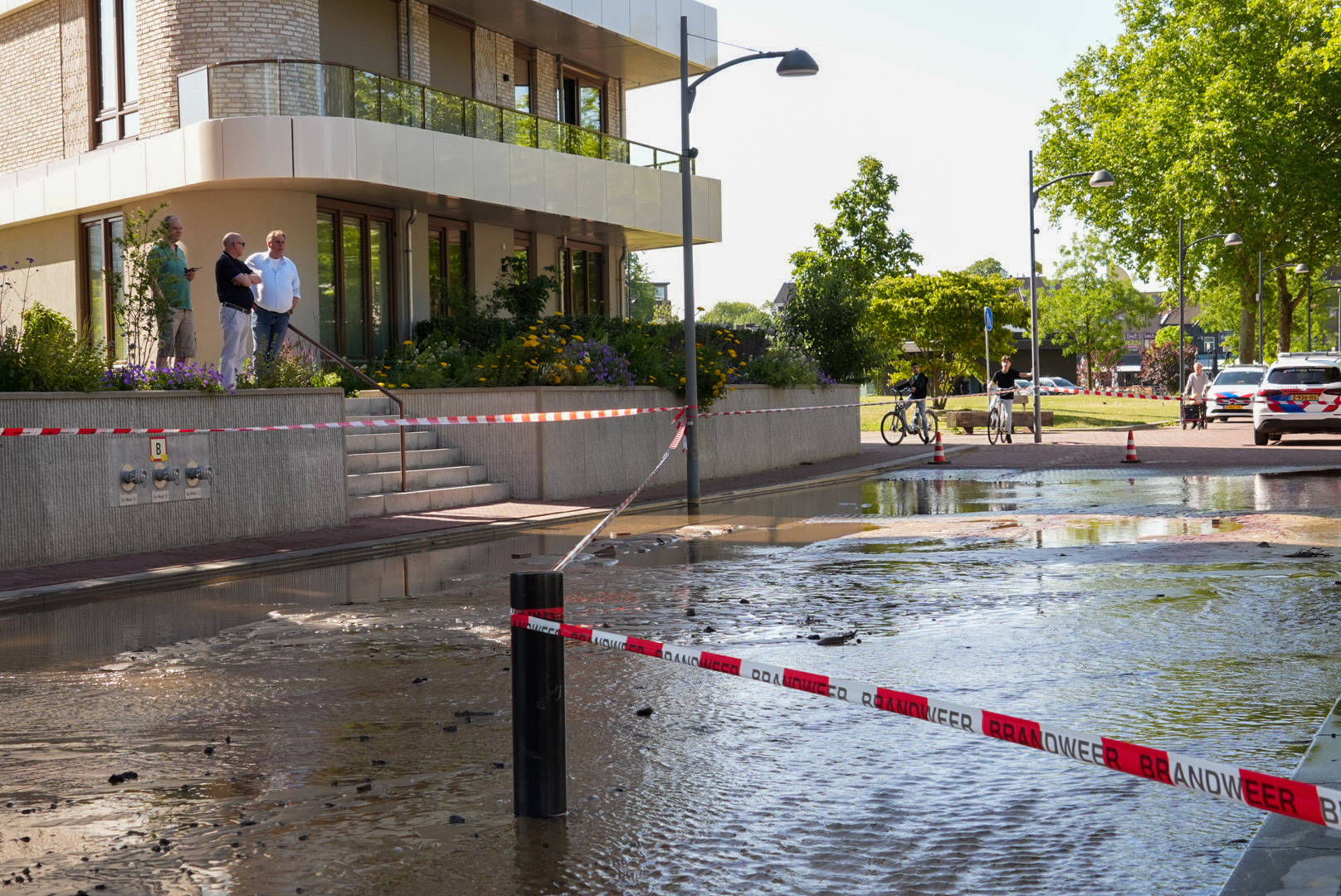 Op dit moment stroomt het water richting het kanaal langs de weg. Brabant Water is ter plaatse en werkt aan het afsluiten van een hoofdleiding.