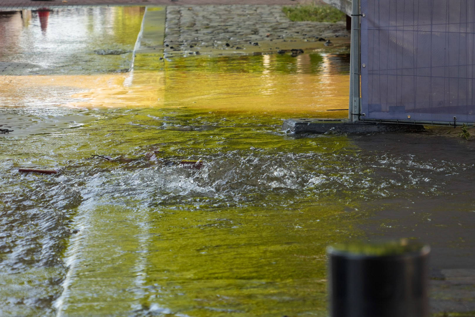 Waterleiding gesprongen, straat onder water