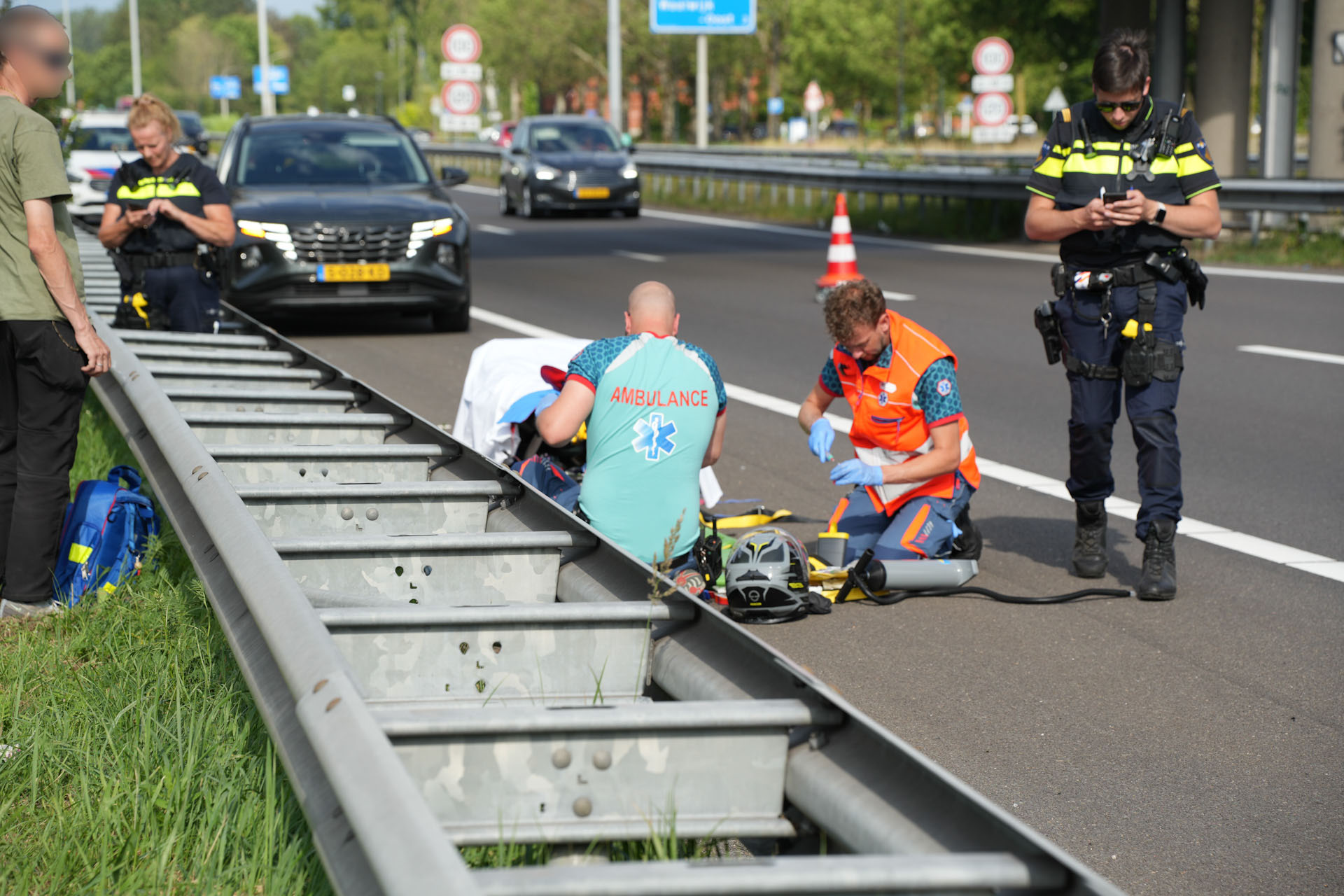 Na de botsing schoof de motorrijder een flinke afstand door en belandde net voorbij het viaduct over de vangrail, waarna hij op de A59 terechtkwam. Daar bleef hij zwaargewond op het wegdek liggen. Een passerende automobilist verleende direct eerste hulp in afwachting van de hulpdiensten. De man is ter plaatse gestabiliseerd door ambulancepersoneel. Een tweede ambulance werd opgeroepen ter ondersteuning, waarna het slachtoffer met spoed naar het ziekenhuis in Tilburg is vervoerd.