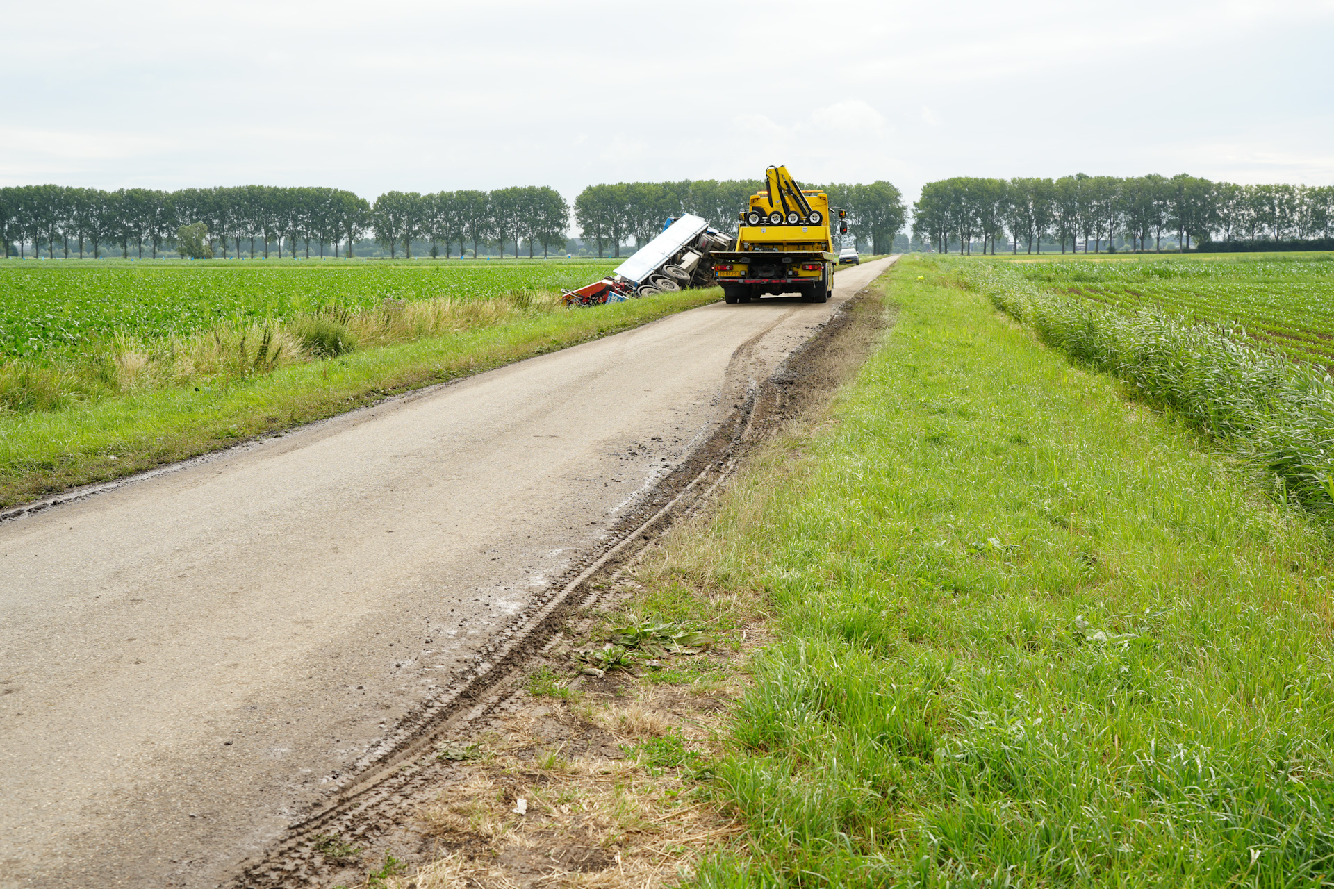 Vrachtwagen belandt in sloot, weg urenlang afgesloten