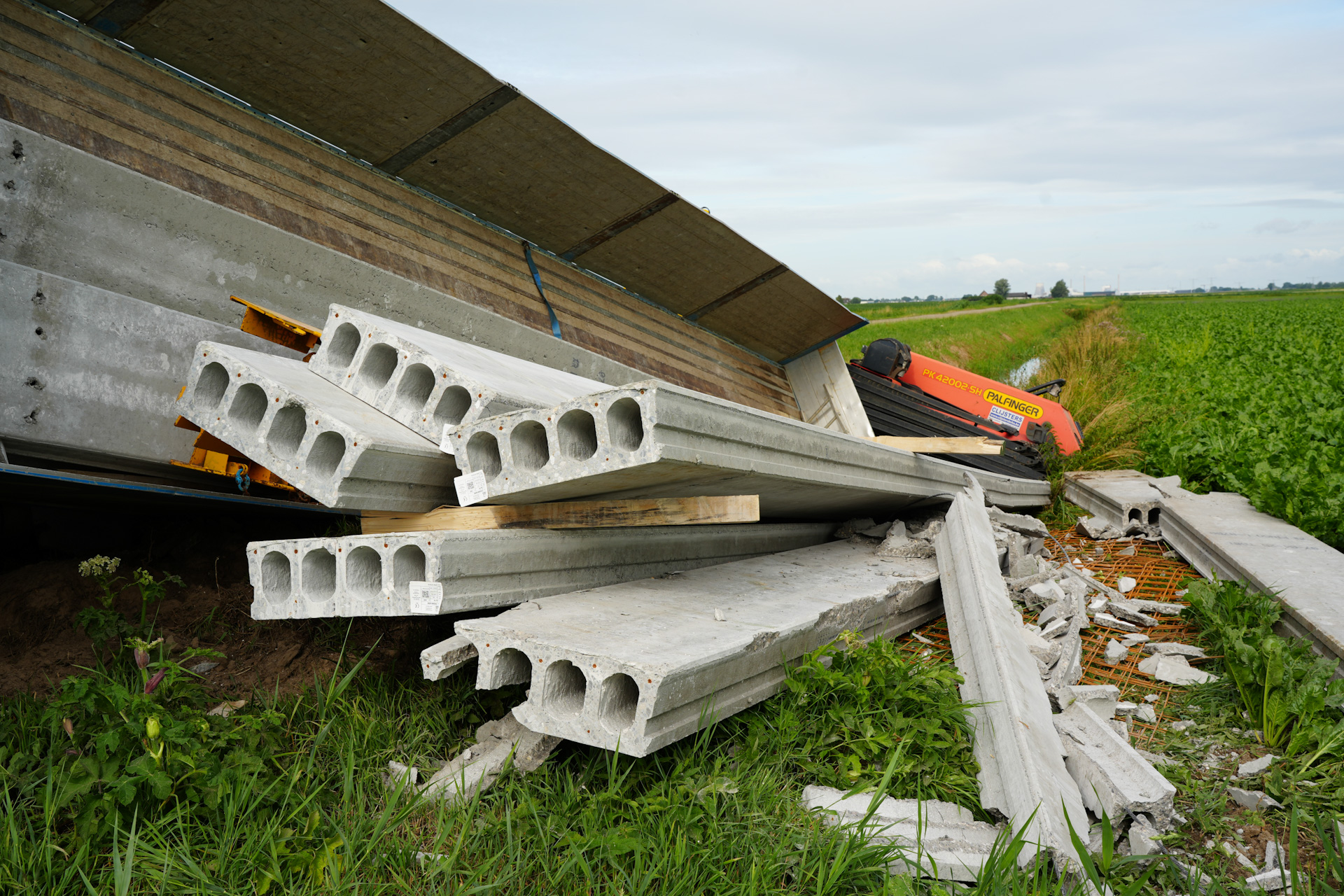 SPRANG CAPELLE – Een vrachtwagen is vrijdagochtend in een sloot terechtgekomen aan de Dellenweg in Sprang Capelle, waardoor de weg urenlang volledig is afgesloten. De bestuurder verloor de controle over het voertuig toen hij probeerde terug te sturen naar de rijbaan. De combinatie, een trekker met oplegger geladen met zware kanaalplaatvloeren, kantelde en belandde op zijn zij in het water.