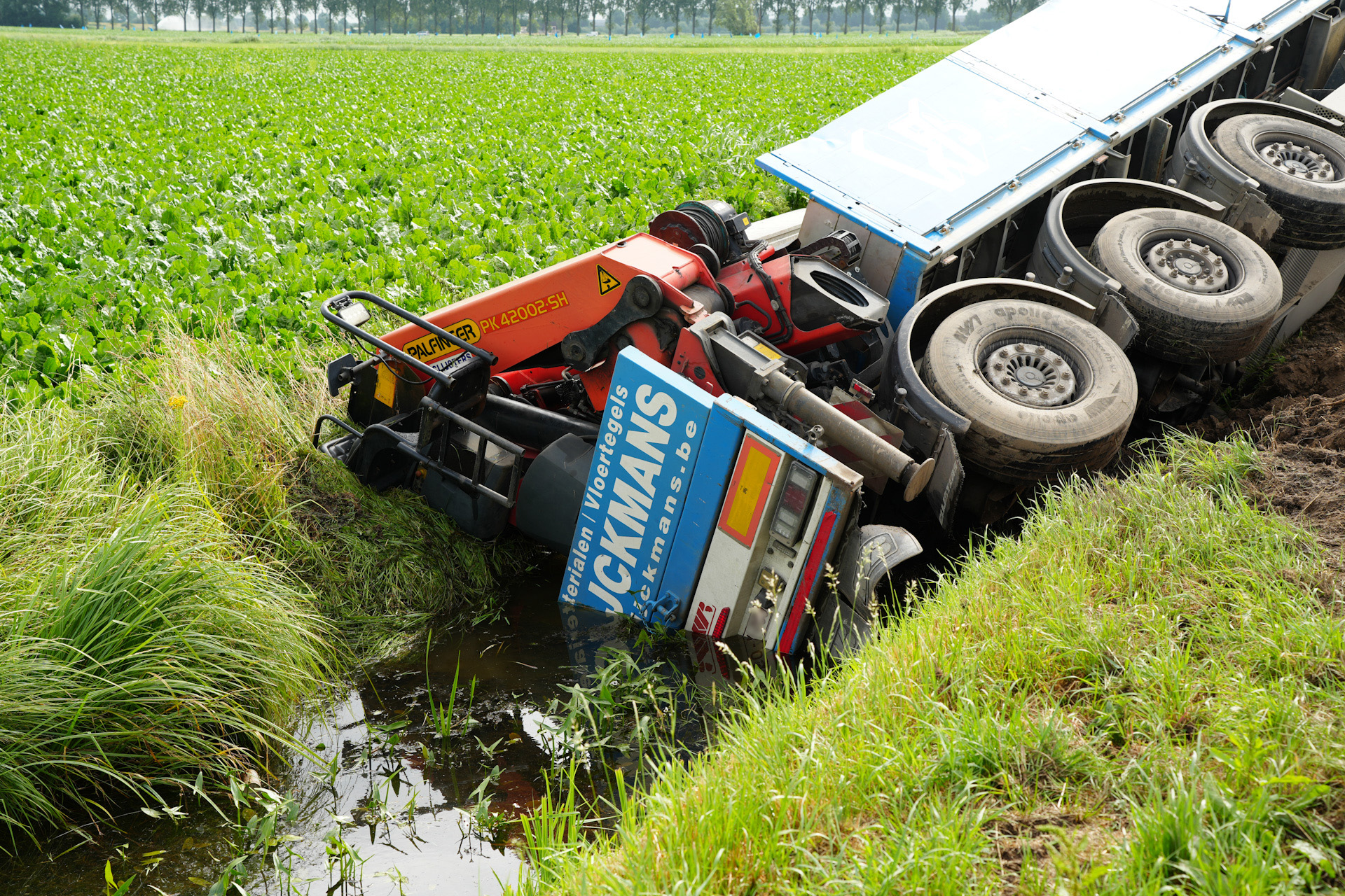 Vrachtwagen belandt in sloot, weg urenlang afgesloten