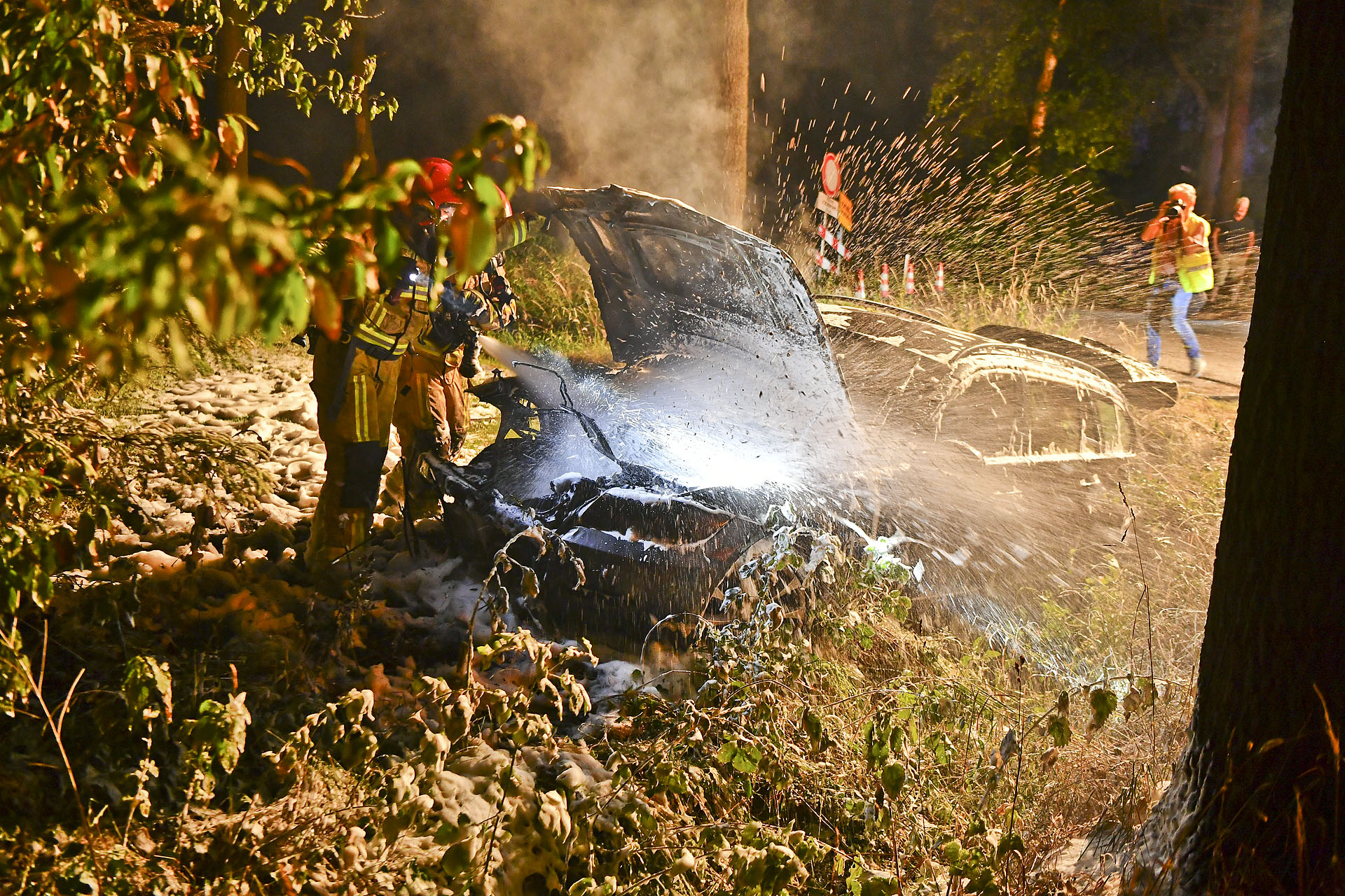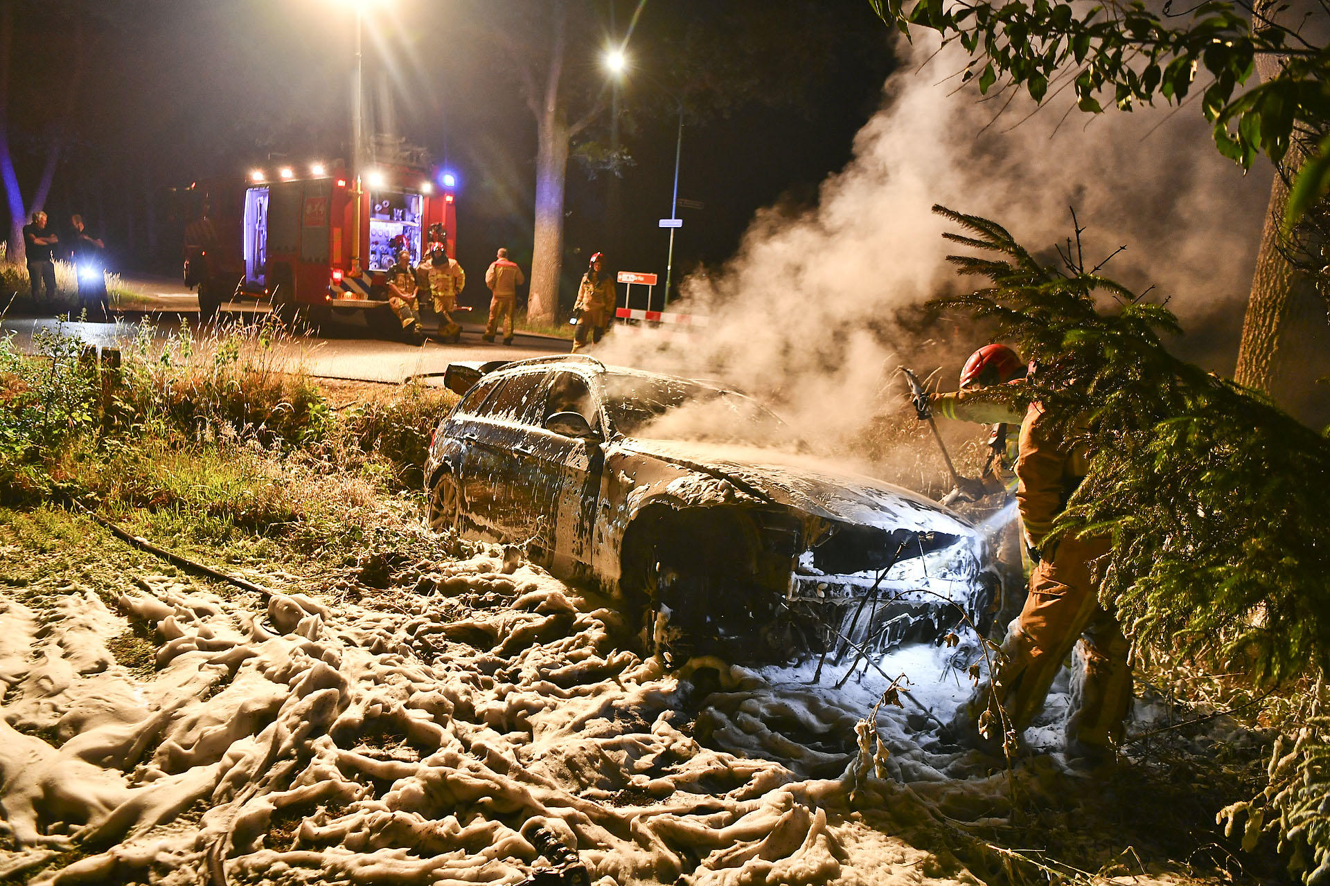 De brandweer kreeg het vuur snel onder controle. De auto kwam deels in de tuin van omwonenden tot stilstand. De politie heeft de bestuurder meegenomen voor verdere controle. De weg was tijdelijk afgesloten voor verkeer.