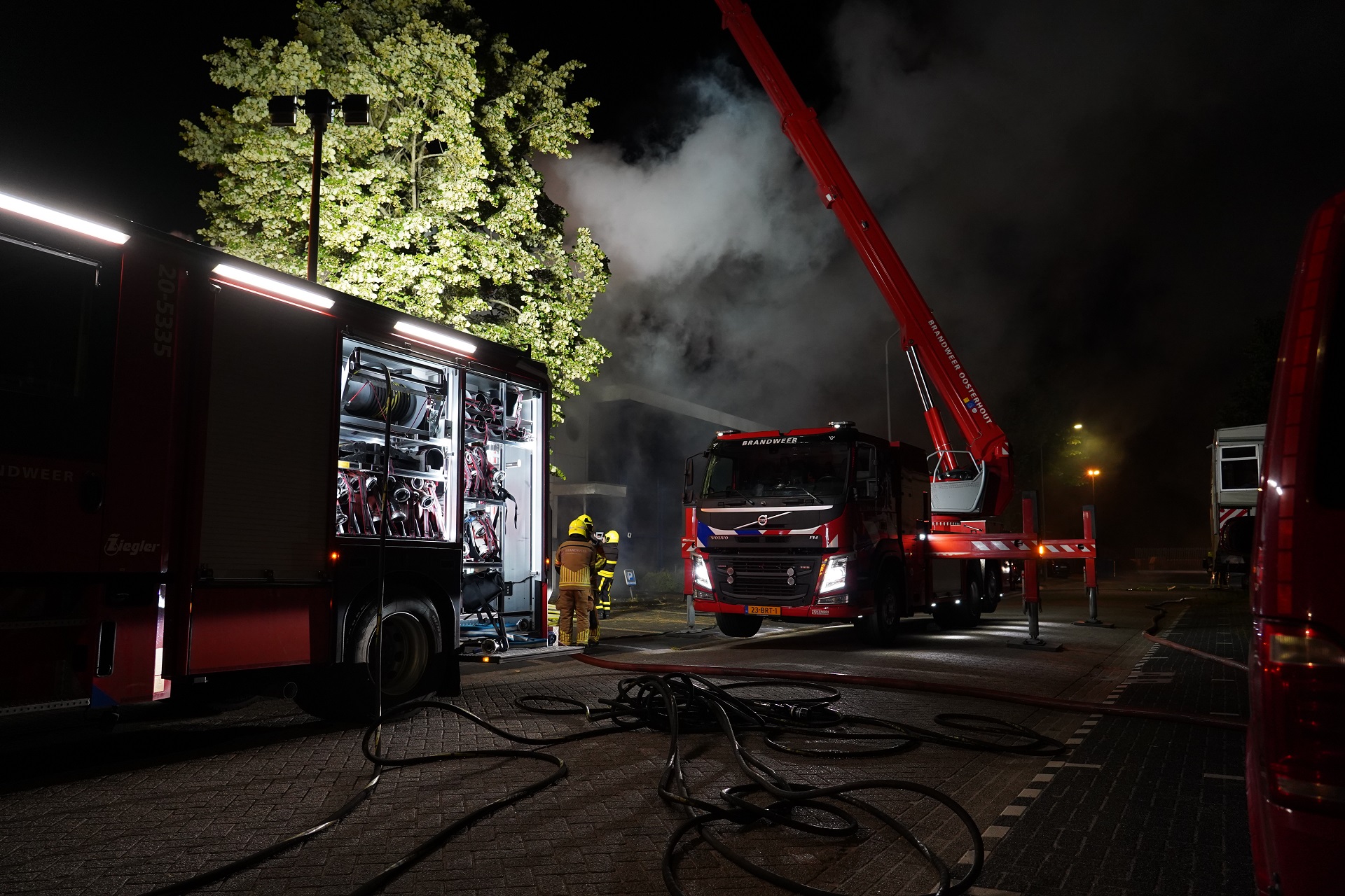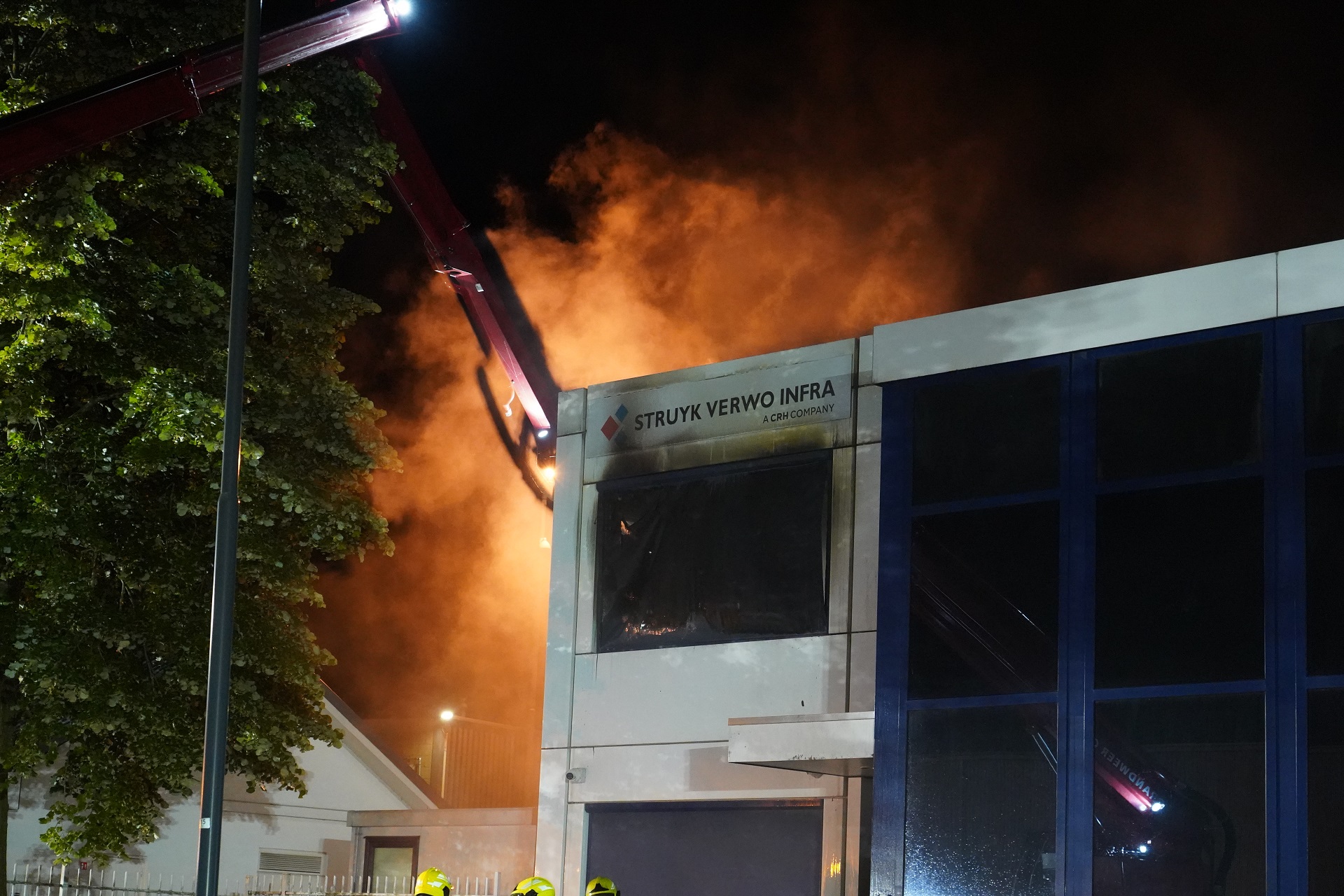 De brand ontstond rond 02.30 uur bij bestratingsbedrijf Struyk Verwo Infra en werd snel opgeschaald naar ‘zeer groot’. Iemand viel uit een raam op de tweede verdieping, kon zelf wegkomen, maar raakte gewond. Drie anderen werden door de brandweer uit het pand gehaald.
