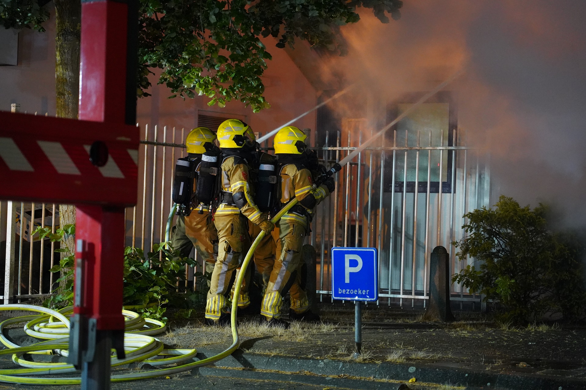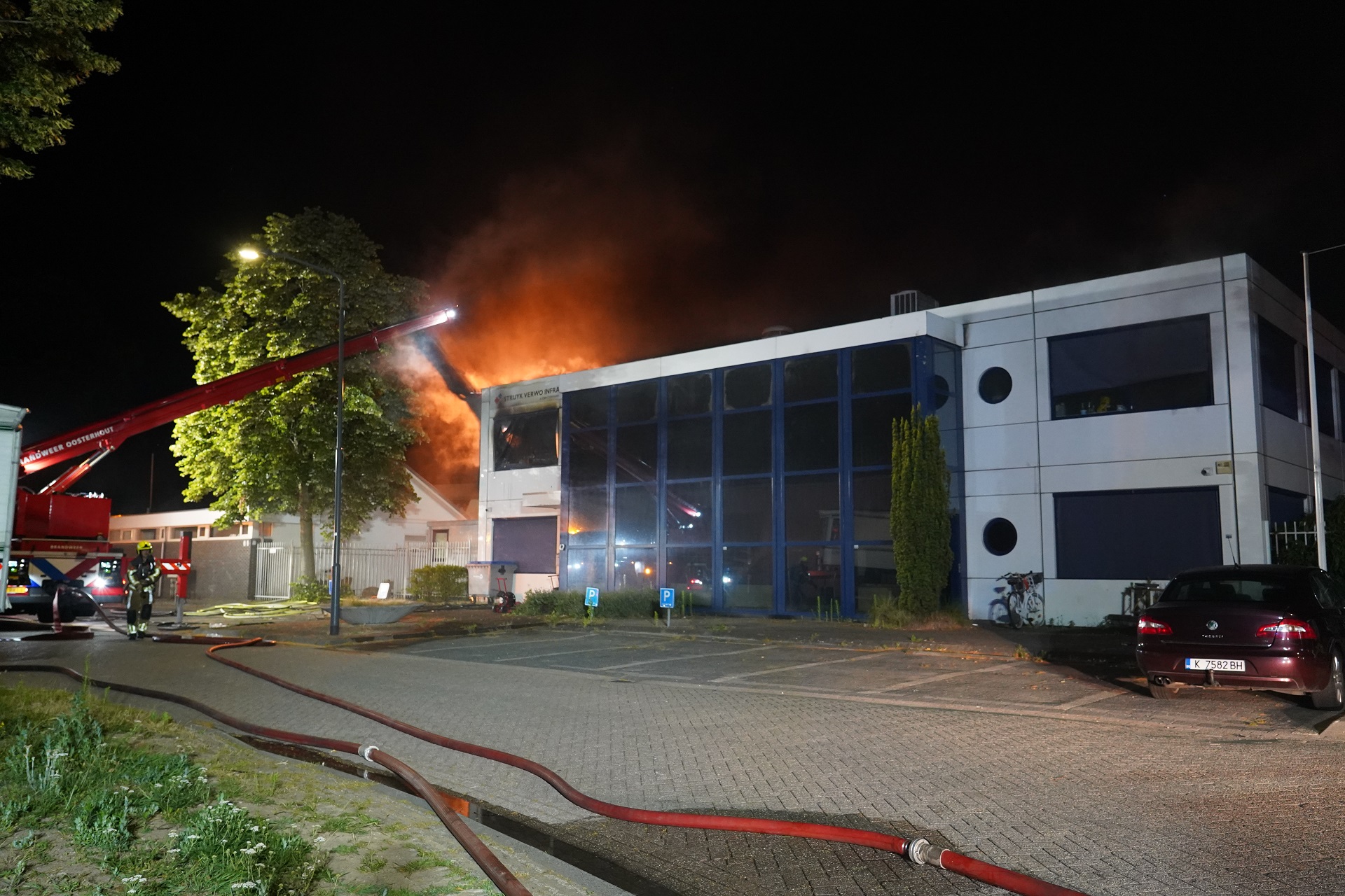 De brand ontstond rond 02.30 uur bij bestratingsbedrijf Struyk Verwo Infra en werd snel opgeschaald naar ‘zeer groot’. Iemand viel uit een raam op de tweede verdieping, kon zelf wegkomen, maar raakte gewond. Drie anderen werden door de brandweer uit het pand gehaald.