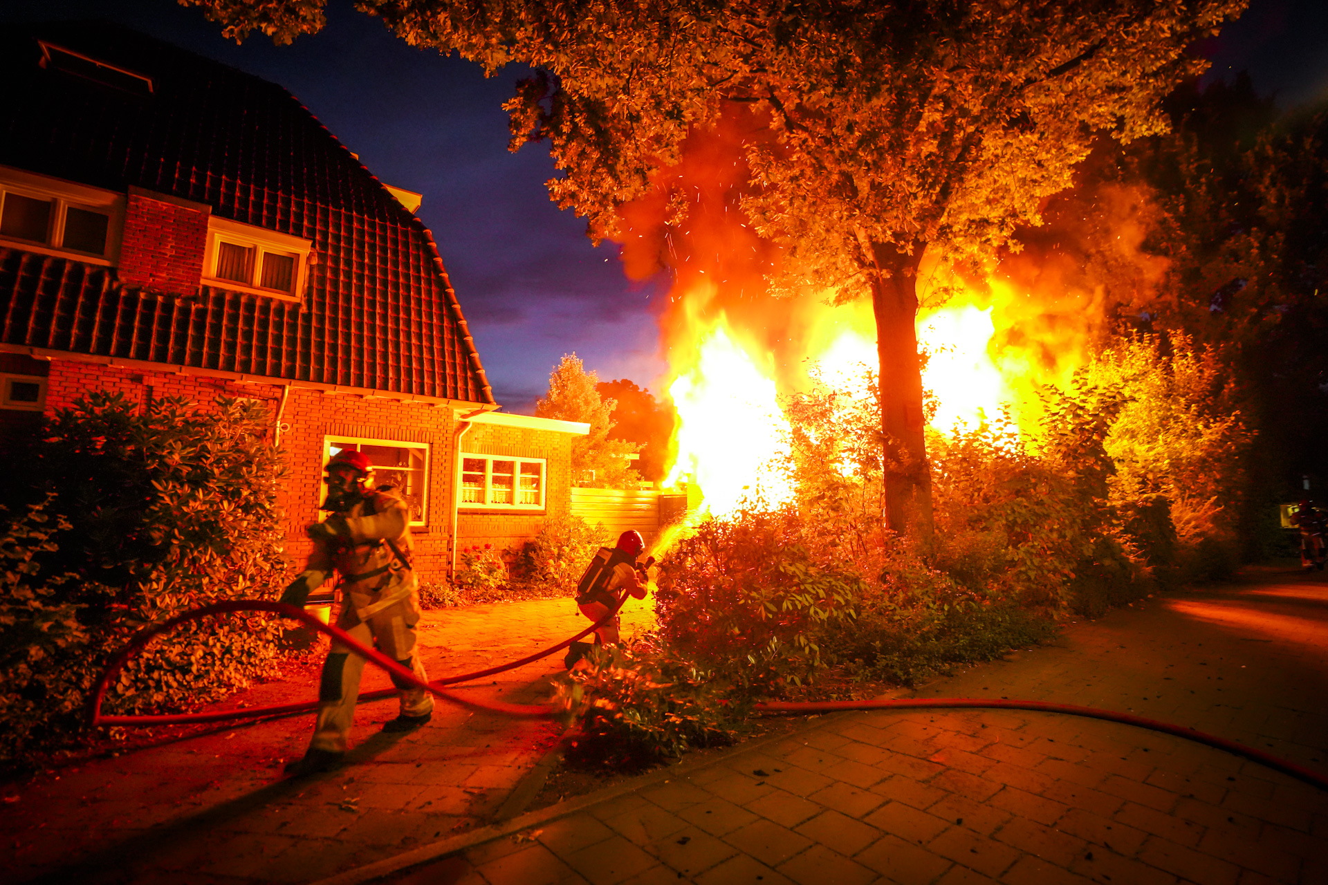 Vanwege exploderende gasflessen trok de brandweer het team tijdelijk terug en zette een waterkanon in om overslag naar de woning te voorkomen. Er was sprake van flinke rookontwikkeling en vliegvuur.