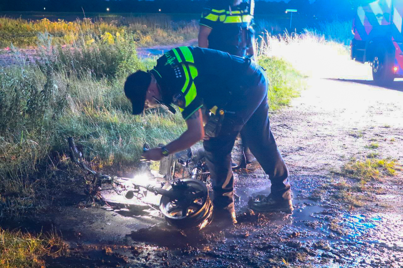 De brand werd snel geblust, maar van de scooter bleef weinig over. Ook de politie kwam ter plaatse om de situatie te onderzoeken.