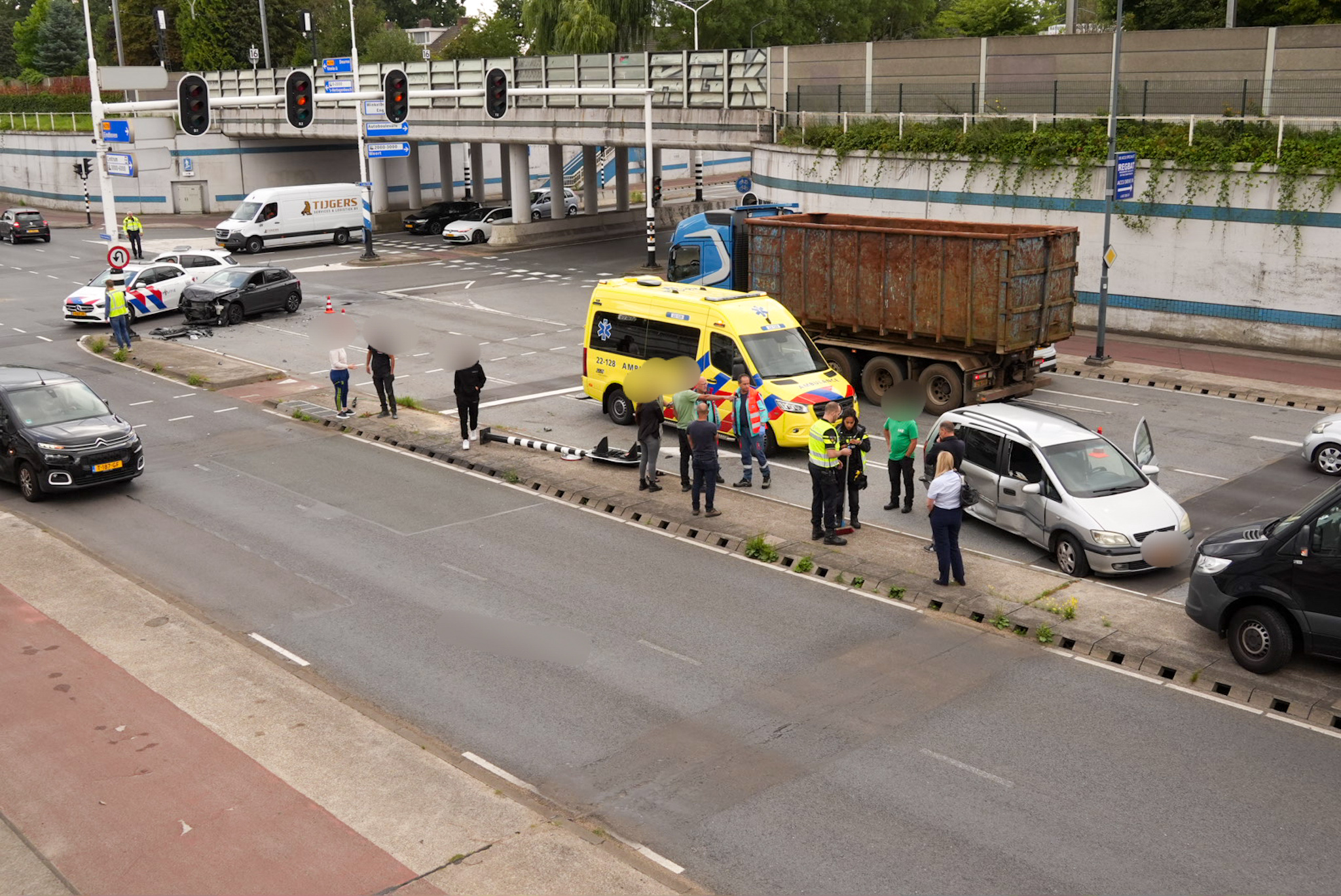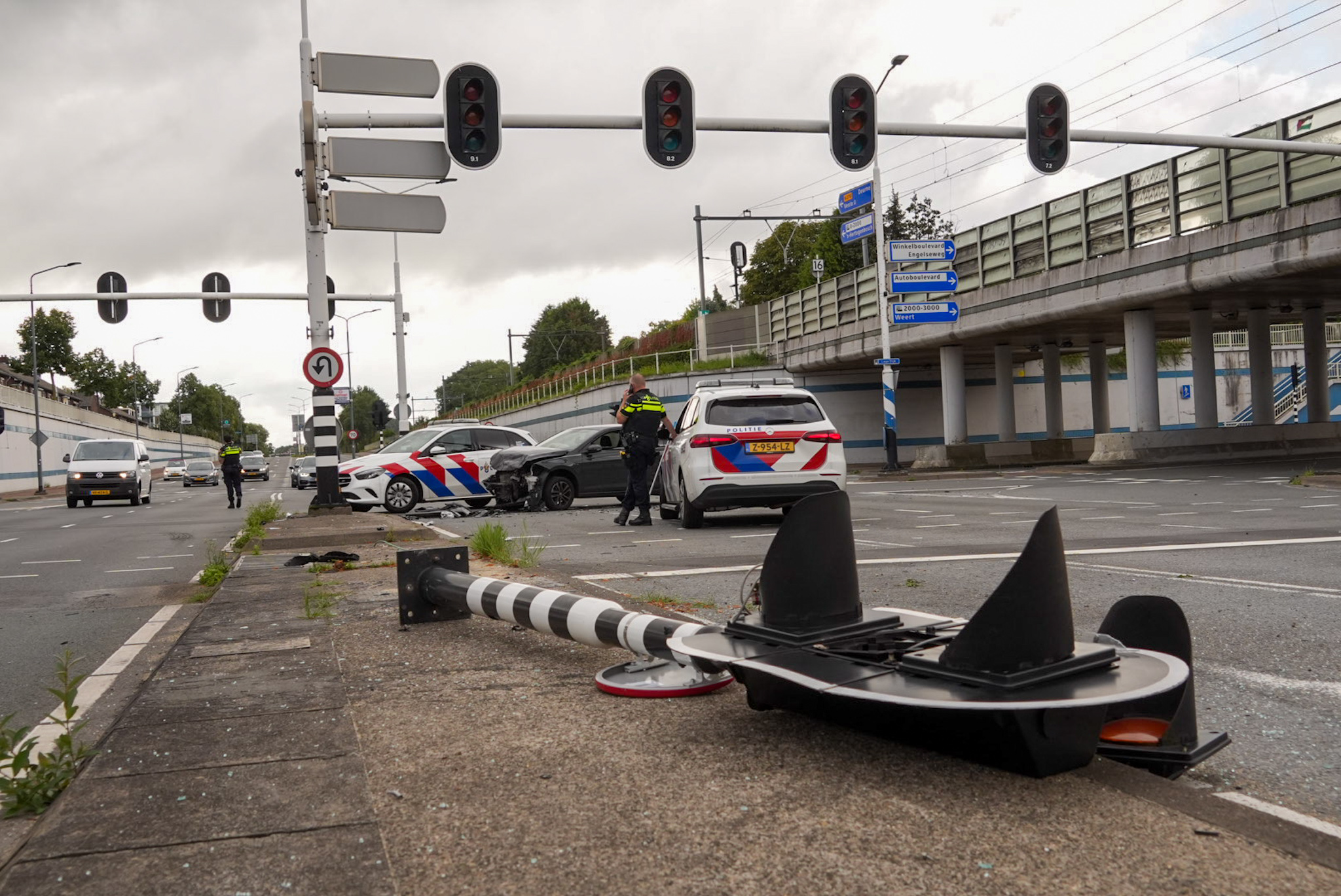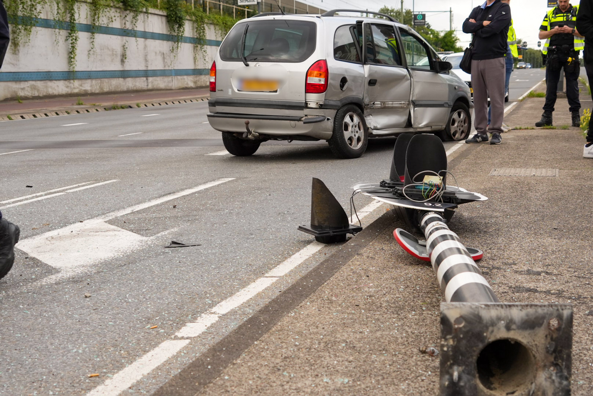 Botsing op kruising, auto rukt verkeerslicht uit de grond