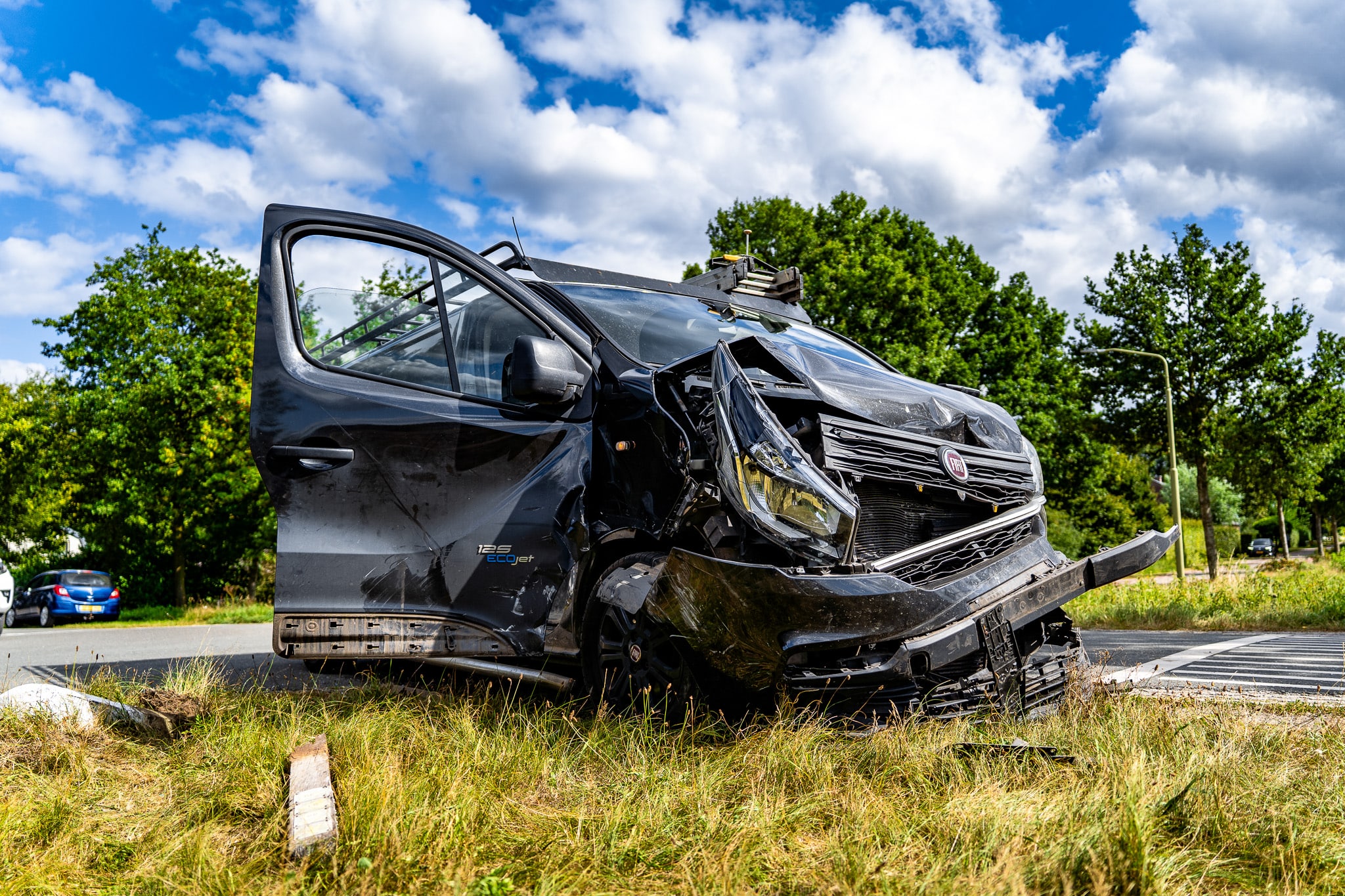 Een auto en een bestelbus kwamen met elkaar in botsing, waarna de auto door de klap in een droogstaande sloot terechtkwam. Een inzittende van de personenauto raakte gewond en is met een ambulance naar het ziekenhuis gebracht.