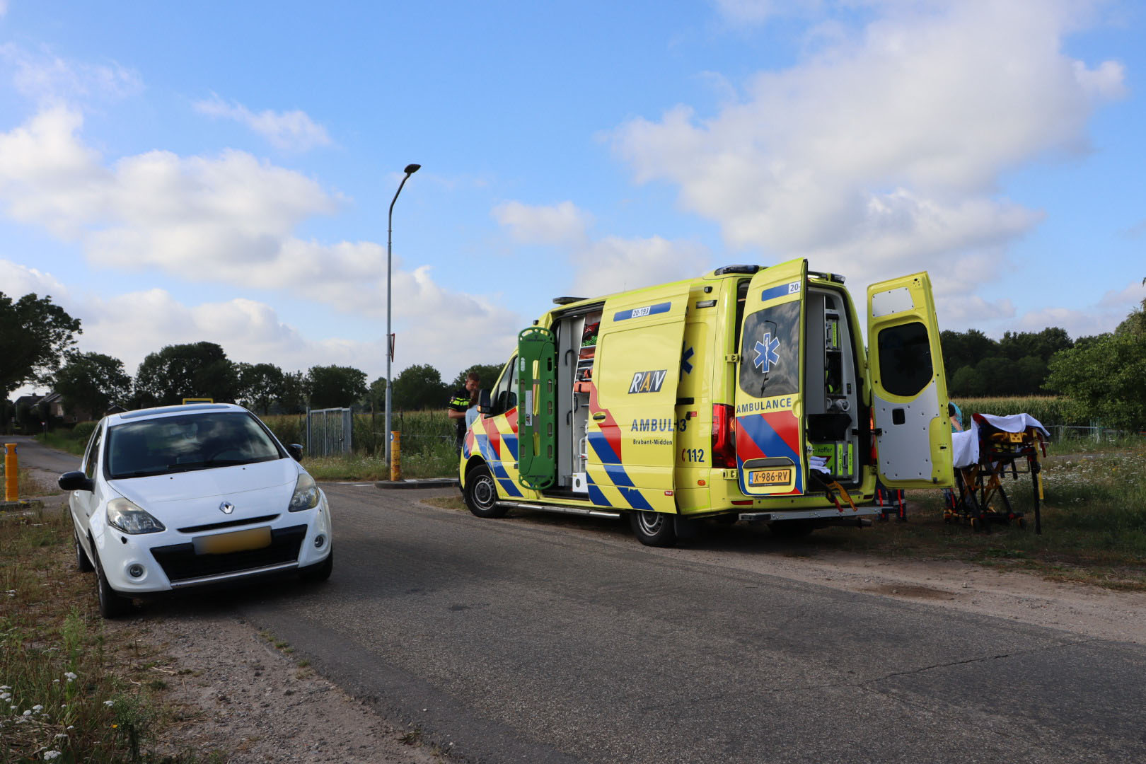 De wielrenner kwam door nog onbekende oorzaak in botsing met een auto. Hulpdiensten kwamen ter plaatse om eerste hulp te verlenen.