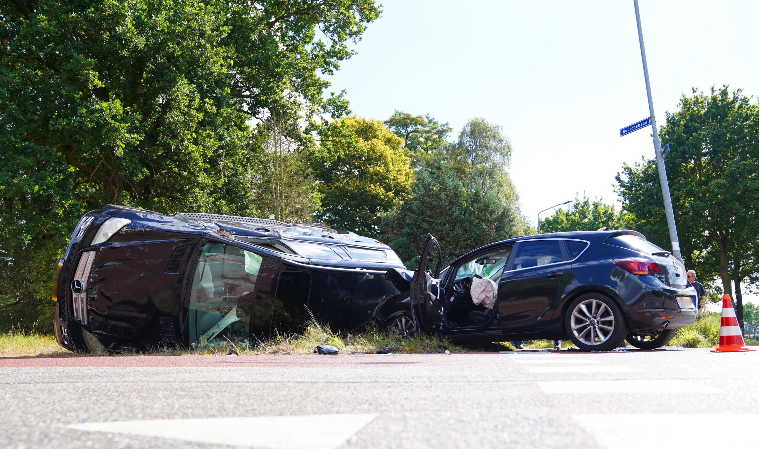 Door de harde klap belandde een van de auto’s op de zijkant in het gras en reed daarbij een paal omver. Het andere voertuig kwam eveneens in het gras terecht, maar bleef op de wielen staan. Geen van de inzittenden raakte gewond.