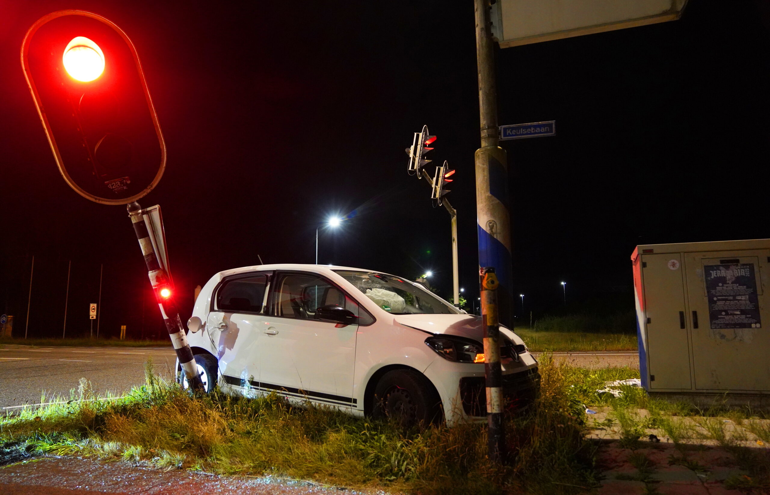 De auto raakte zwaar beschadigd en is door een berger afgevoerd. Ook het verkeerslicht liep flinke schade op.