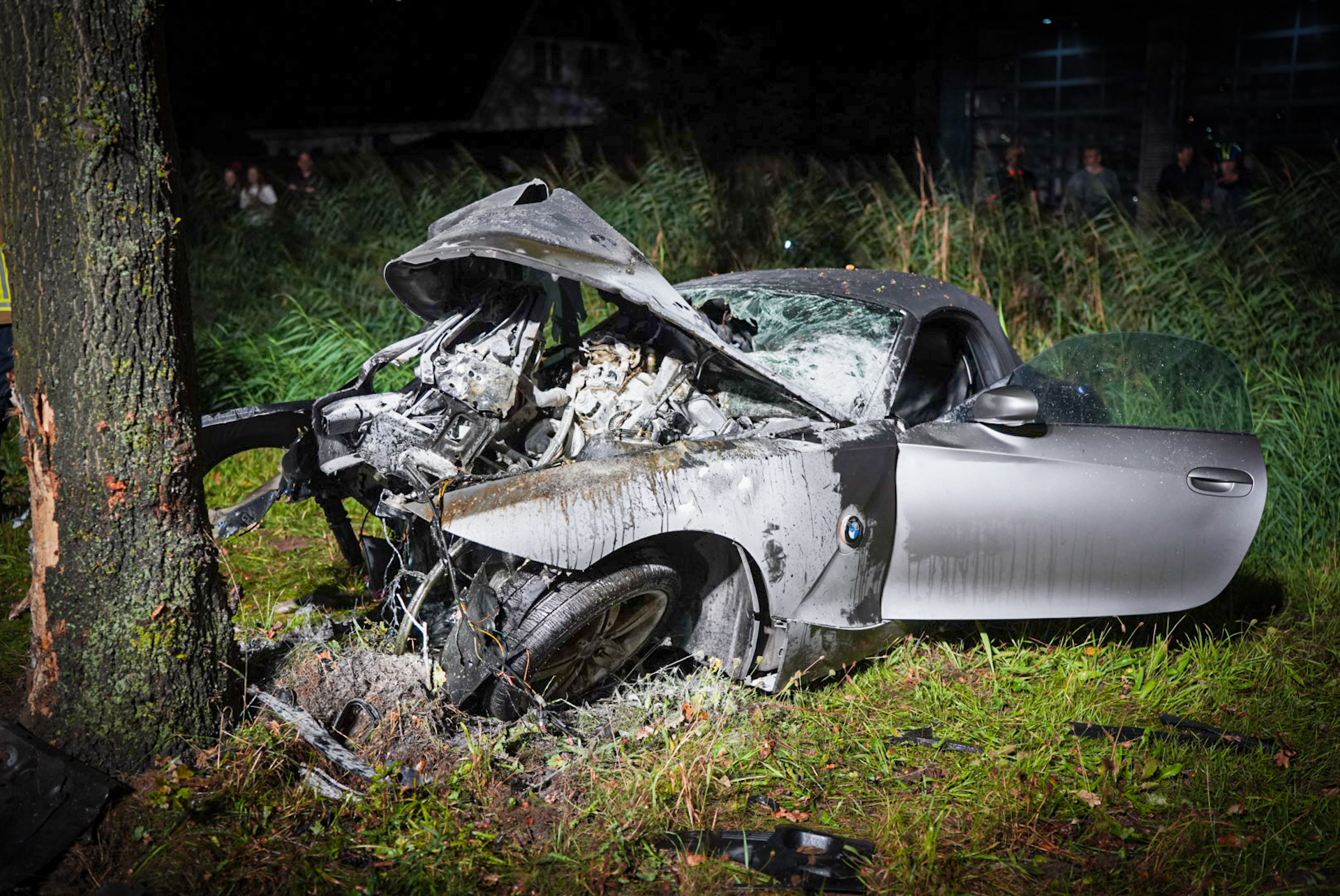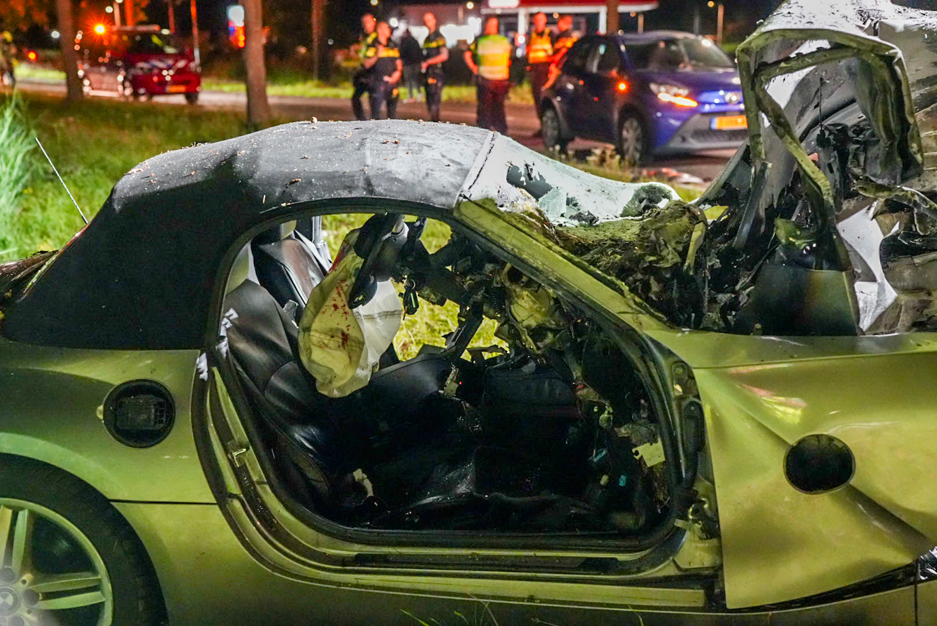 De auto raakte volledig verwoest. De weg werd tijdelijk afgesloten voor onderzoek. Een bergingsbedrijf heeft het wrak afgevoerd.