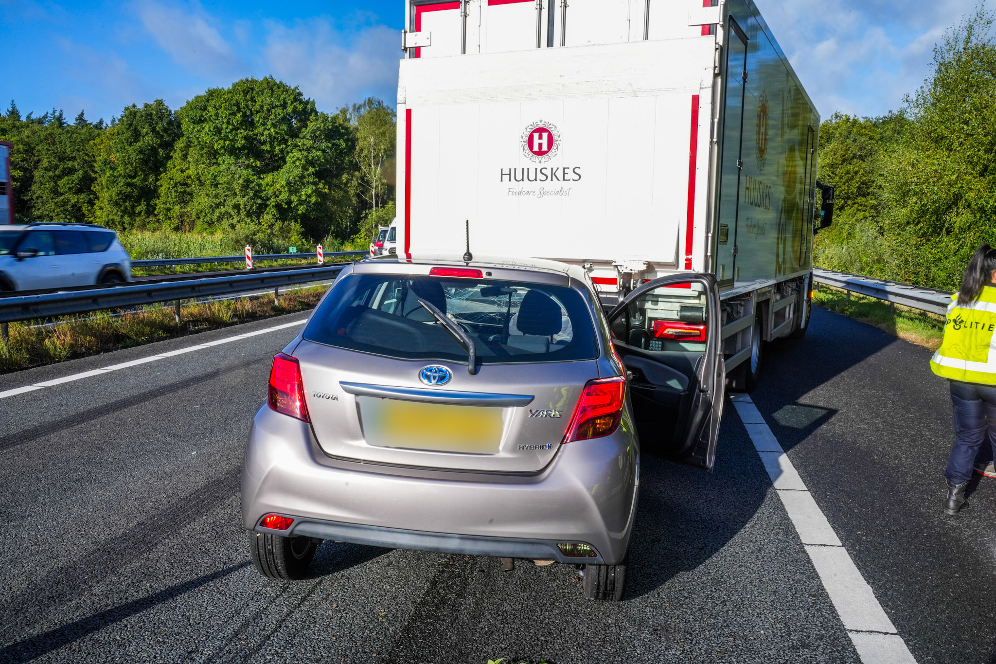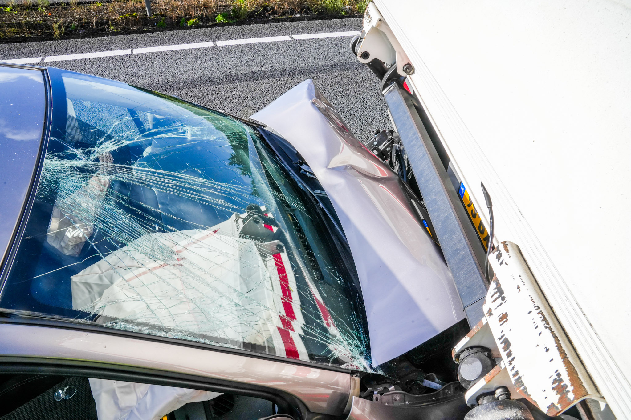 Auto belandt onder vrachtwagen op snelweg; rijstrook dicht en flinke vertraging