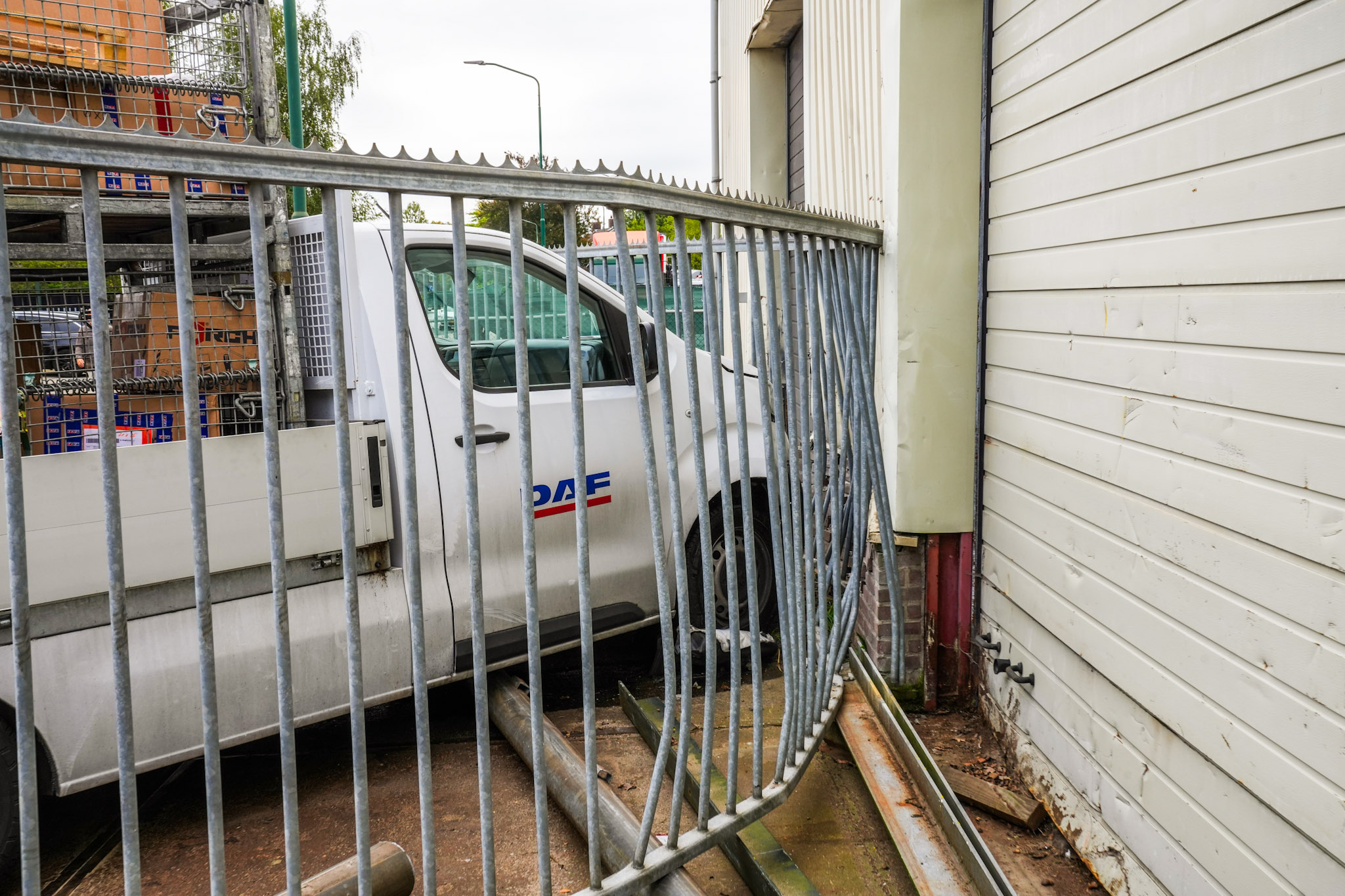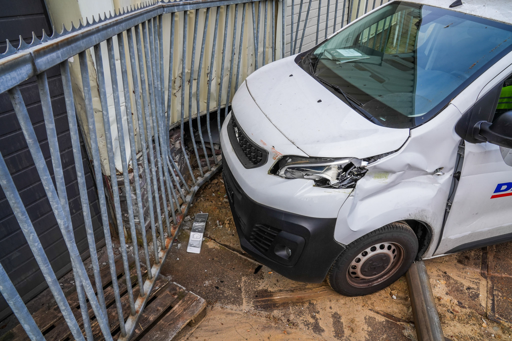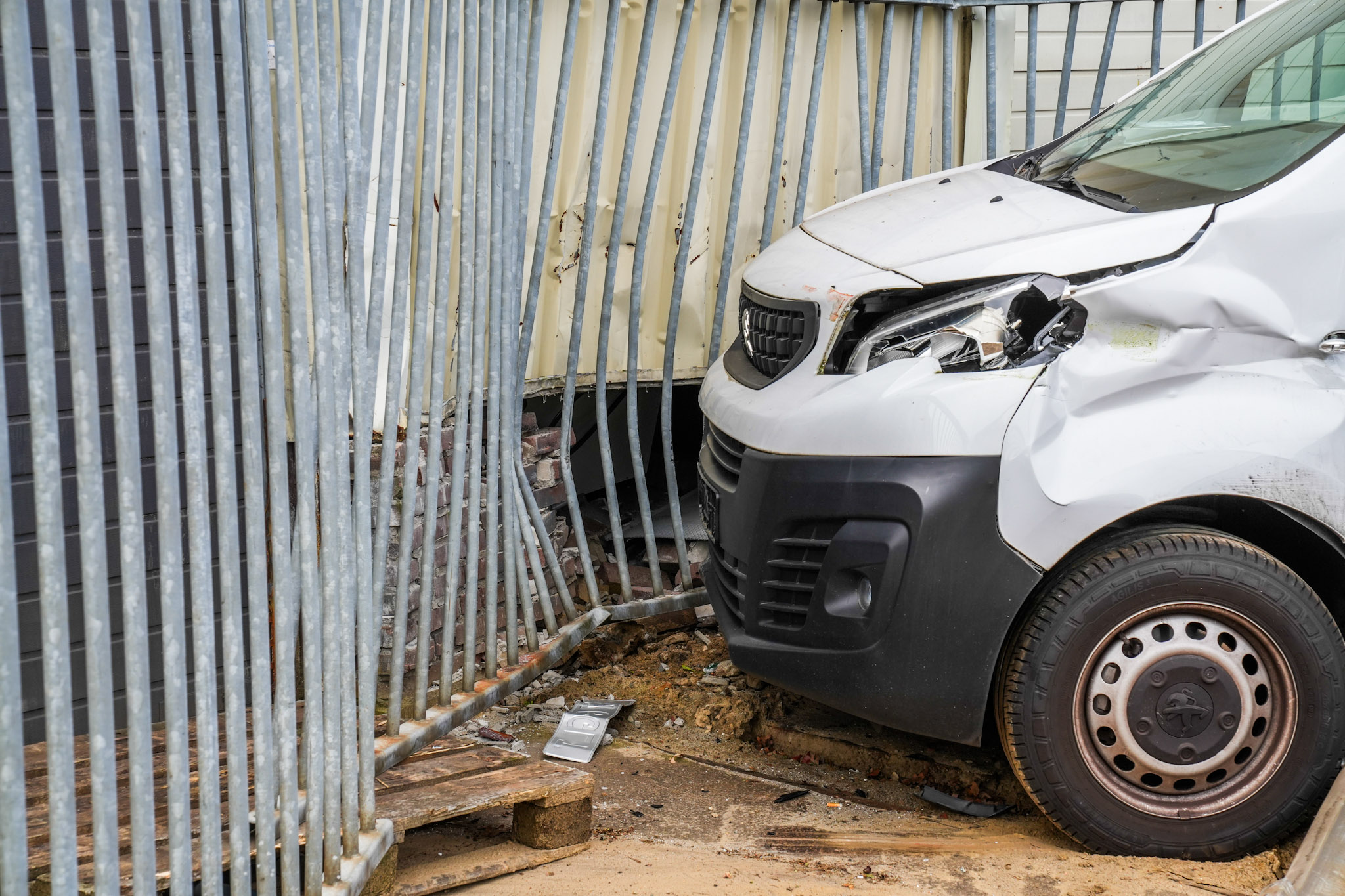 De bestuurder is behandeld aan zijn verwondingen. De auto en het hekwerk rondom het pand liepen aanzienlijke schade op.
