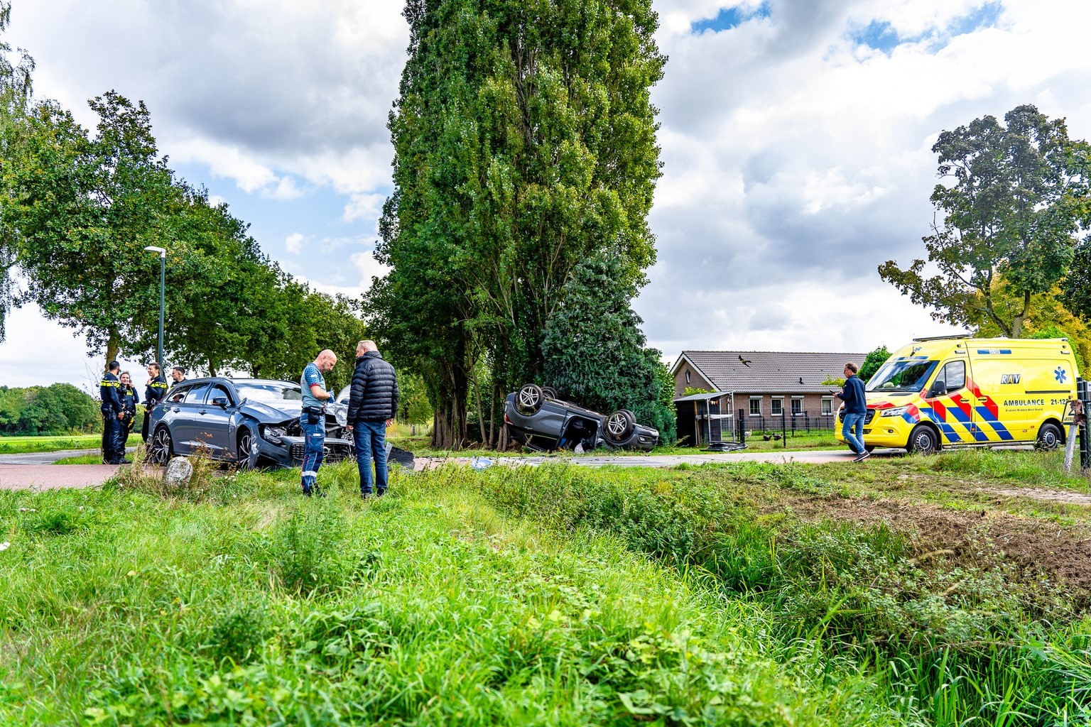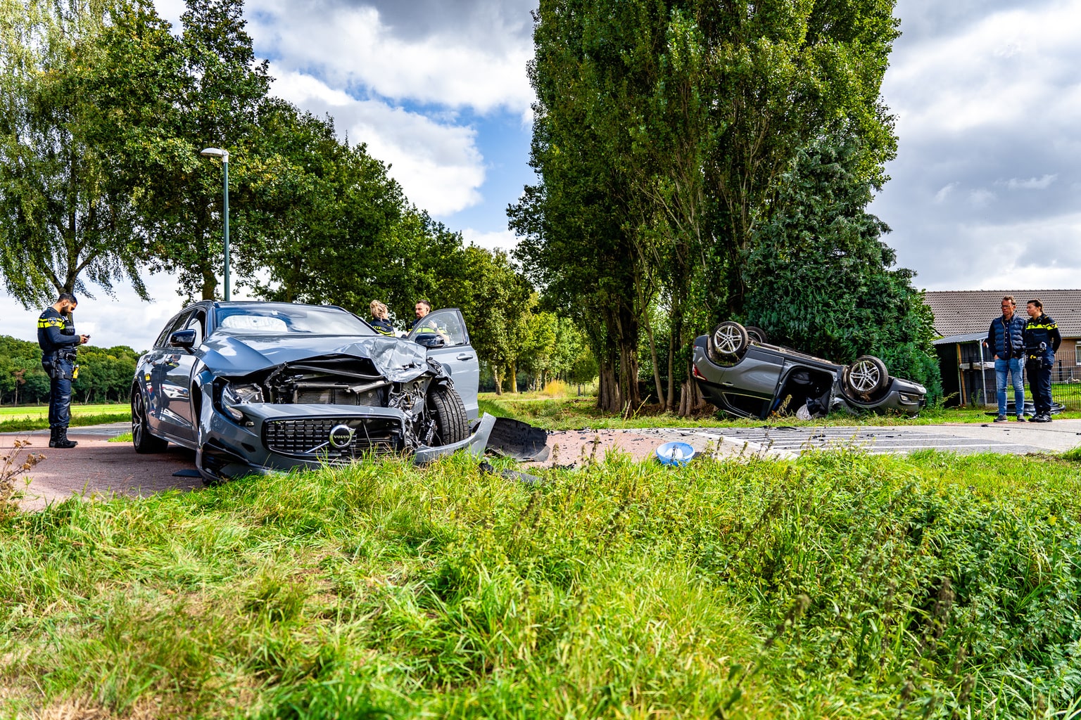 De melding kwam rond 12.25 uur binnen. Een auto die vanaf de Kampweg kwam, botste met een voertuig dat over de Leeghandseweg reed. Door de klap belandde het ene voertuig ondersteboven in een tuin, terwijl het andere voertuig met flinke schade tot stilstand kwam naast een sloot.
