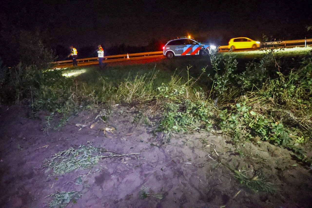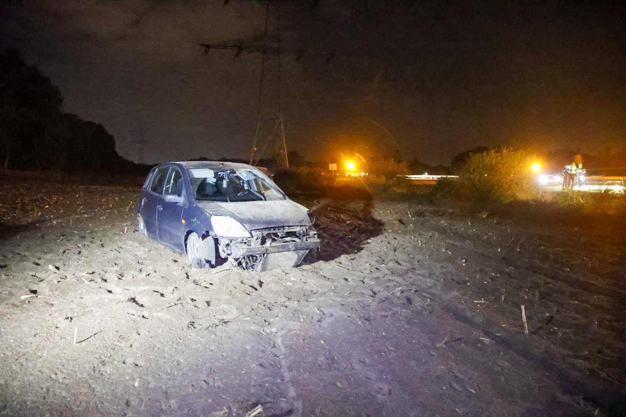 Auto crasht in weiland naast snelweg, bestuurder mogelijk onder invloed