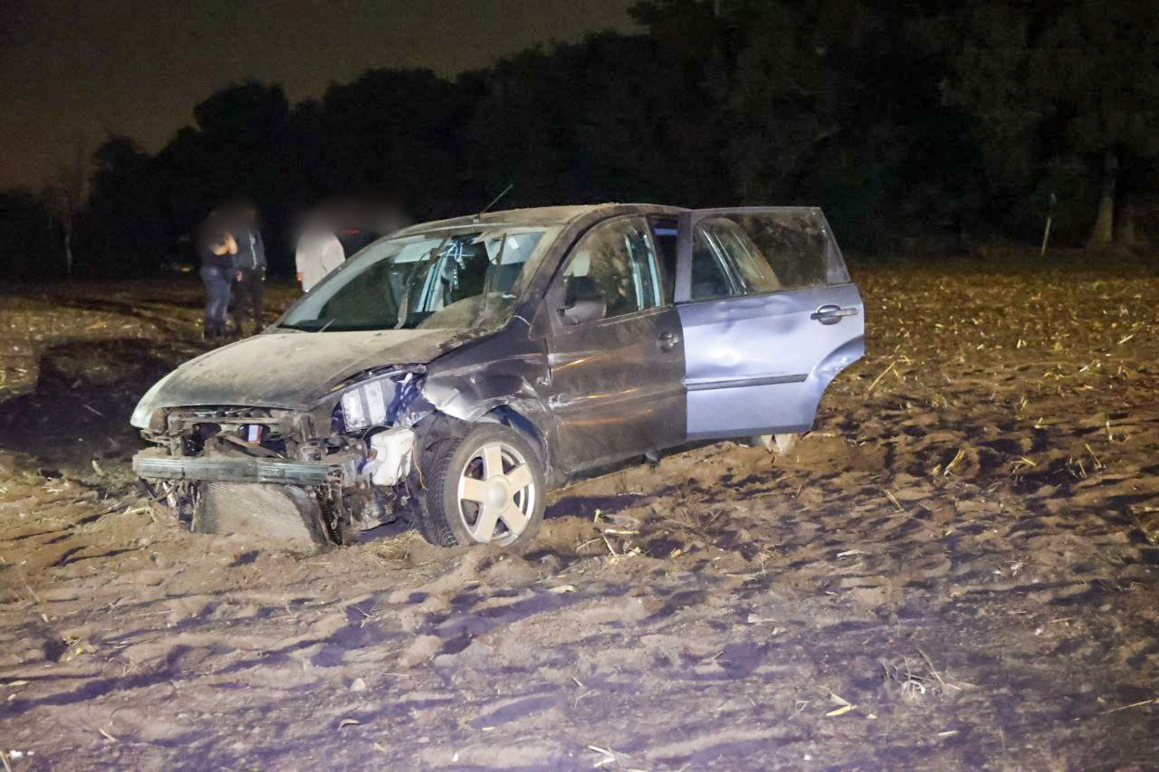 Auto crasht in weiland naast snelweg, bestuurder mogelijk onder invloed