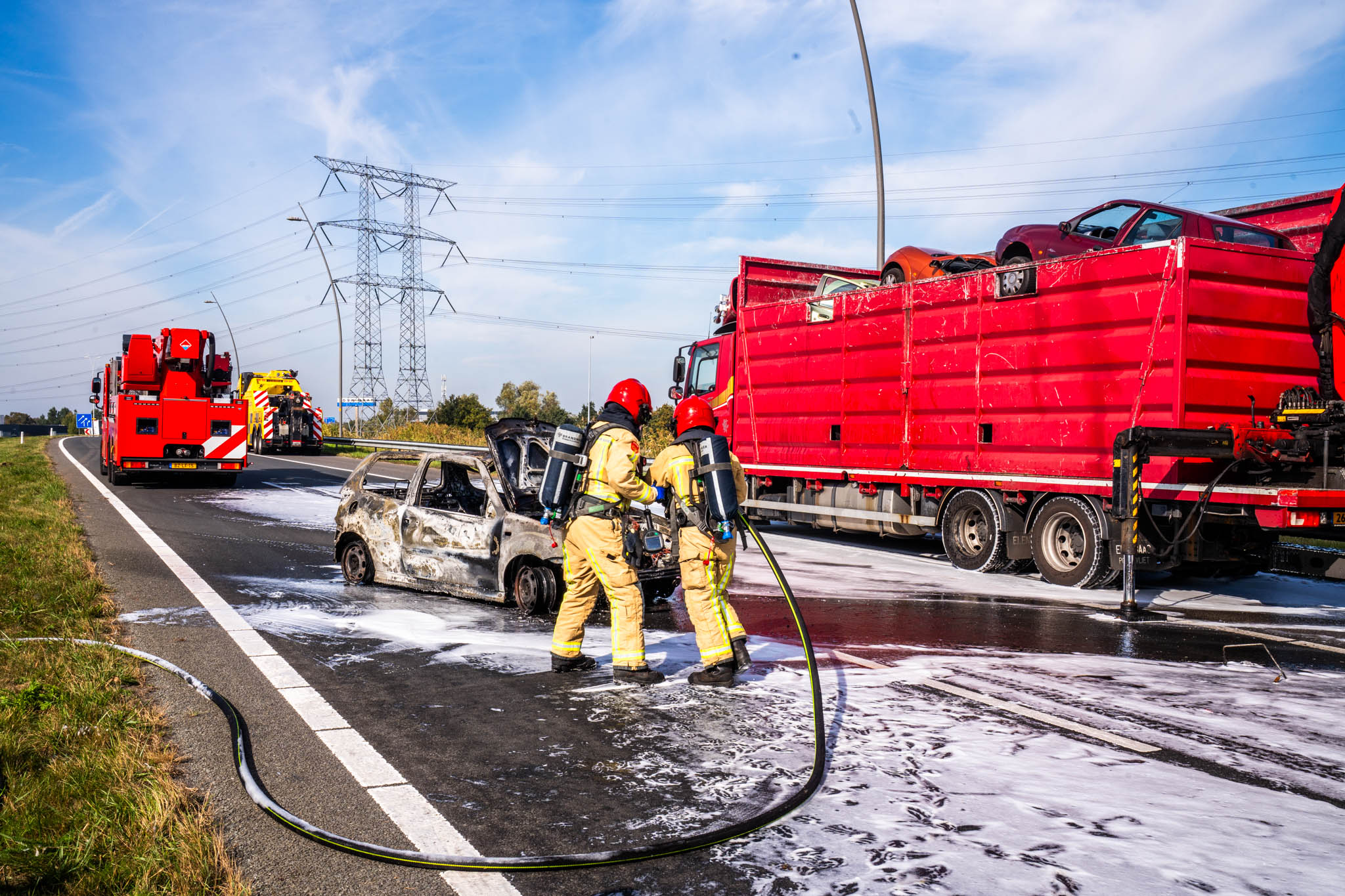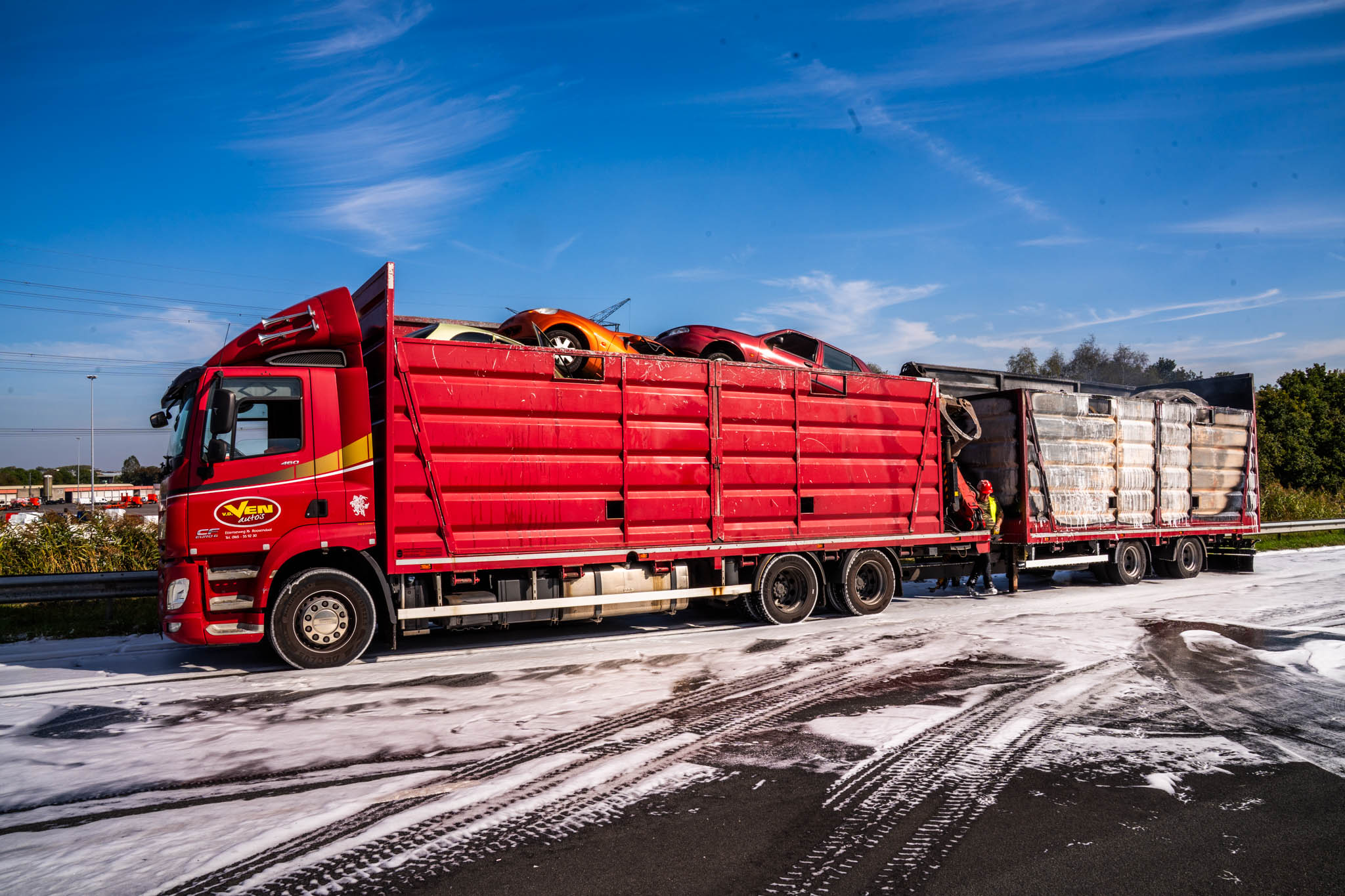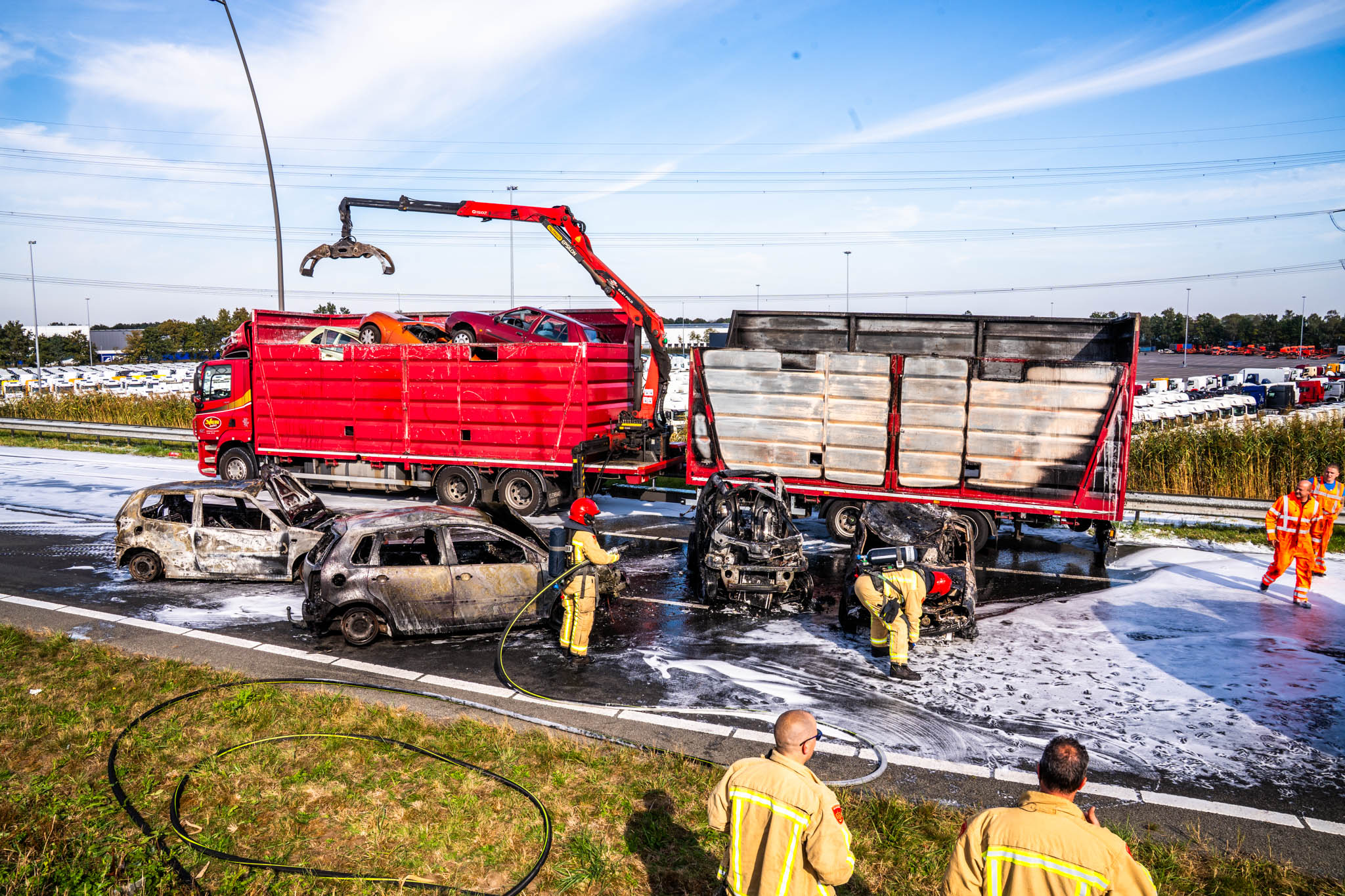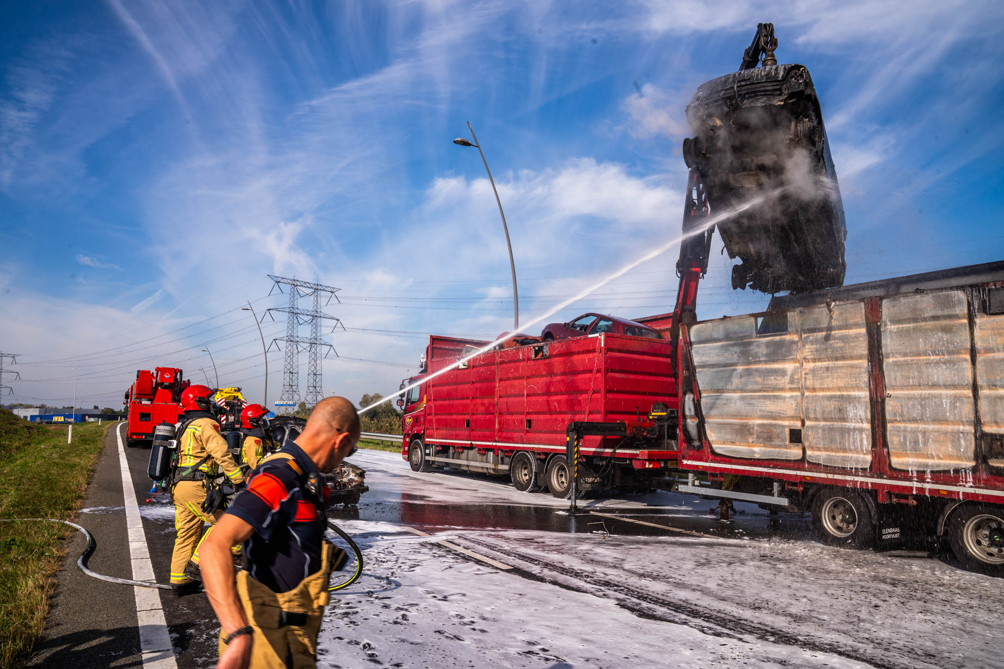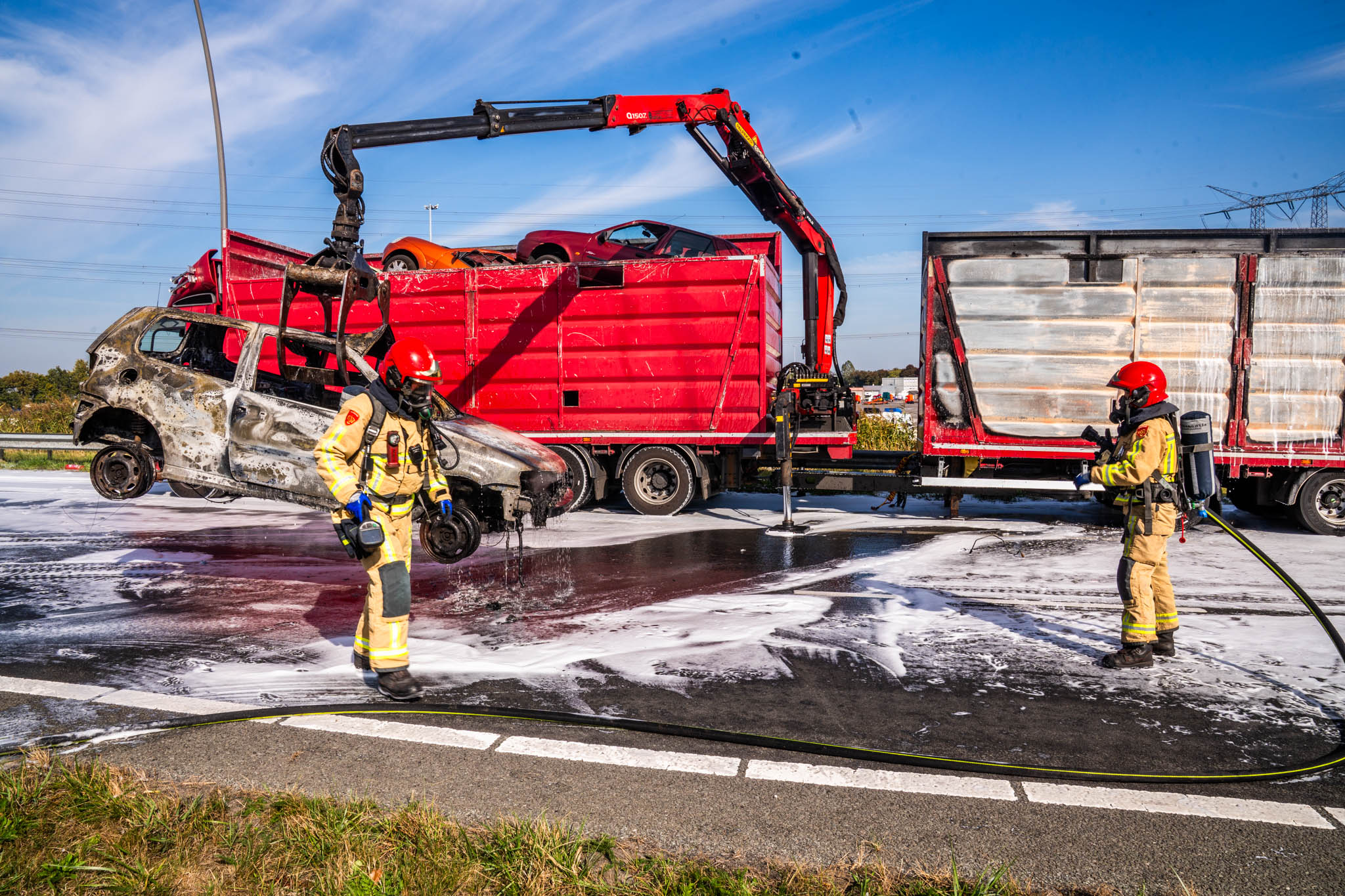 Snelweg dicht nadat vrachtwagen met sloopauto’s in brand vliegt