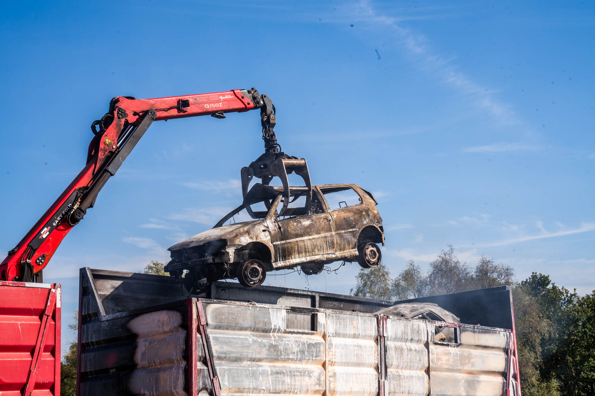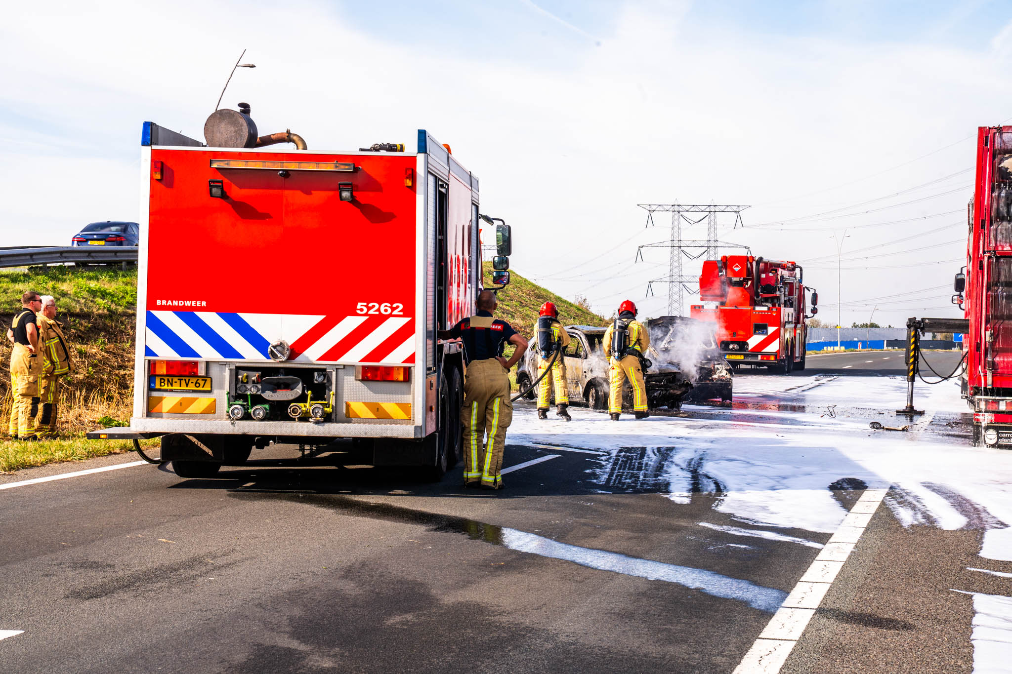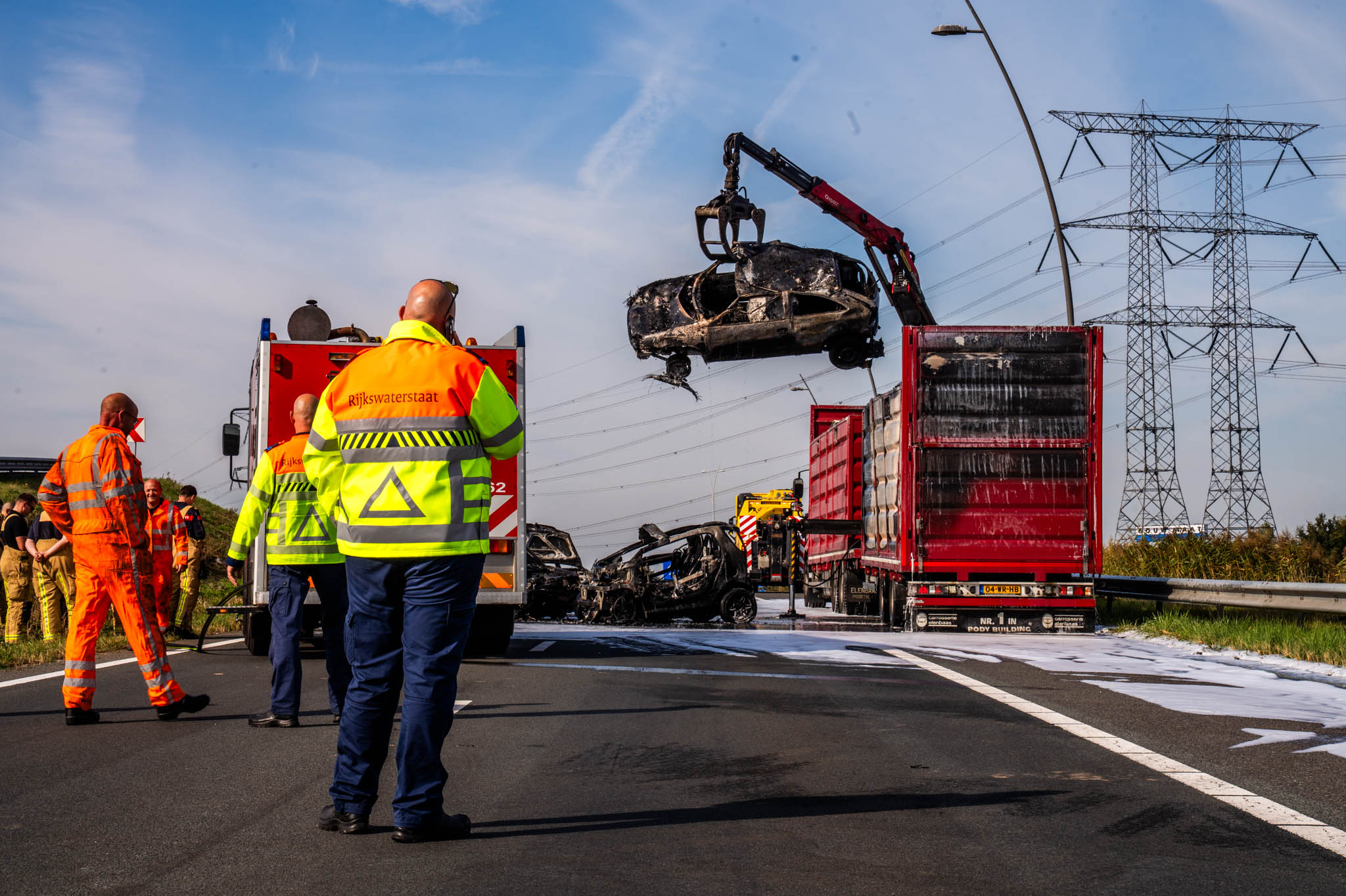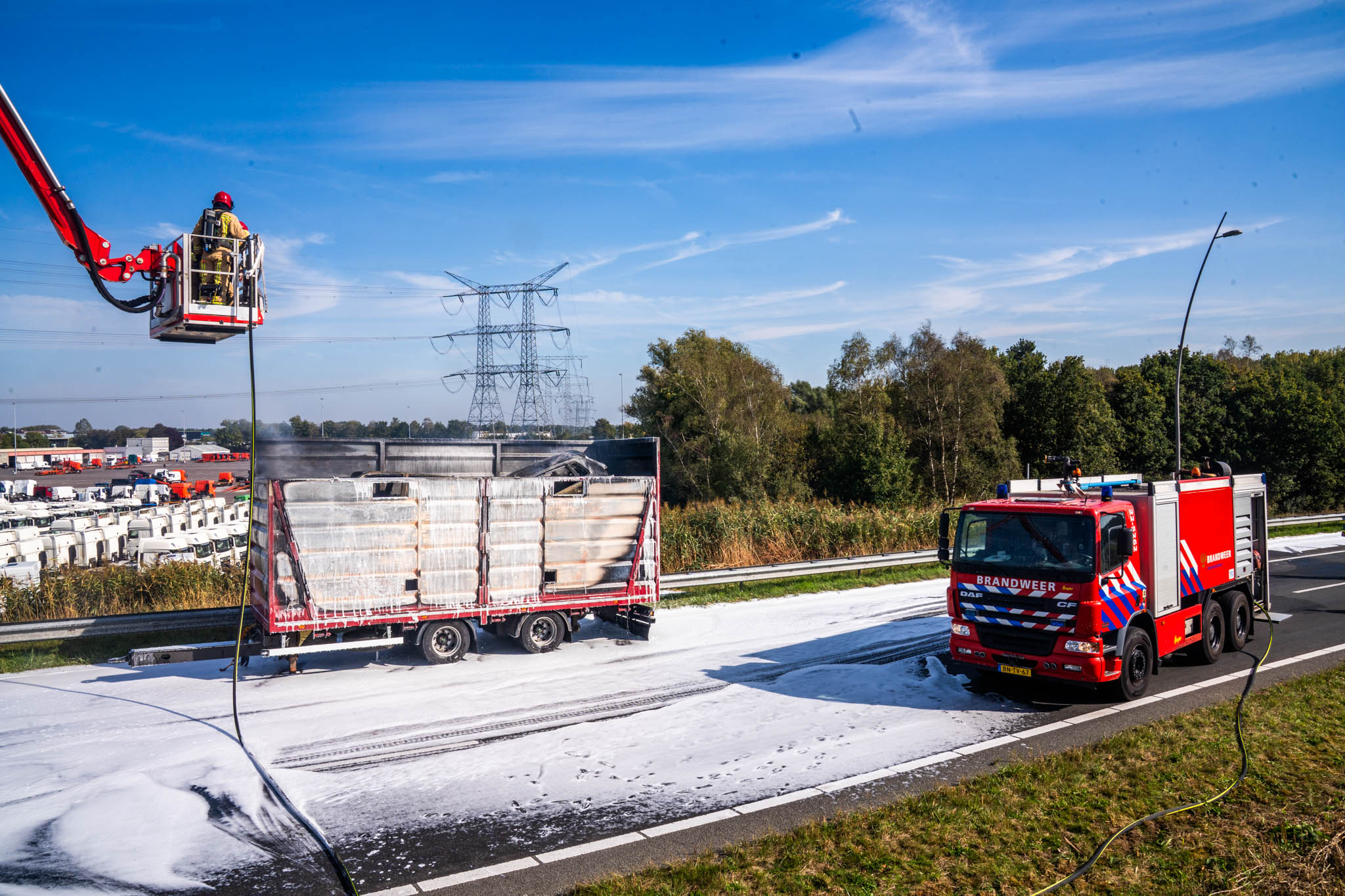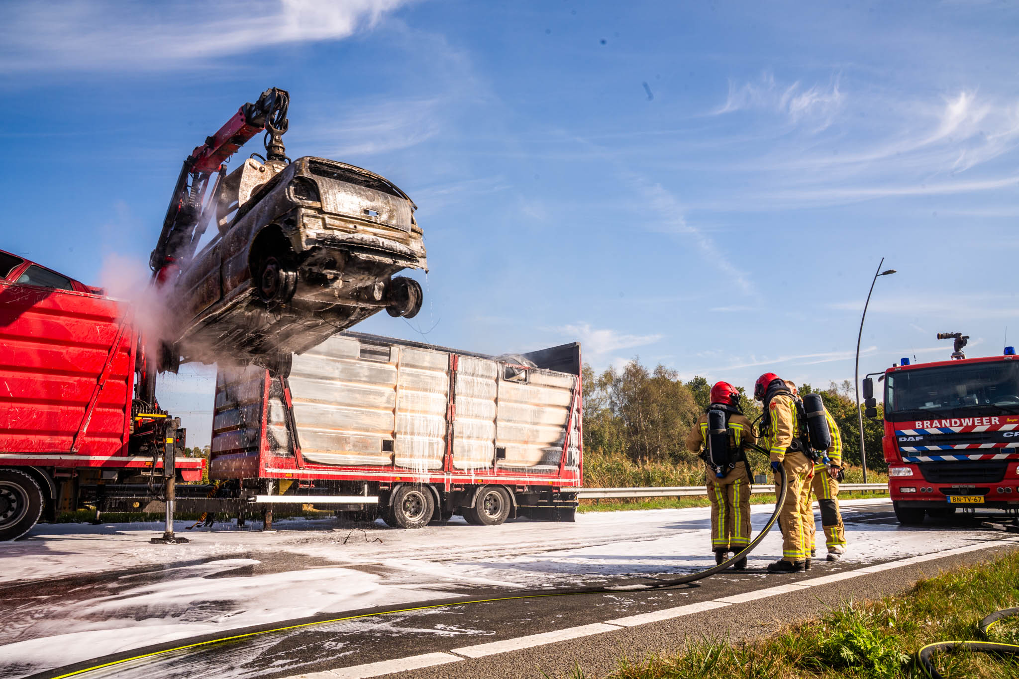 Snelweg dicht nadat vrachtwagen met sloopauto’s in brand vliegt