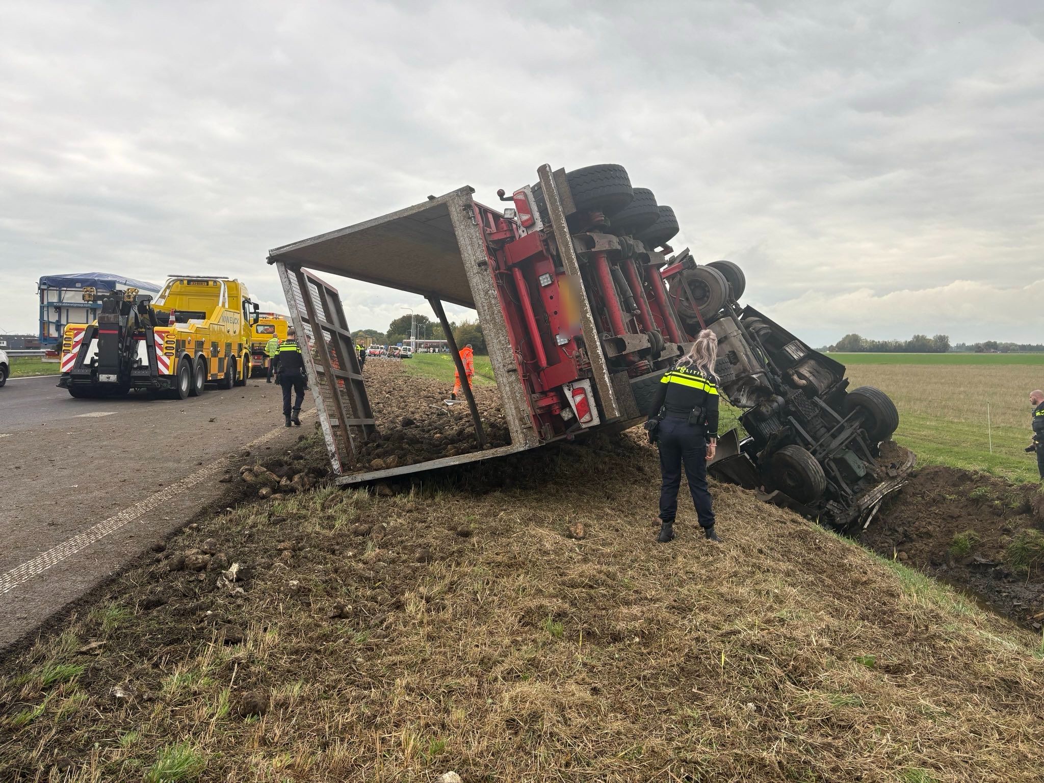 Vrachtwagen met suikerbieten kantelt op snelweg, deel van weg afgesloten