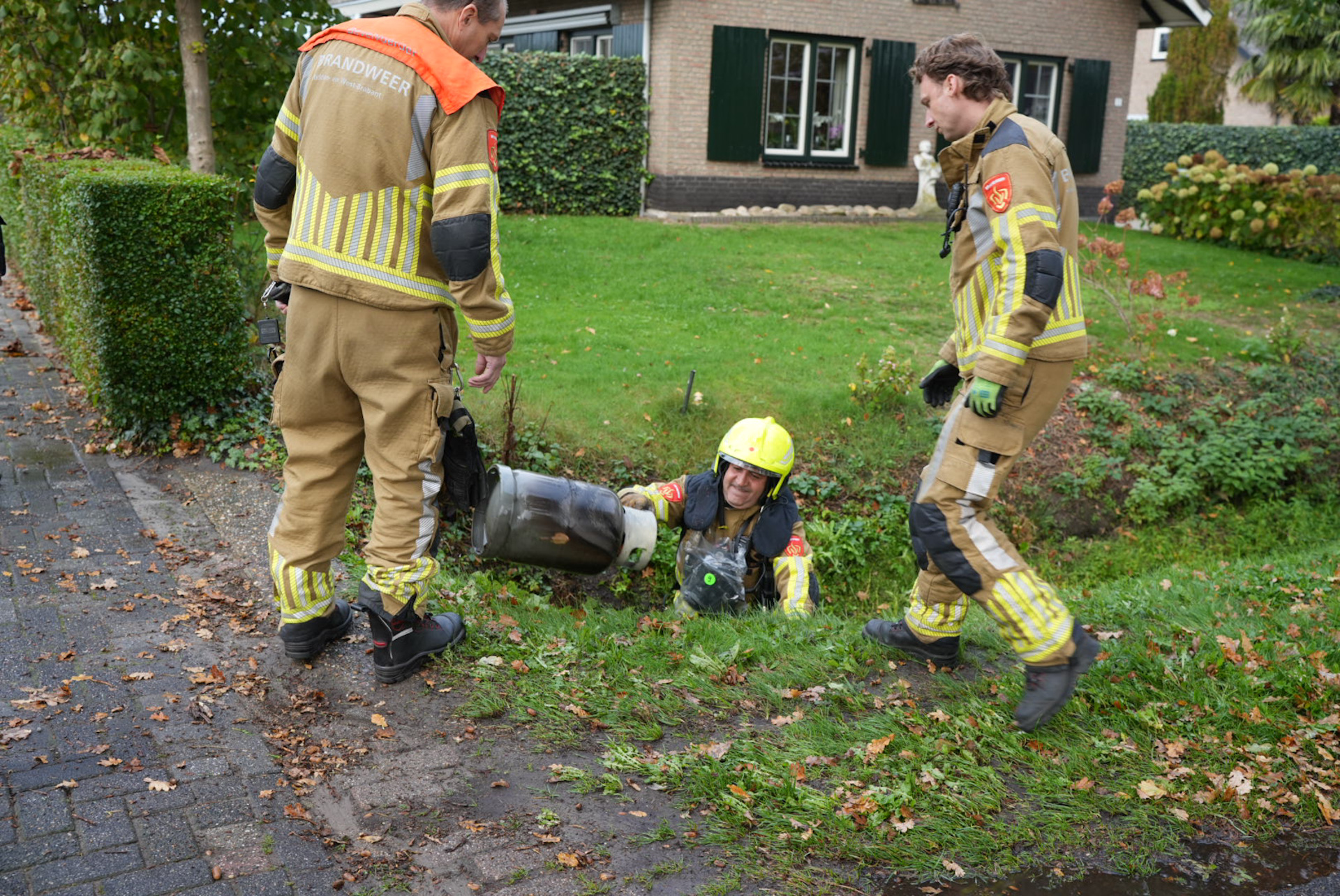 Omdat de gasfles bleef lekken, is deze uit de sloot gehaald en in een weiland achter de woning geplaatst om daar gecontroleerd leeg te lopen. De situatie was daarna onder controle en er was geen direct gevaar meer.