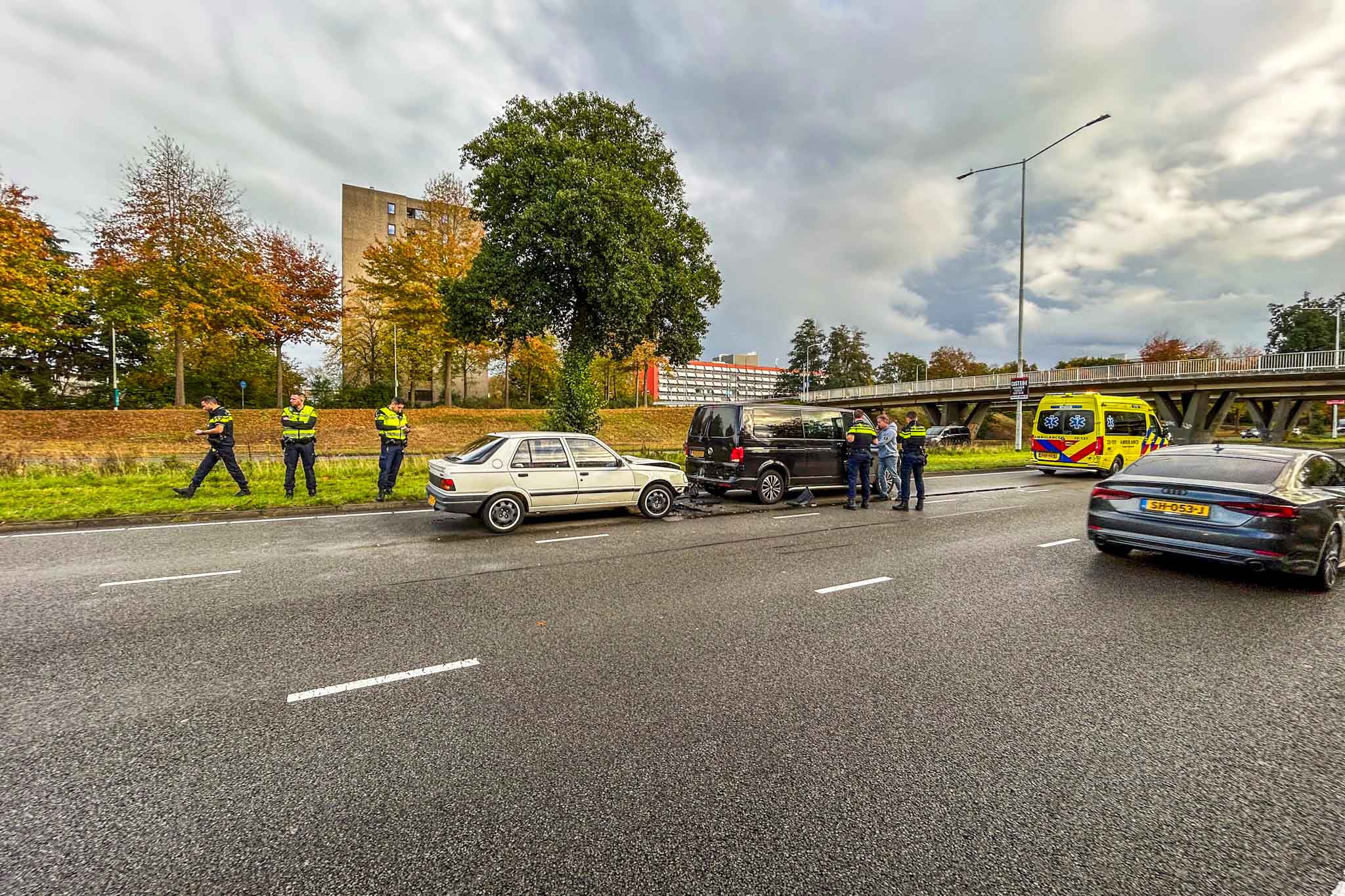 Volgens een fotograaf ter plaatse is een oudere Peugeot achterop een bestelauto gereden. Beide voertuigen liepen schade op door de botsing.