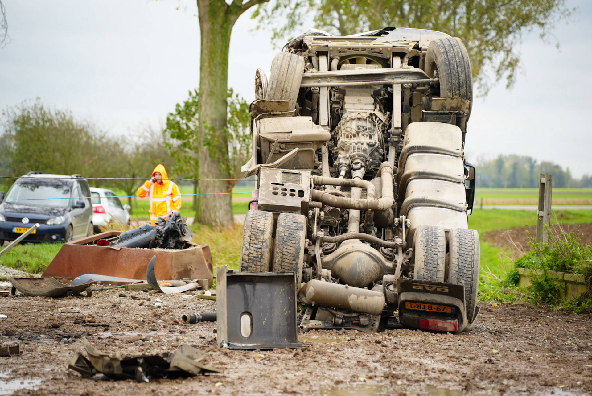 Vrachtwagen met tarwe kantelt, chauffeur naar ziekenhuis vervoerd